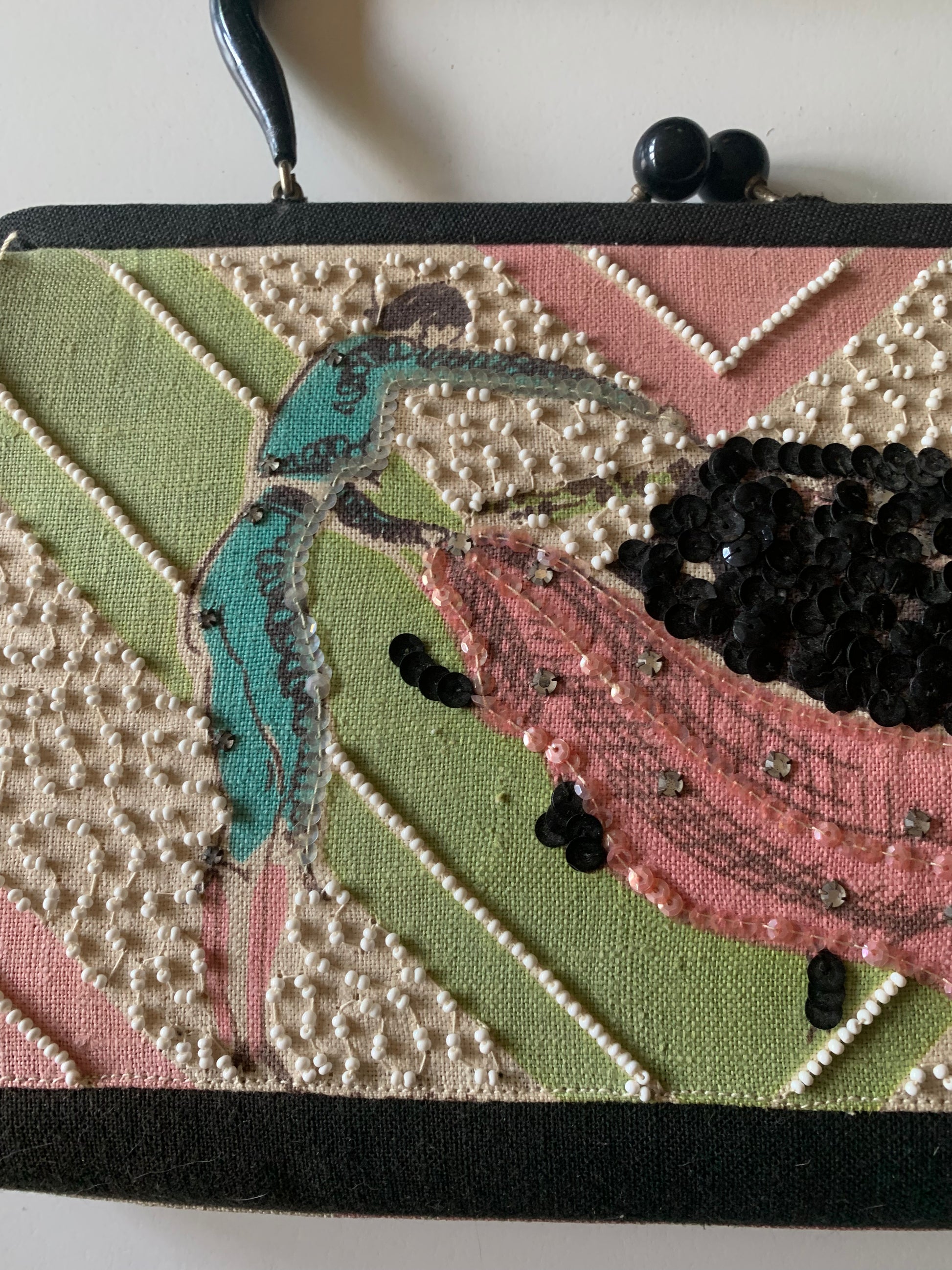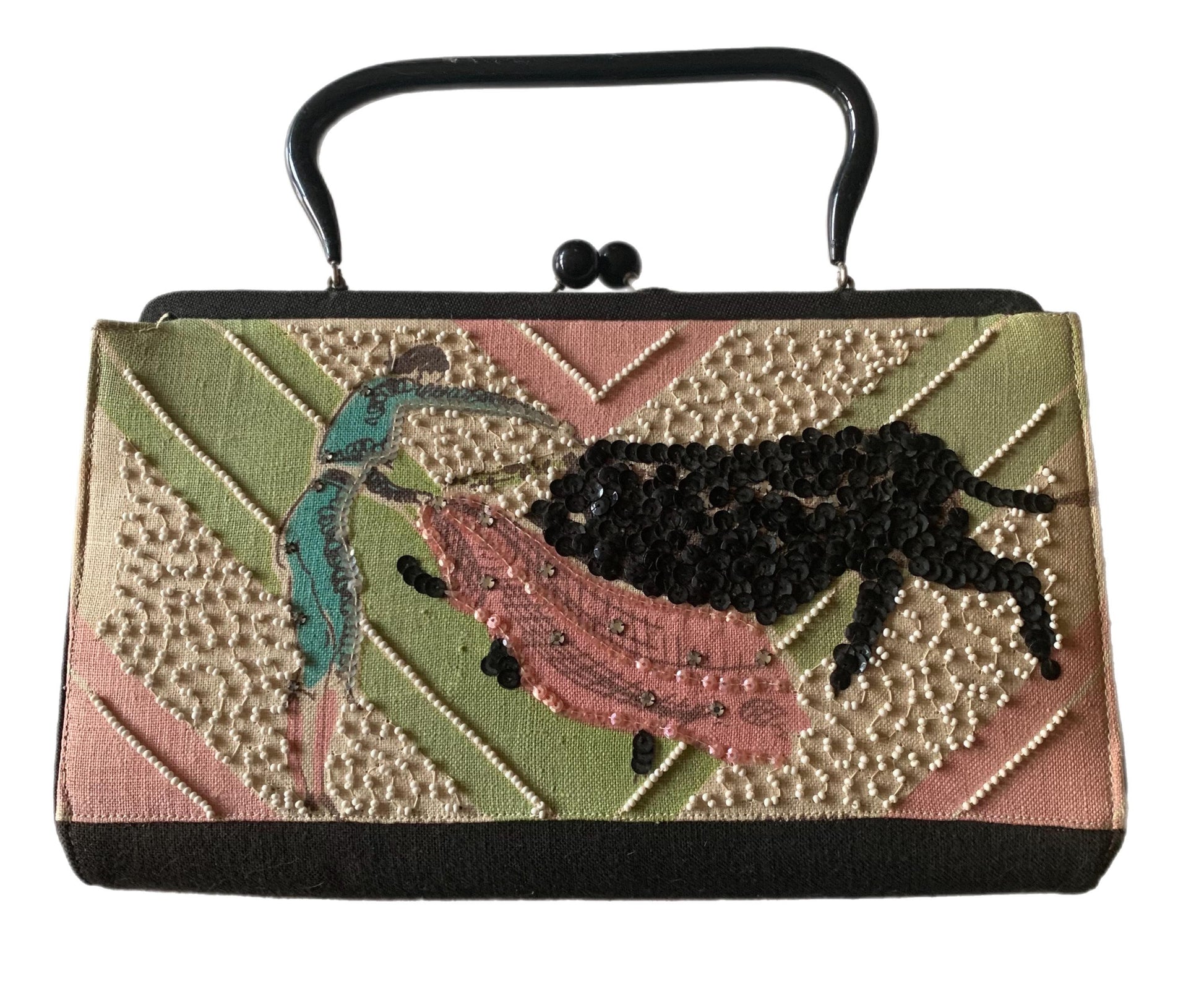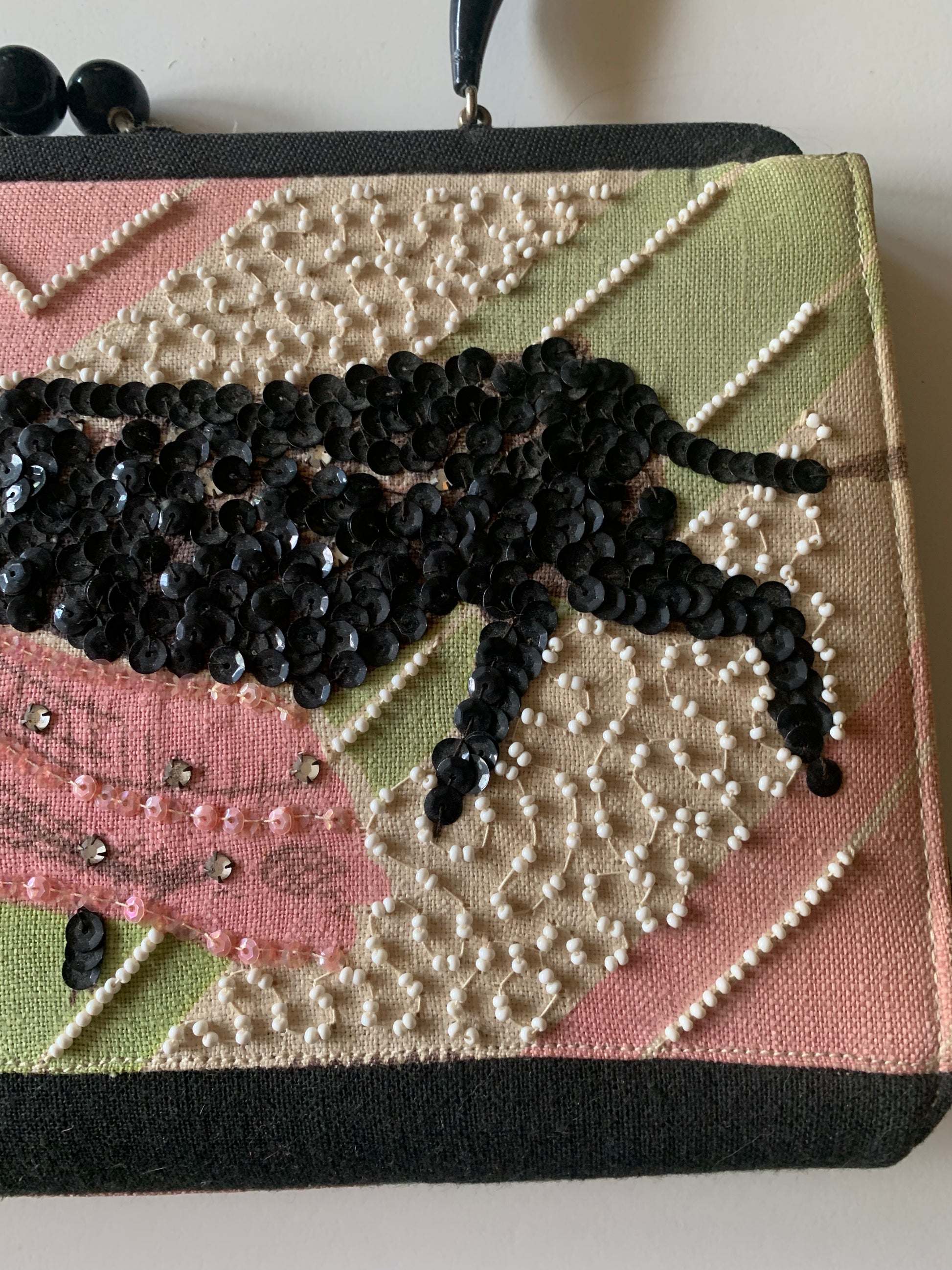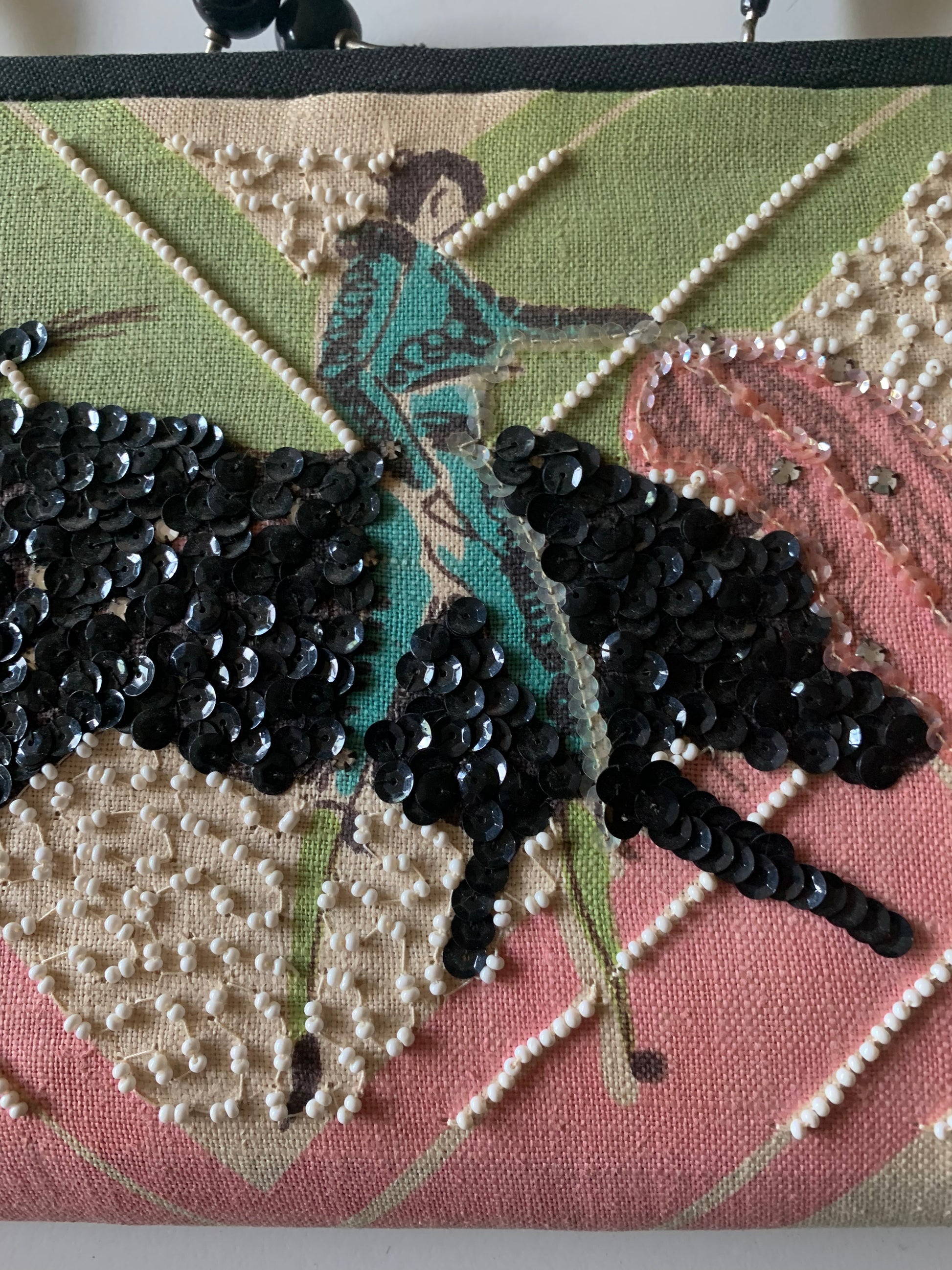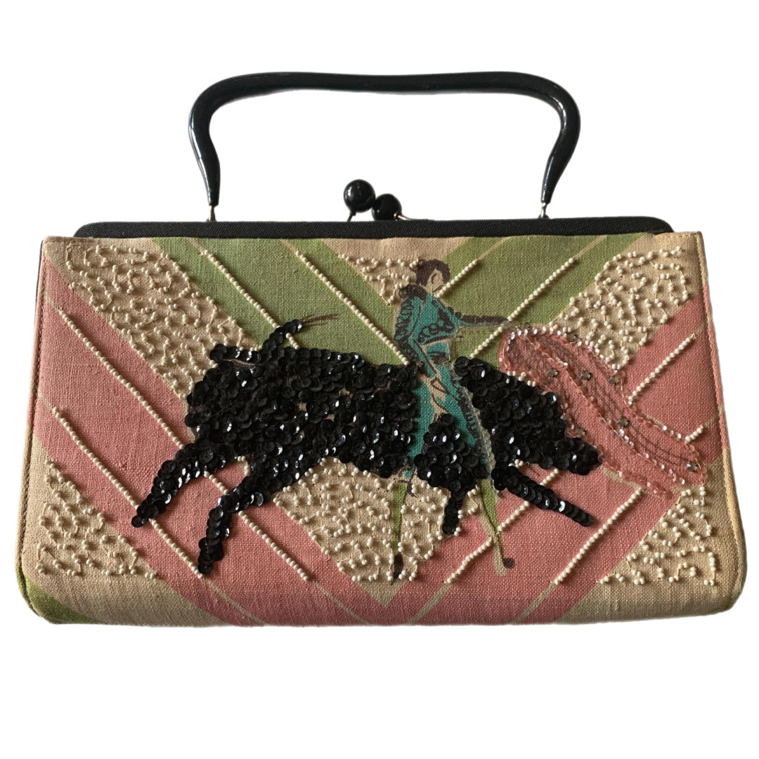 Super rare 1956 Souré "tea towel" fabric covered vinyl handbag with pink, green and black fabric boasting a sequined and beaded bullfighting motif. Black plastic handle and clasp. Off white faille rayon lining with pocket, small mark inside- appears unused. A little dusty from sitting for years.