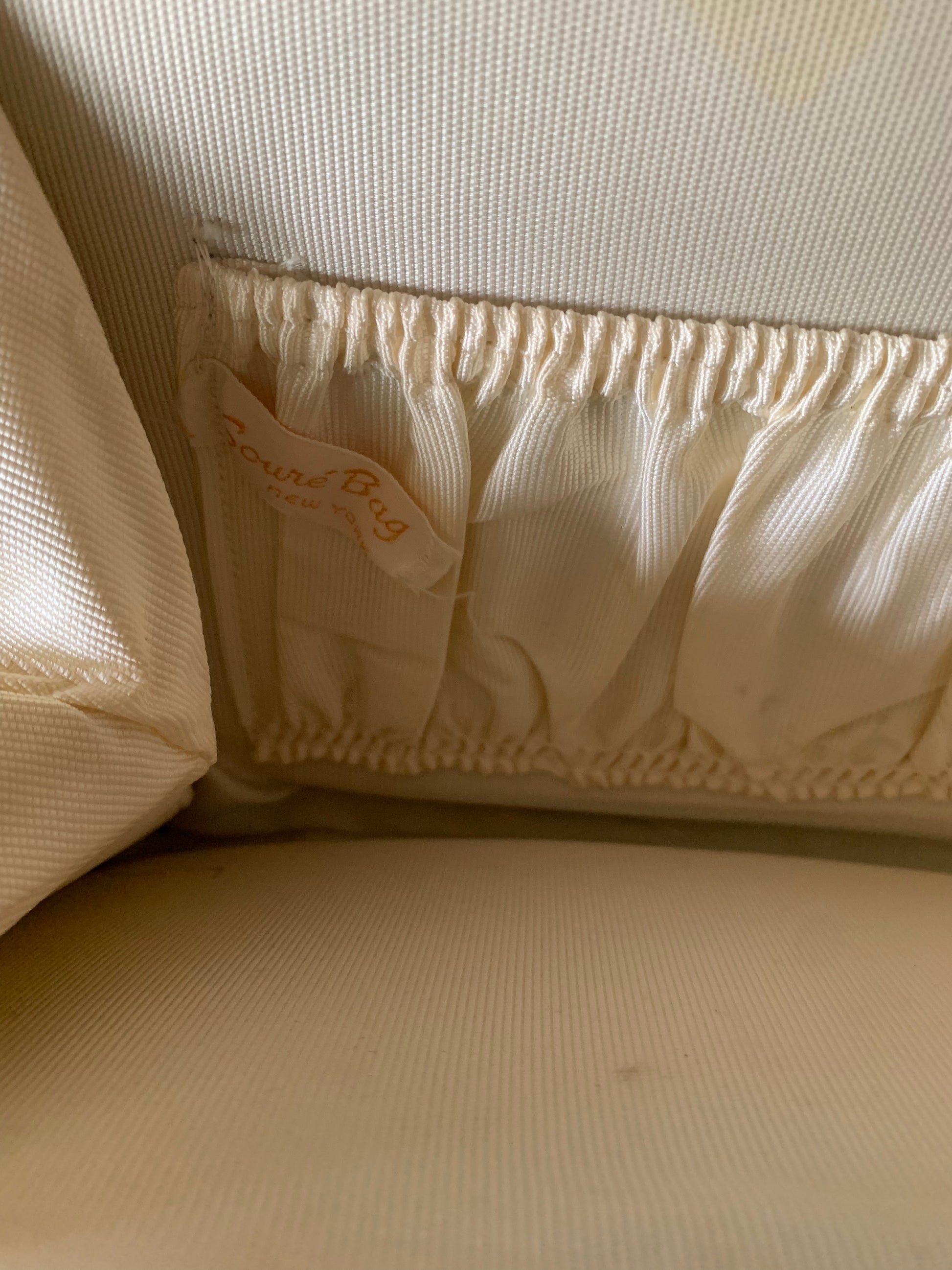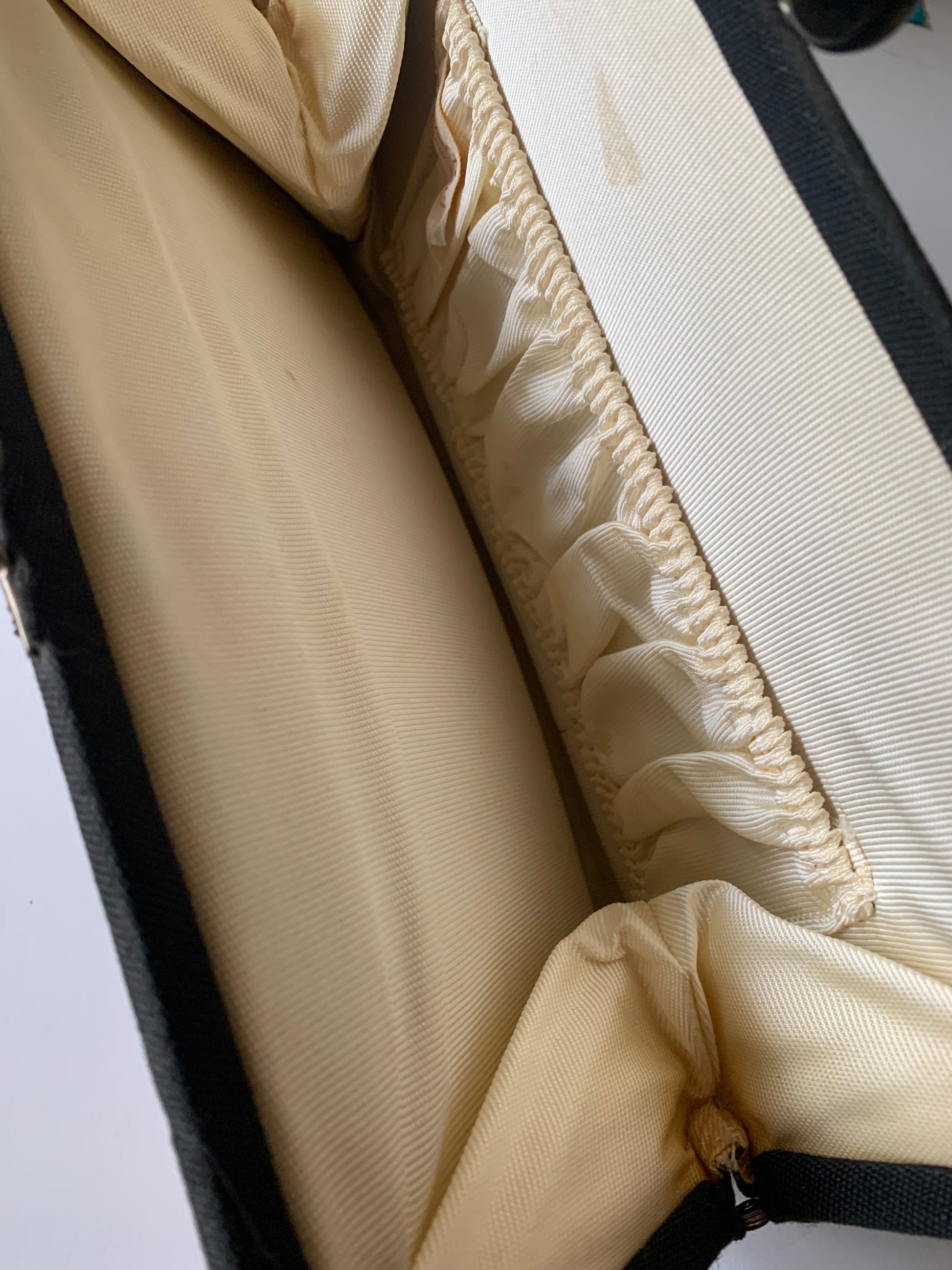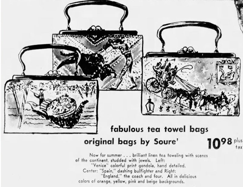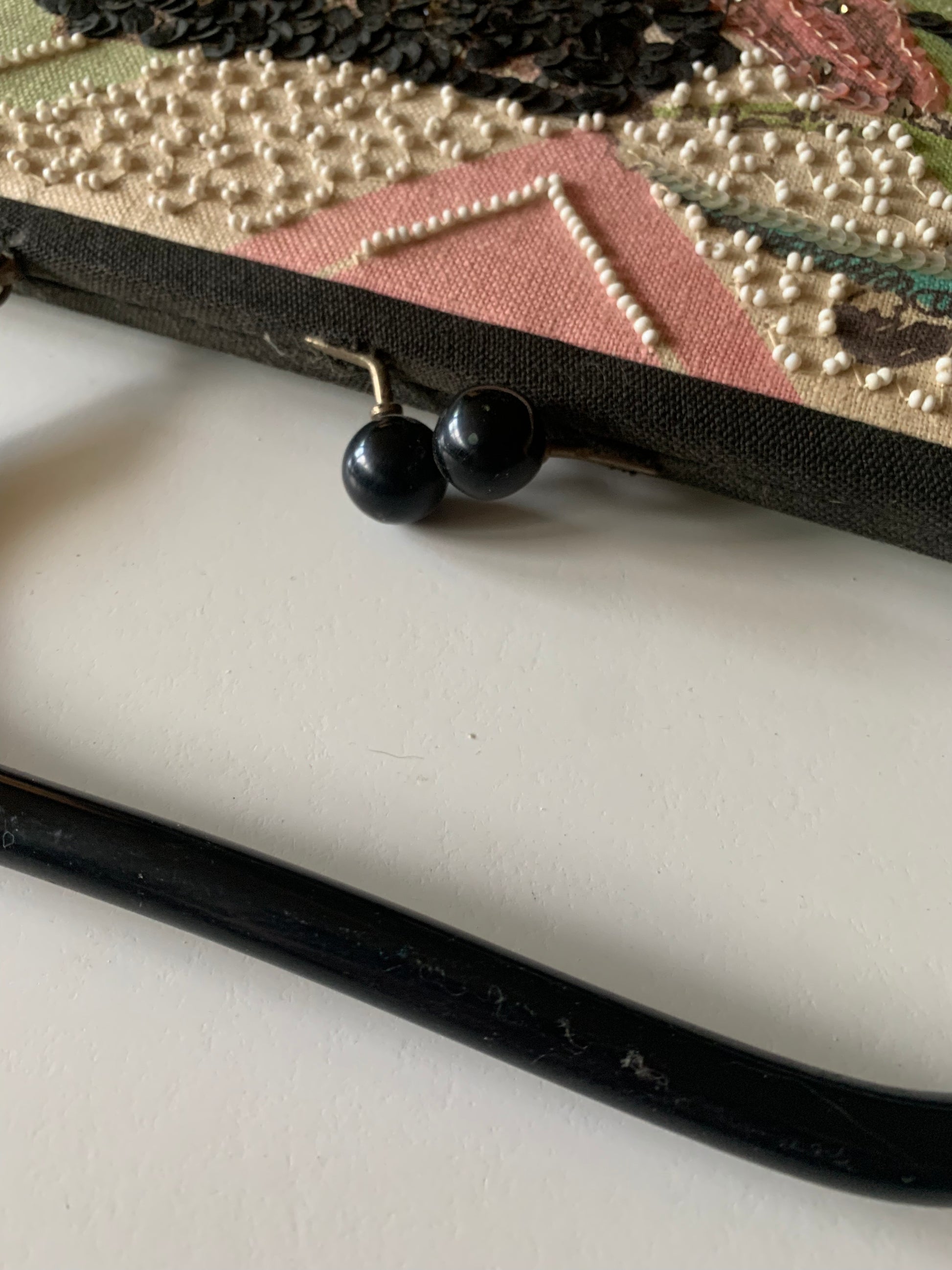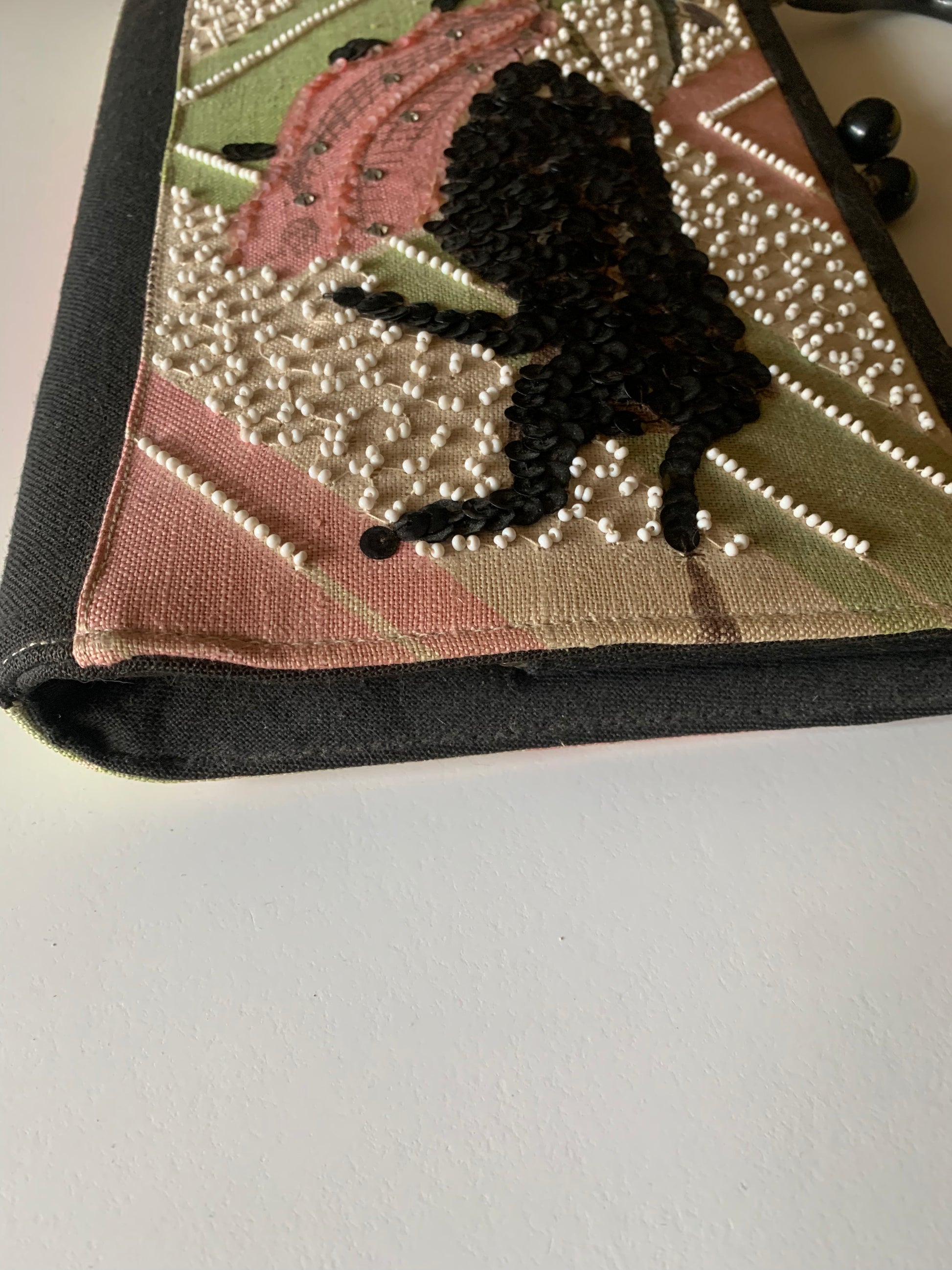 Super rare 1956 Souré "tea towel" fabric covered vinyl handbag with pink, green and black fabric boasting a sequined and beaded bullfighting motif. Black plastic handle and clasp. Off white faille rayon lining with pocket, small mark inside- appears unused. A little dusty from sitting for years.