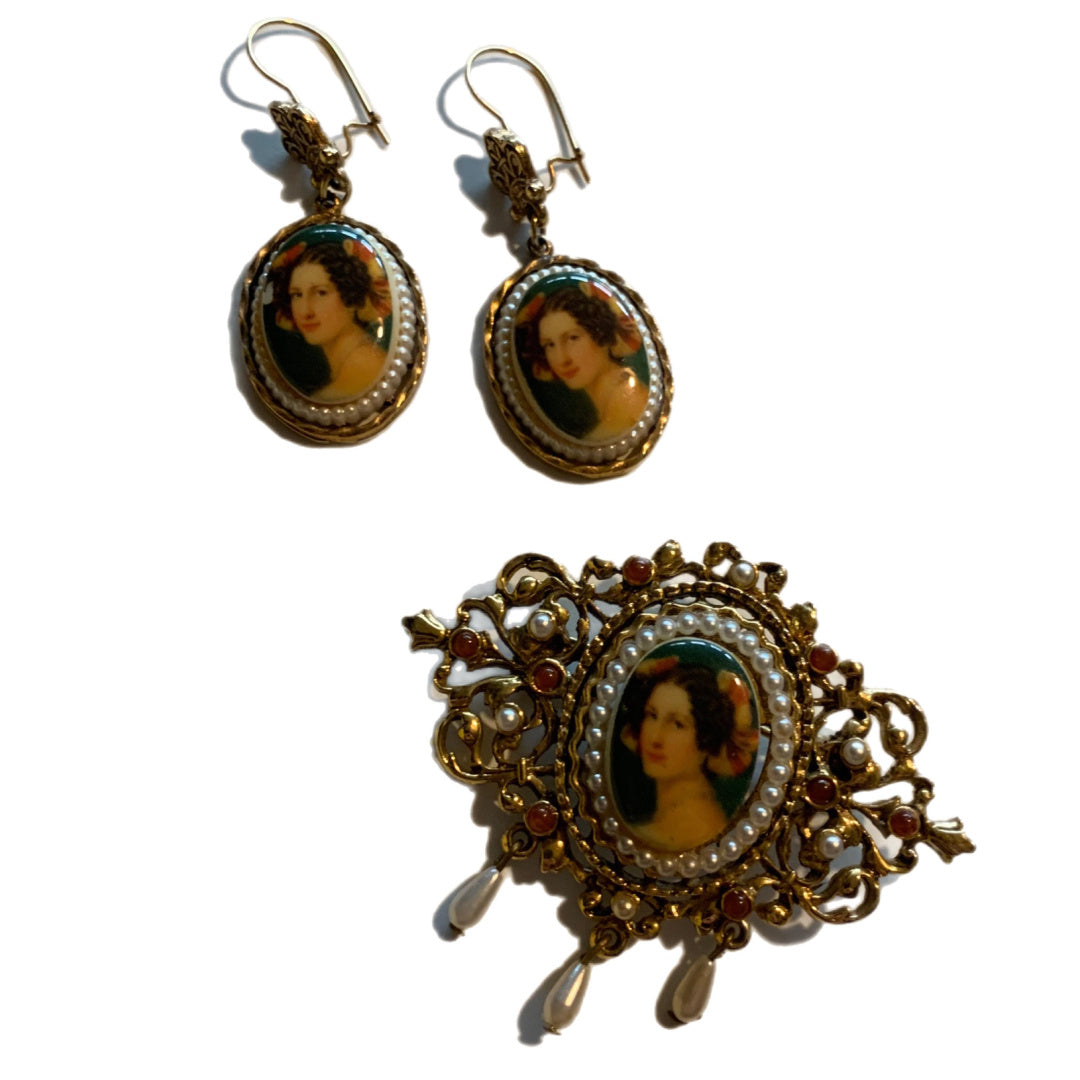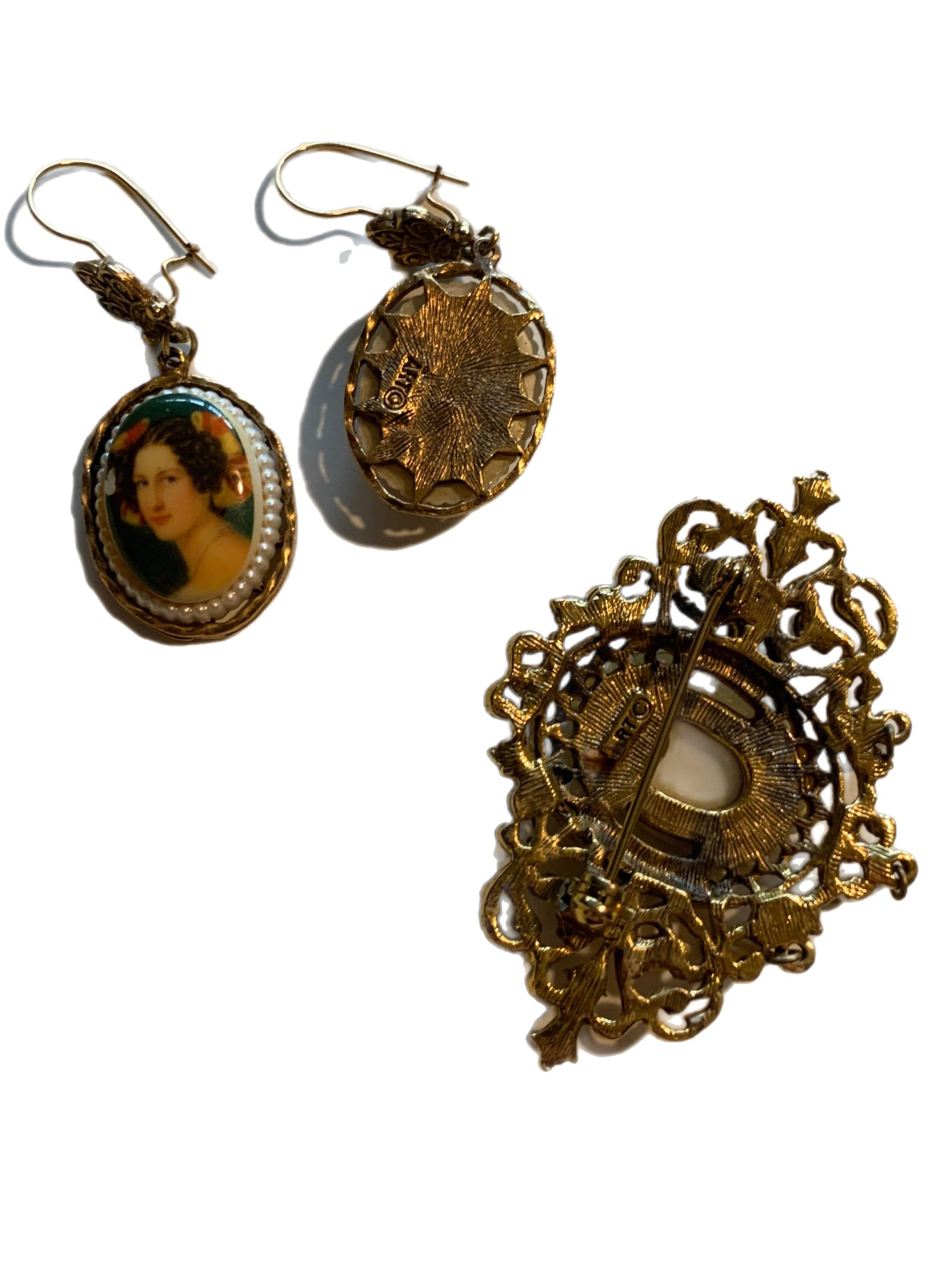 French hook pierced earrings and brooch with Auguste Strobl portrait painting, faux pearls and carnelian cabs. Brooch 2 1/4" wide by 2", earrings 2" long. No flaws, marked ART.