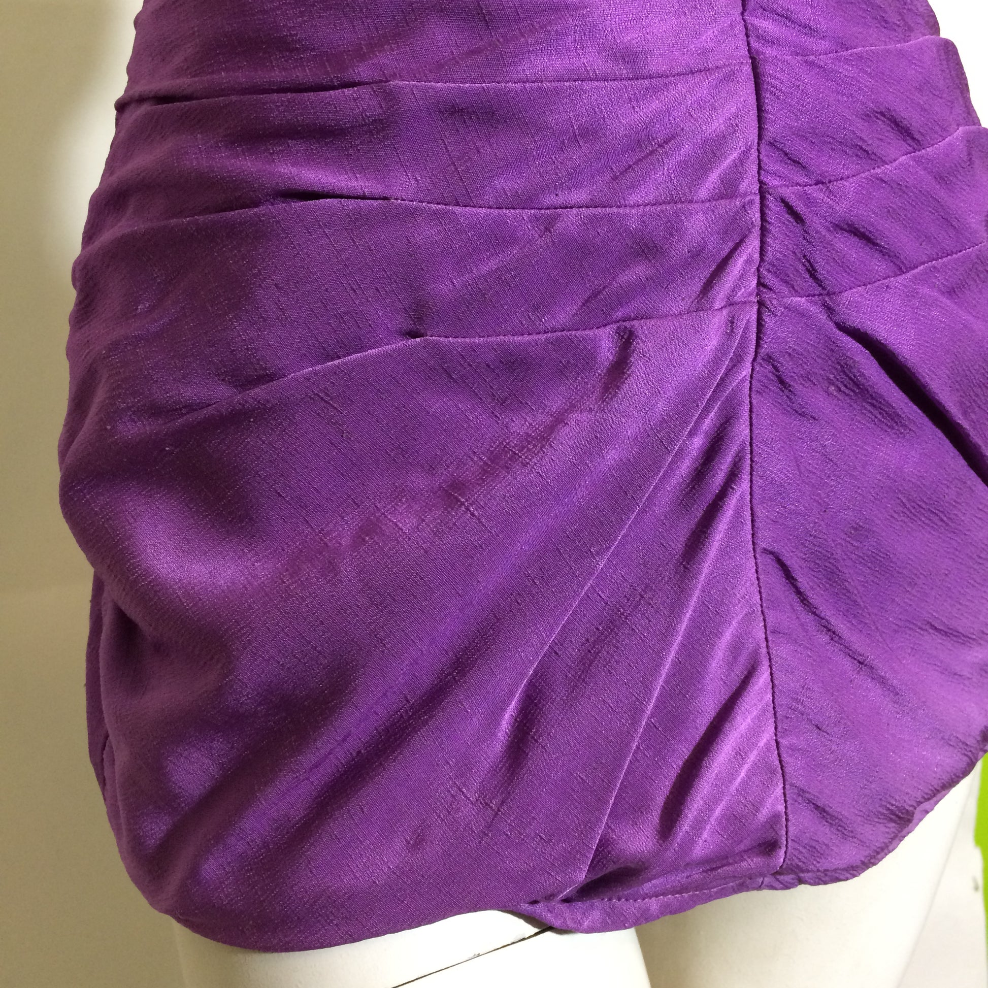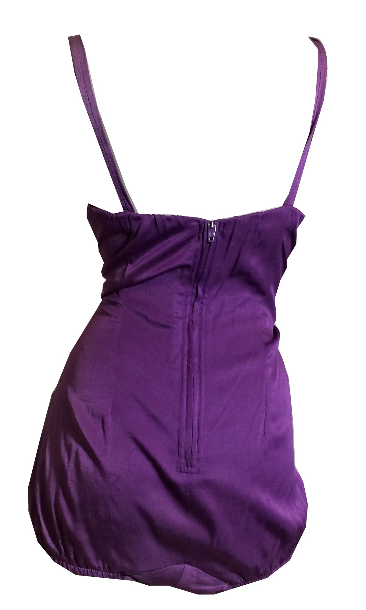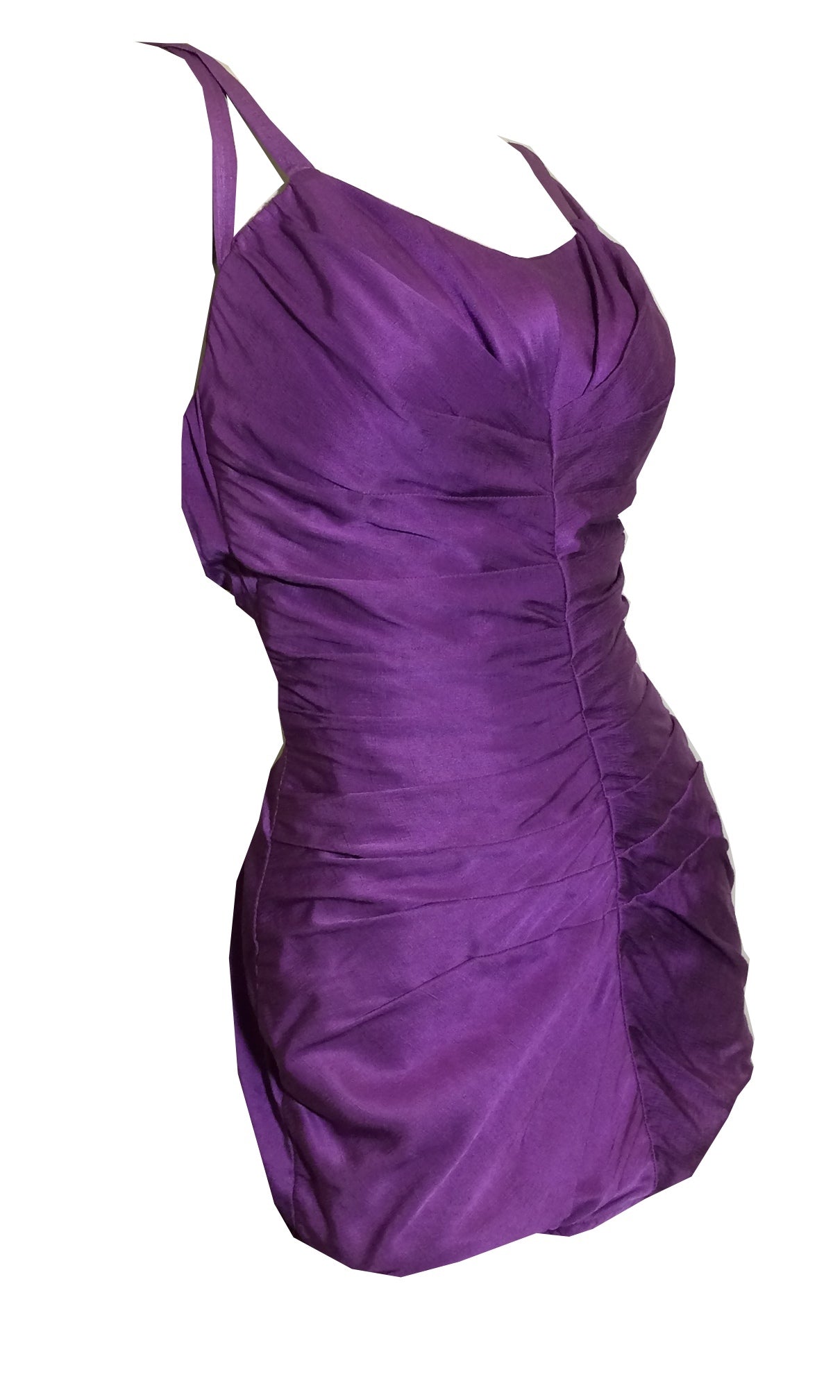 Vivid violet stretch satin dupioni with a center vertical seam in front with horizontal sunburst pleats stretching to sides, unfolding in subtle and figure flattering ruching. Flat straps divide in front into two. Back has metal zip at center. Modesty panel, elastic legs. A "Draped Sheath" by Rose Marie Reid. No flaws.