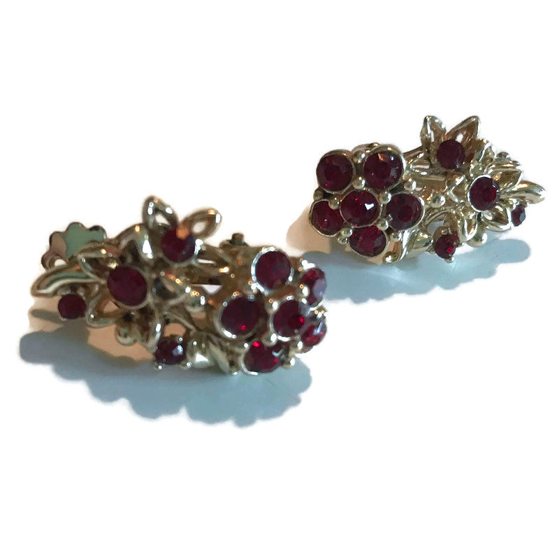 Ruby Red Rhinestone Flower Clip Earrings circa 1950s
