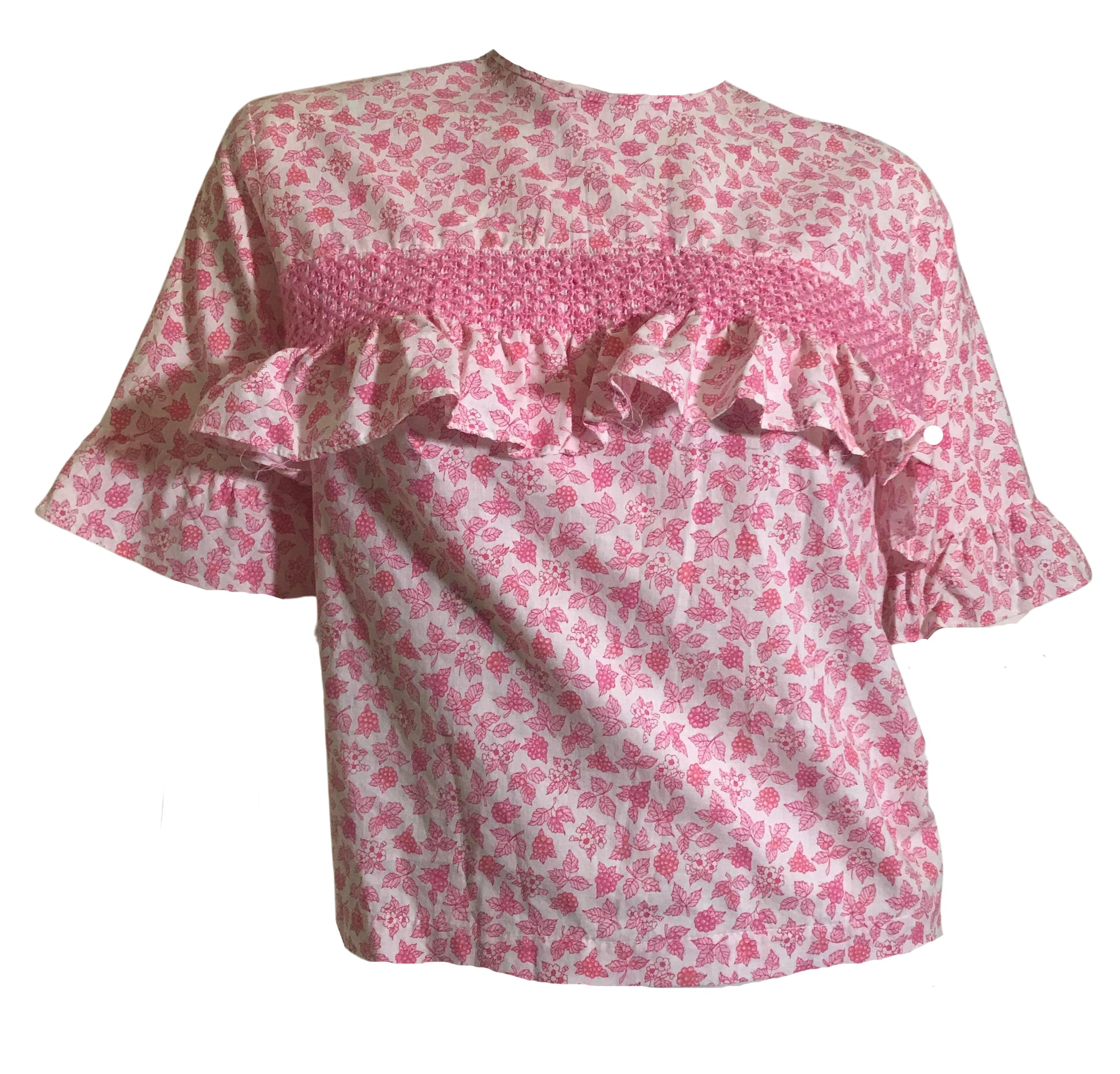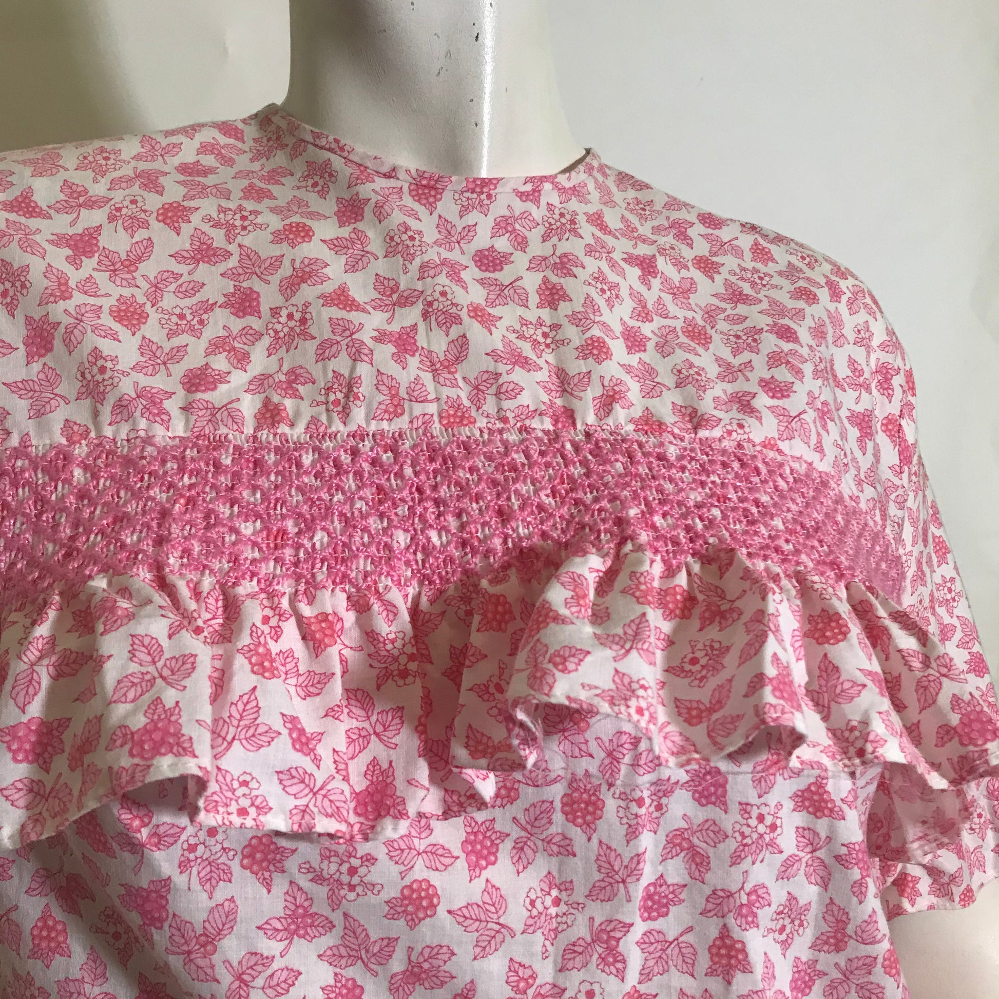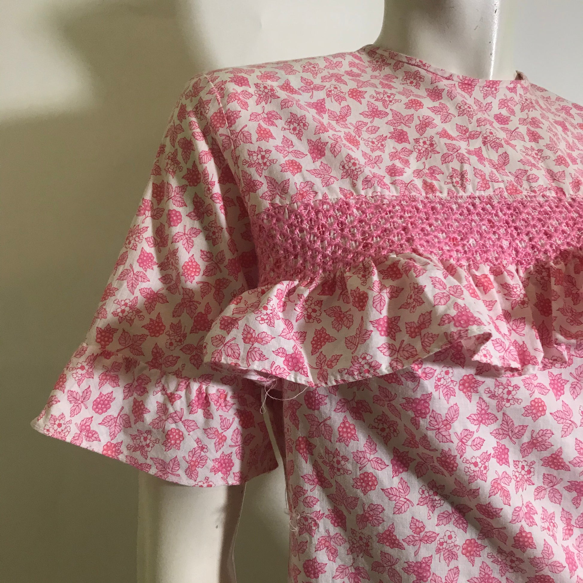 Ruffled Smocked Bodice Pink Floral Print Blouse circa 1960s