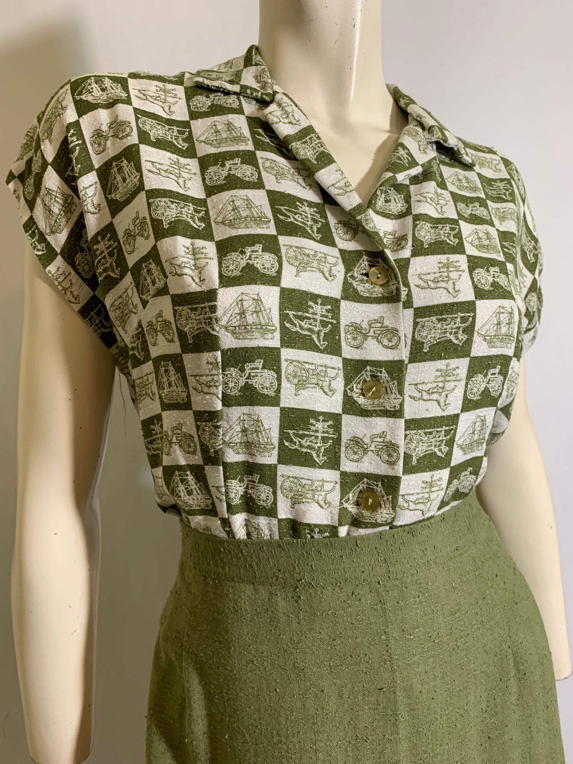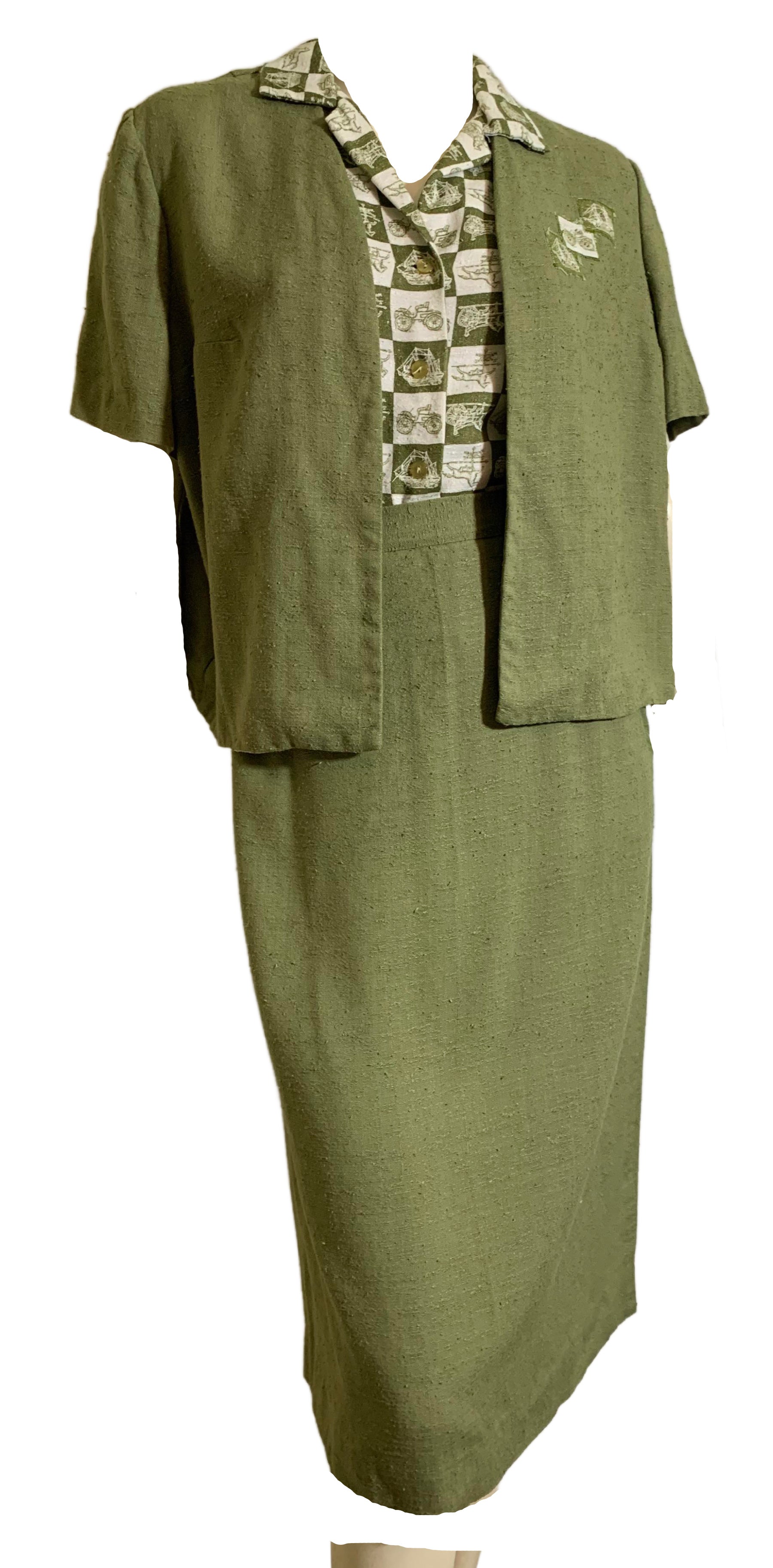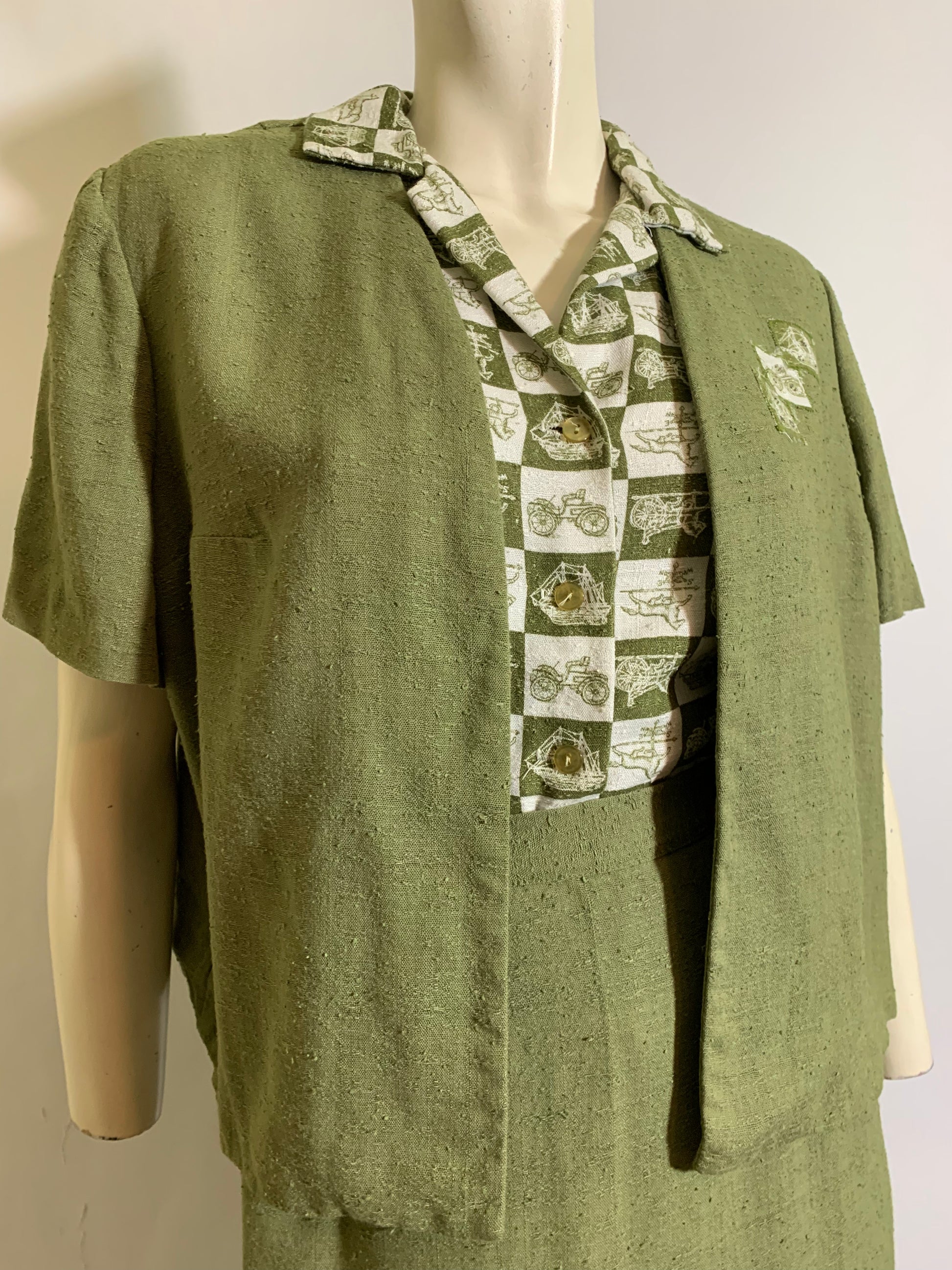 Sage Green Colonial Print Blouse, Jacket and Skirt Dress Set circa 1960s