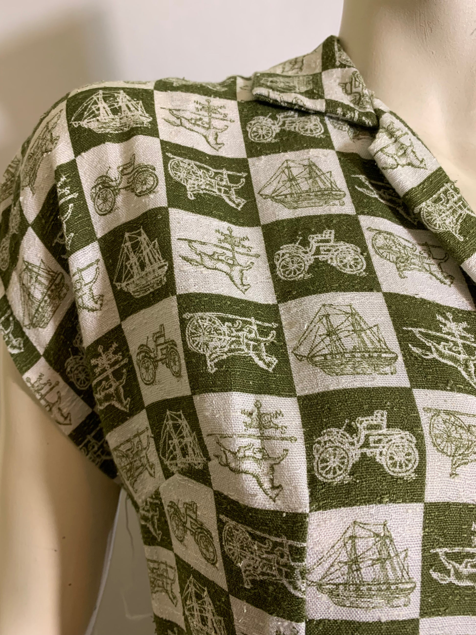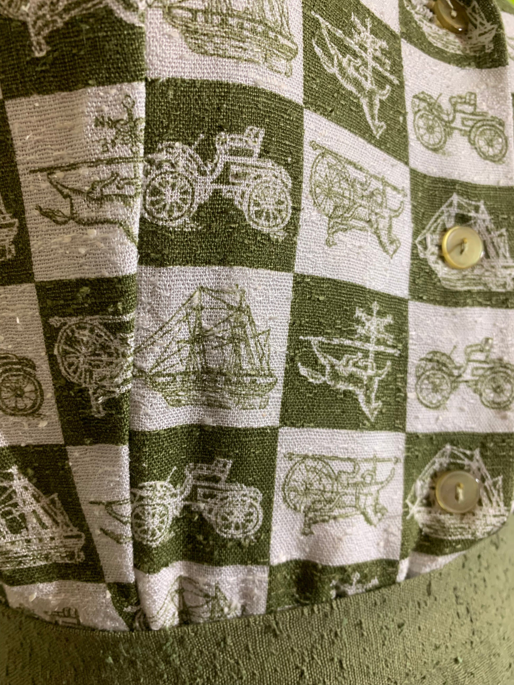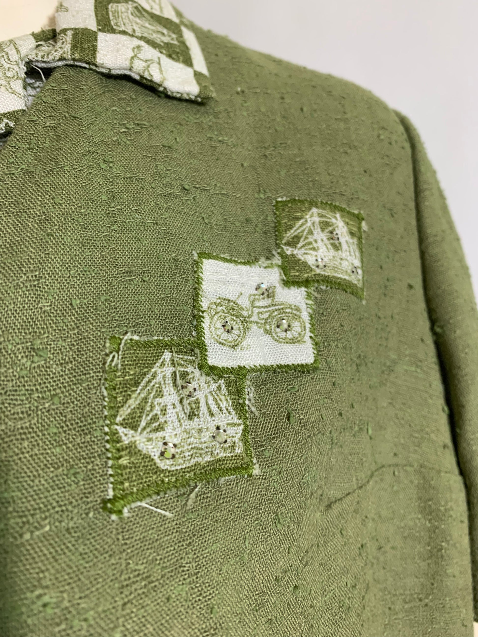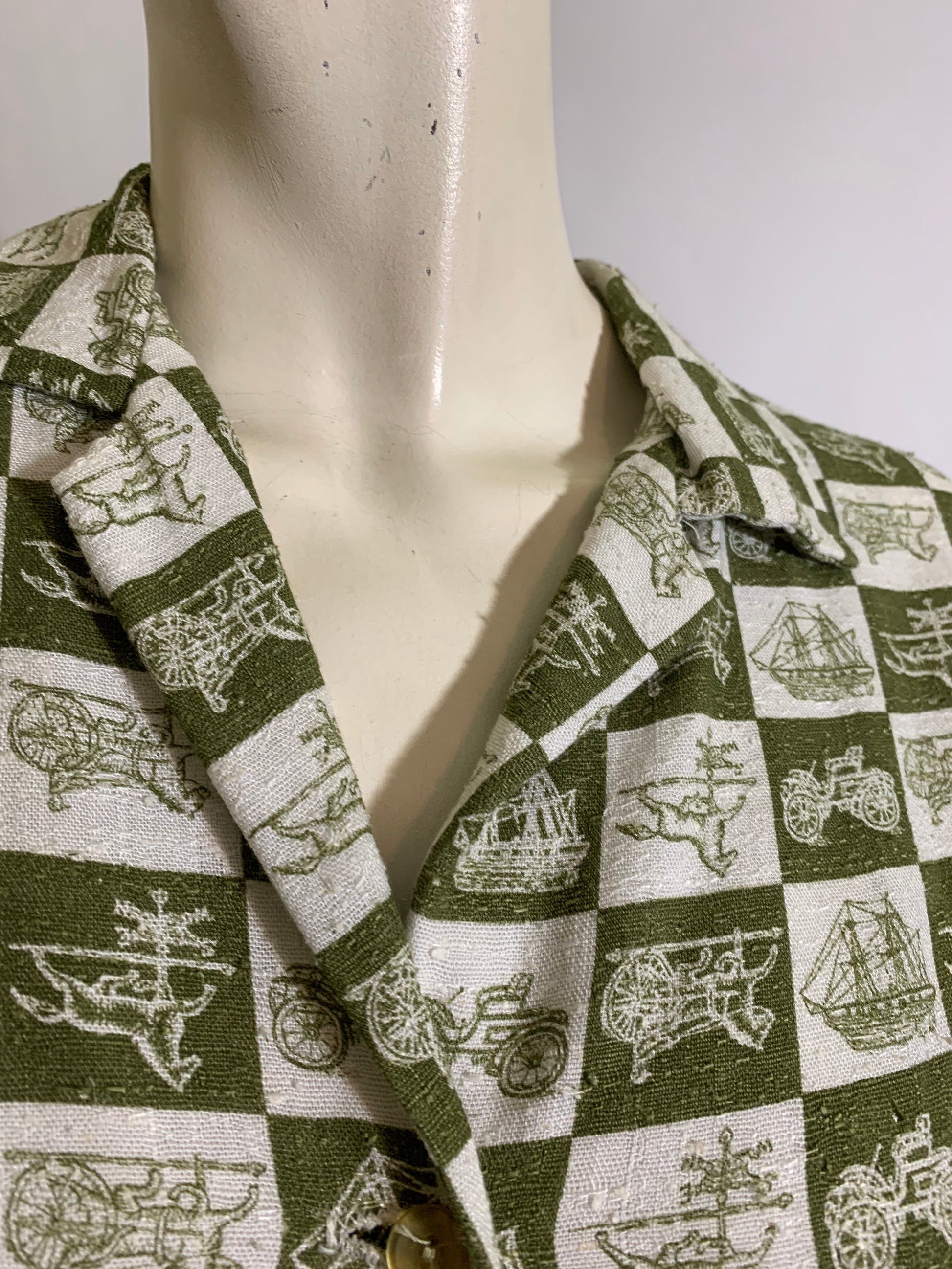 Sage Green Colonial Print Blouse, Jacket and Skirt Dress Set circa 1960s