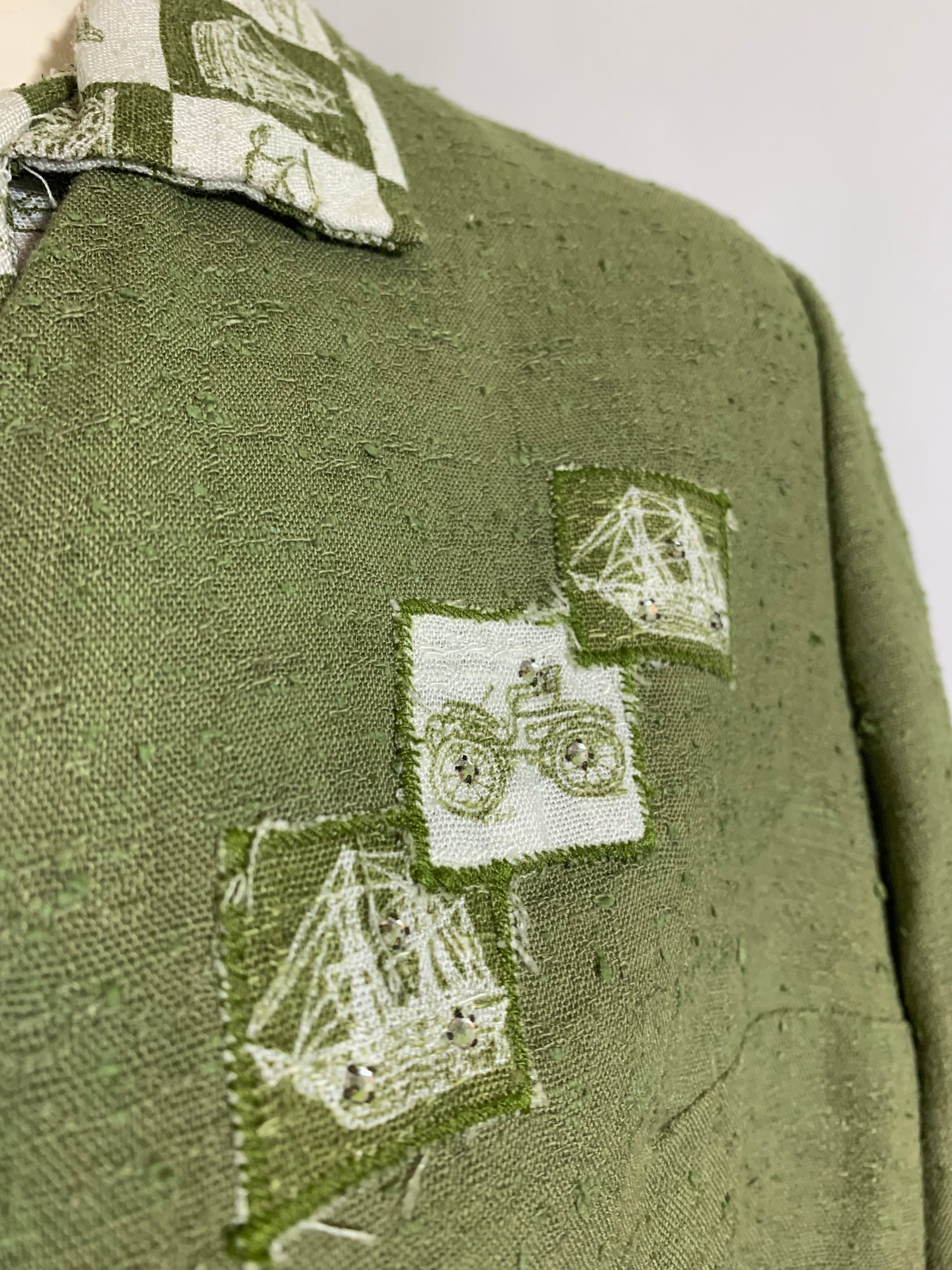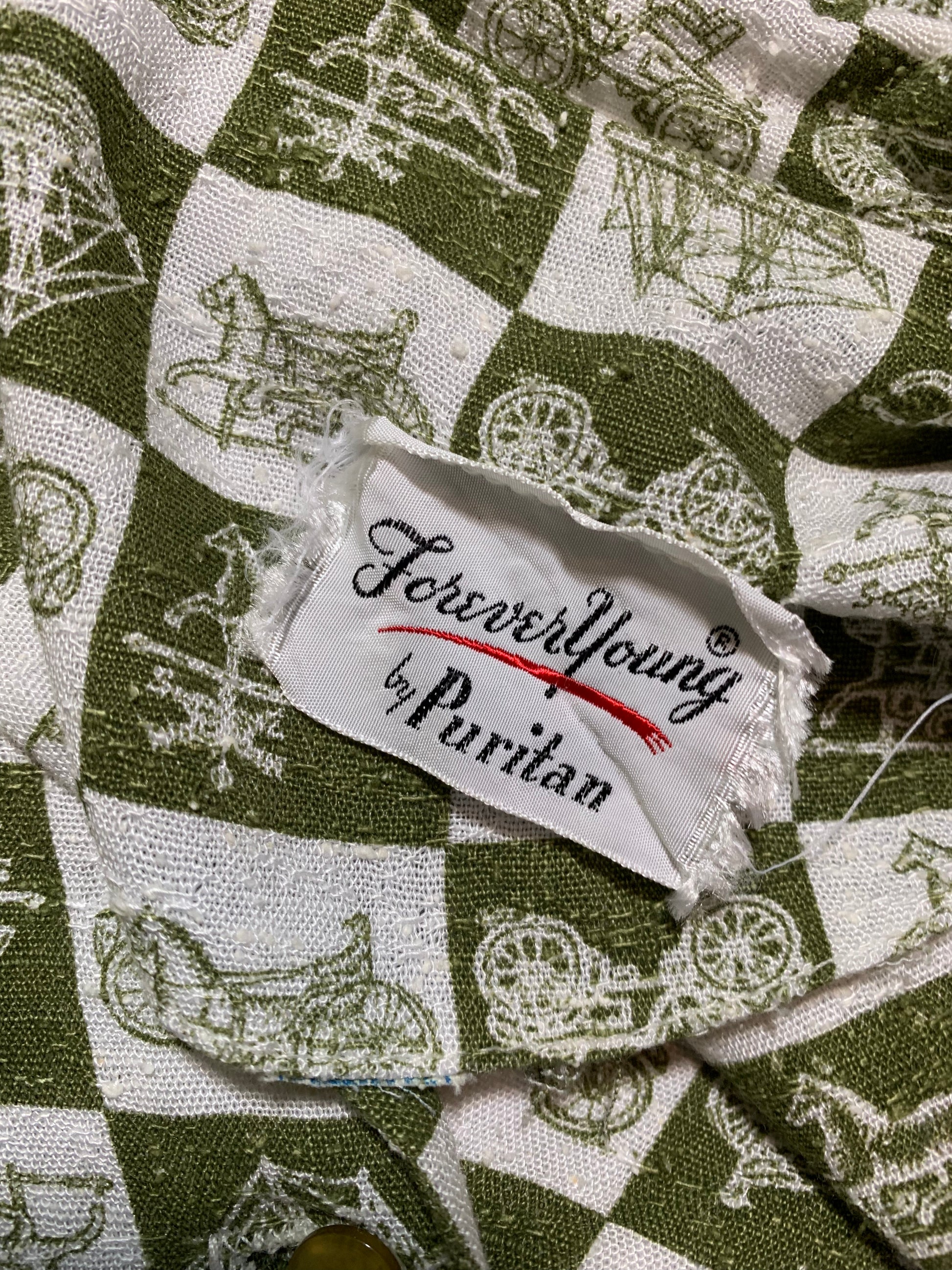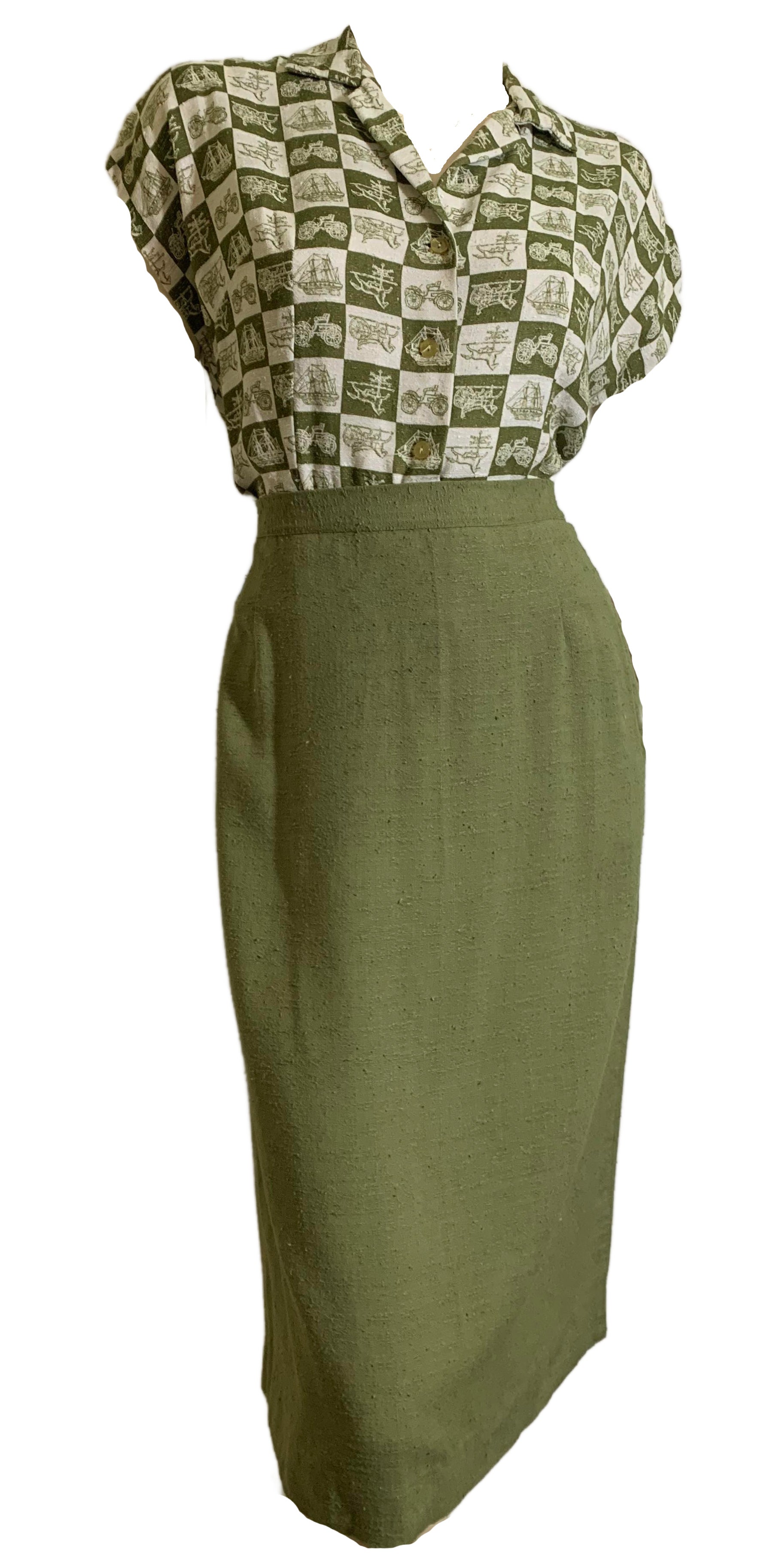 Sage green linen weave rayon pencil skirt and jacket, darling Colonial inspired print nipped waist blouse with angled sleeves. Jacket is lined in the same print, small accent on upper left of jacket done in same fabric dotted with rhinestones. By "Forever Young" by Puritan. No flaws. Adorable together or used as separates!Â