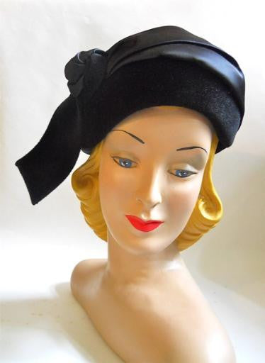 Sculpted Black Wool Hat with Satin Wrap & Rosette circa 1950s