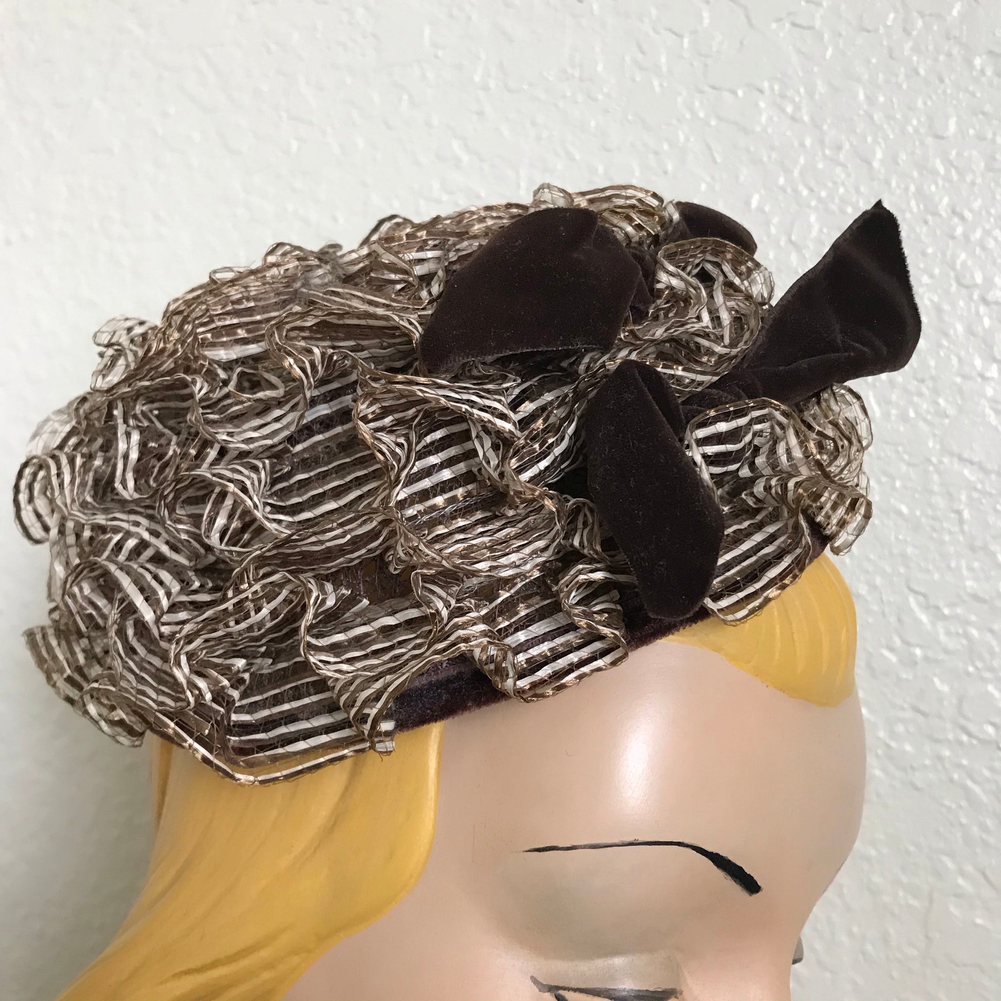 1960s brown and white sculpted sisal whimsy cap by Lilly Daché. Brown velvet bow, combs hold into place. A "Lilly's Dillys", one size, no flaws