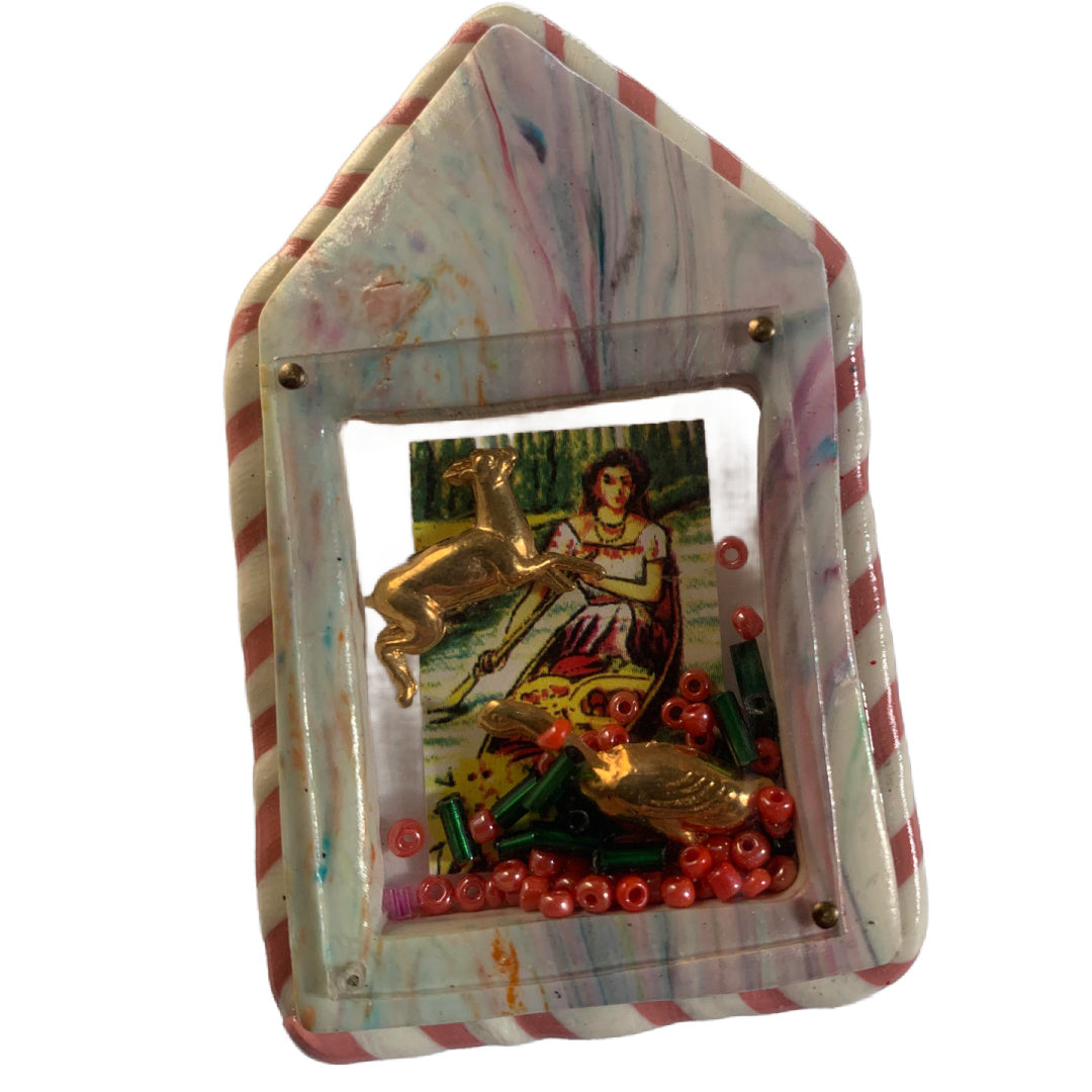 2 7/8" tall by 2" wide, layered collage house shaped art brooch with window and beads and little deer and a fairy tale princess! Unsigned. No flaws.