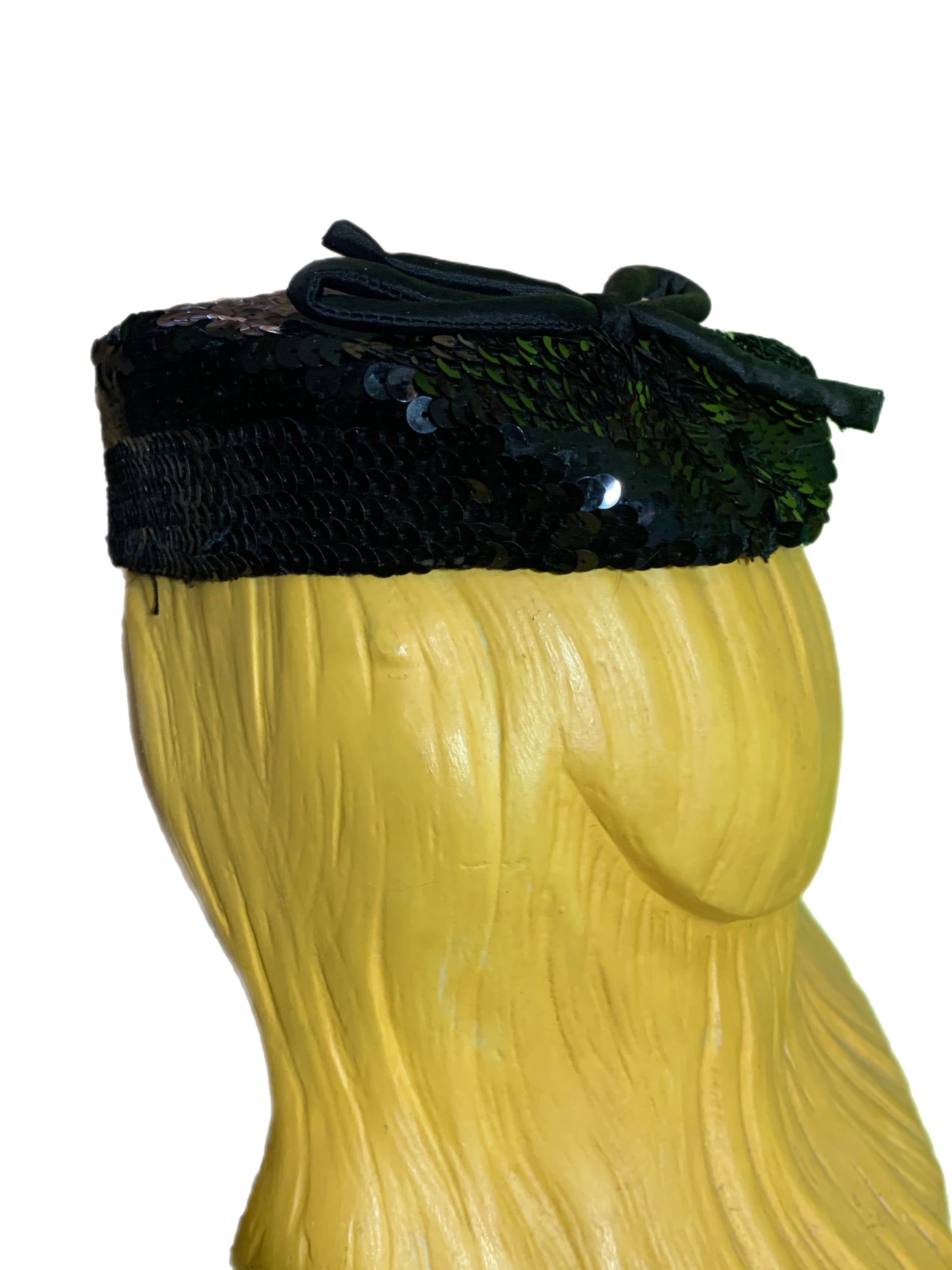 1930s small black faille rayon mini cocktail hat with scads of black iridescent sequins, small bow in back. One size, pins into hair. No label, no flaws.
