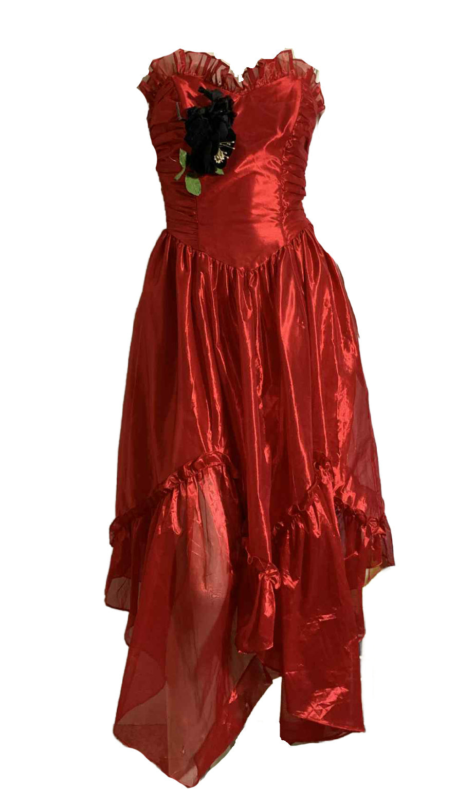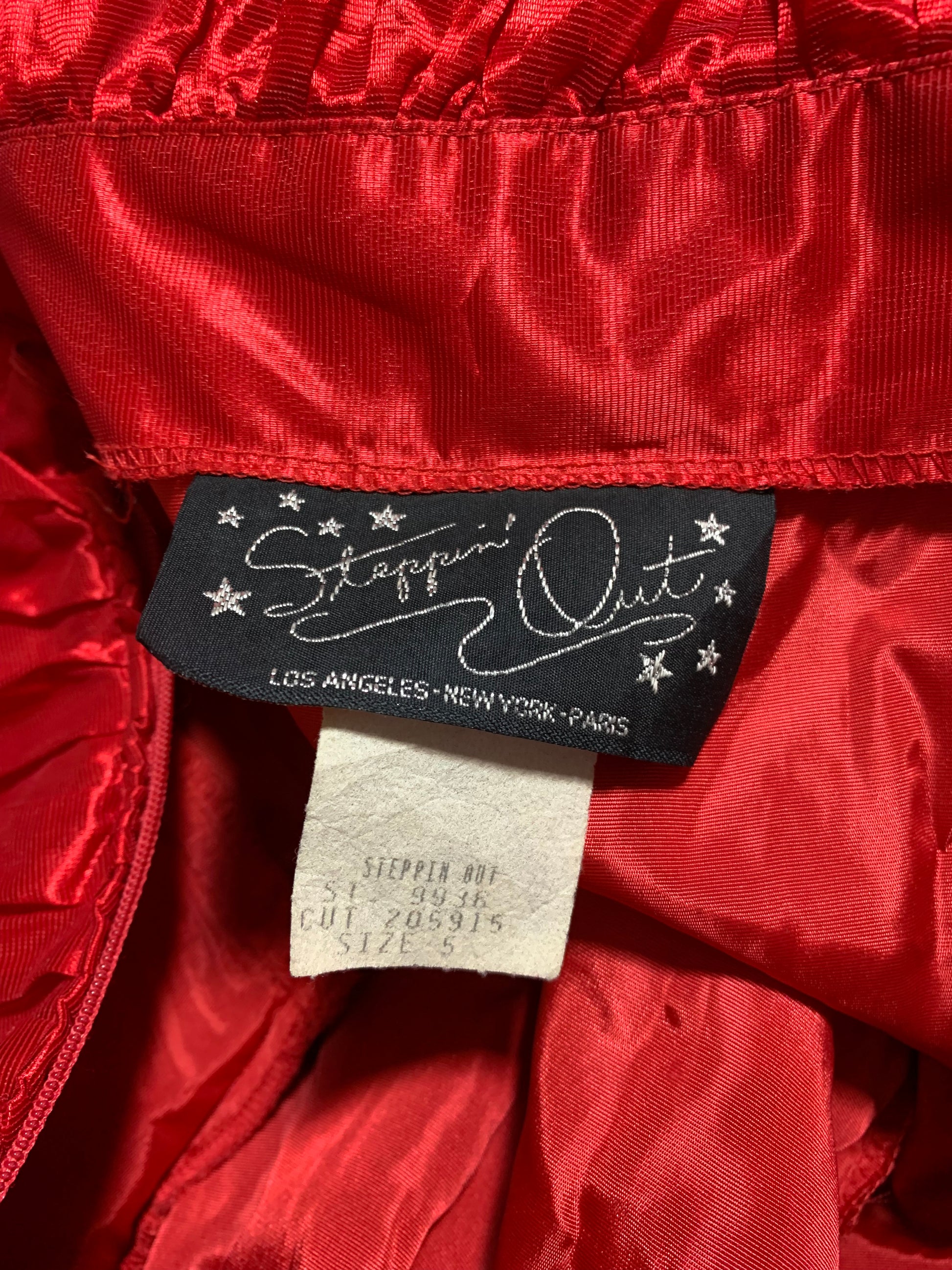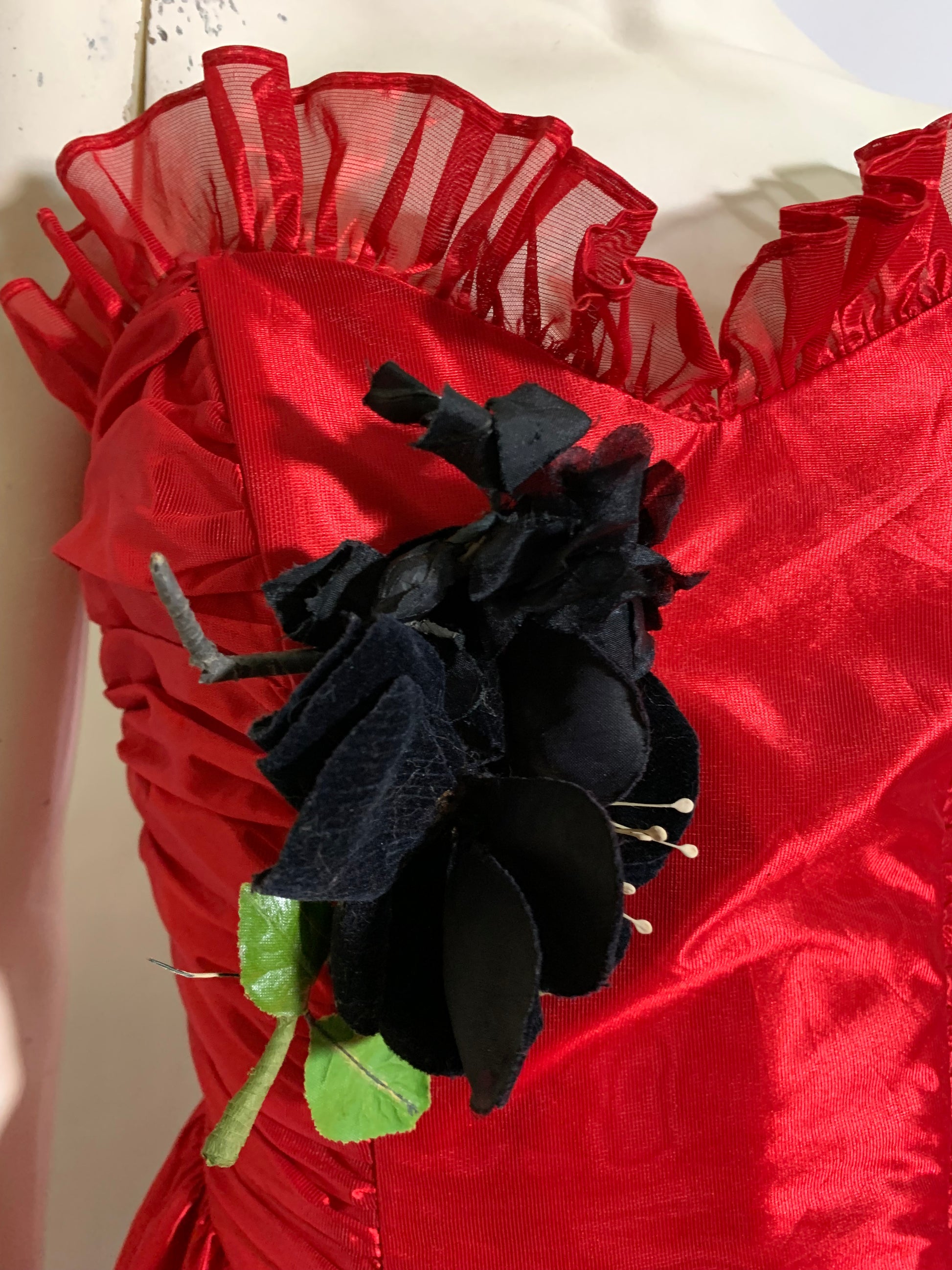 Shimmering red 1980s strapless prom dress with zig zag hem, ruffled accents. Lined, skirt lining is also a zig zag style. Side zipper. Flowers added covering a tear and a larger tear in back below waist seam as shown- selling as is, could be repaired or used as costume. By Steppin' Out.