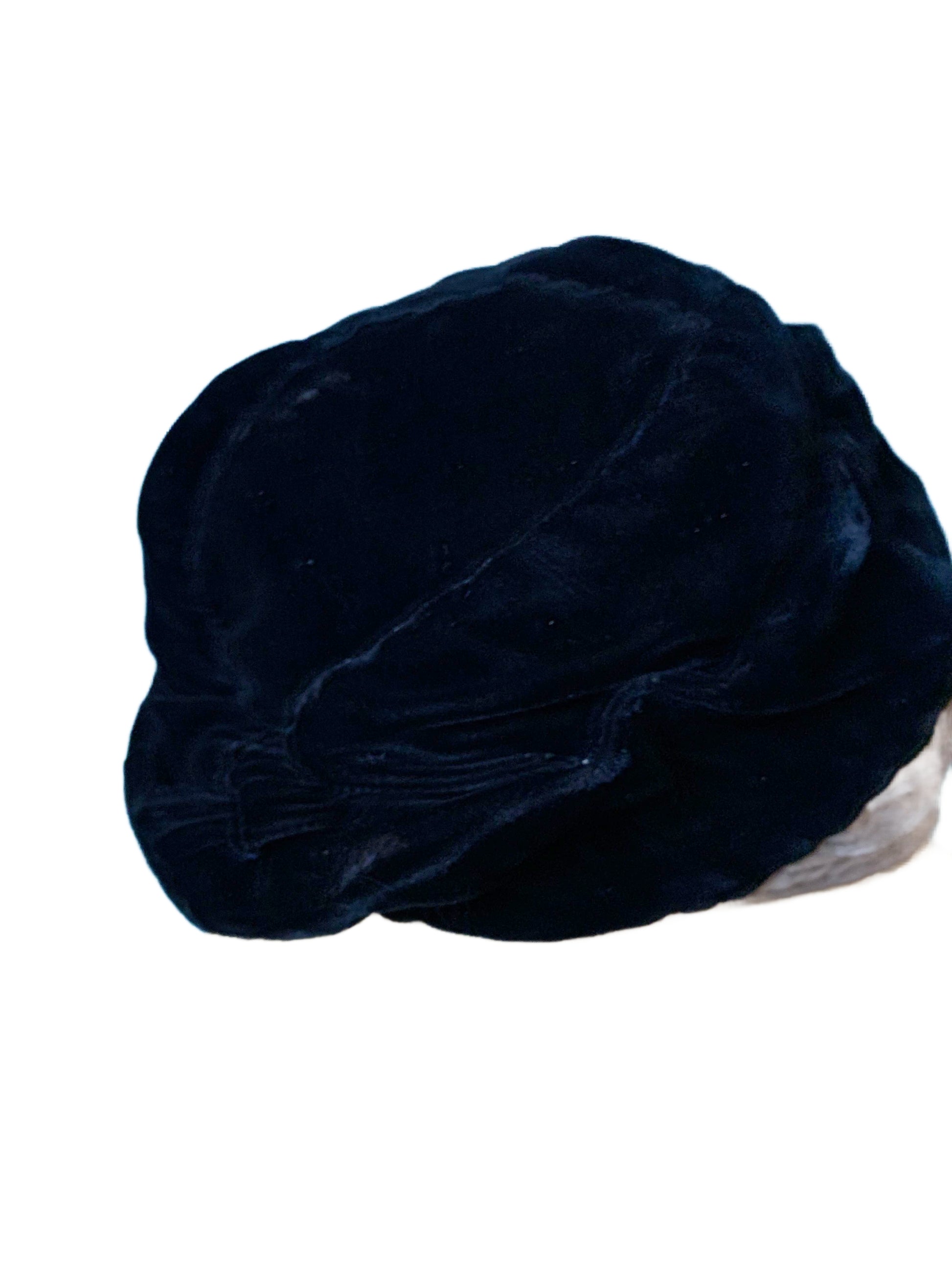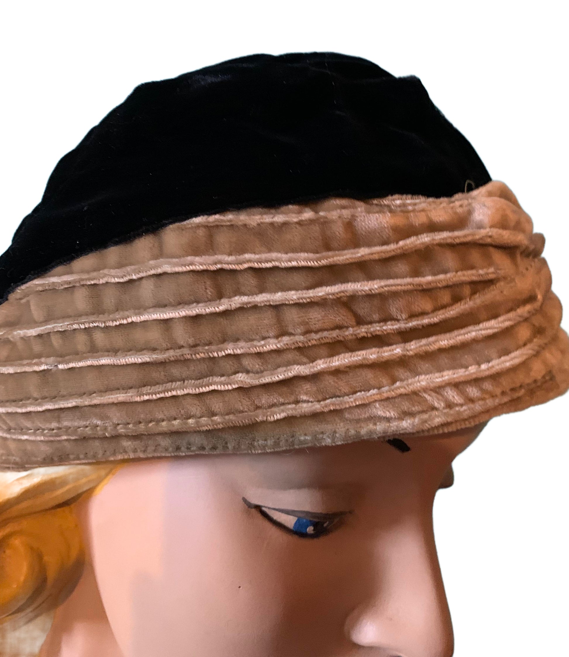1930s black and golden tan silk velvet close fitting hat with pin tucked front piece. Size S. No label, no flaws.