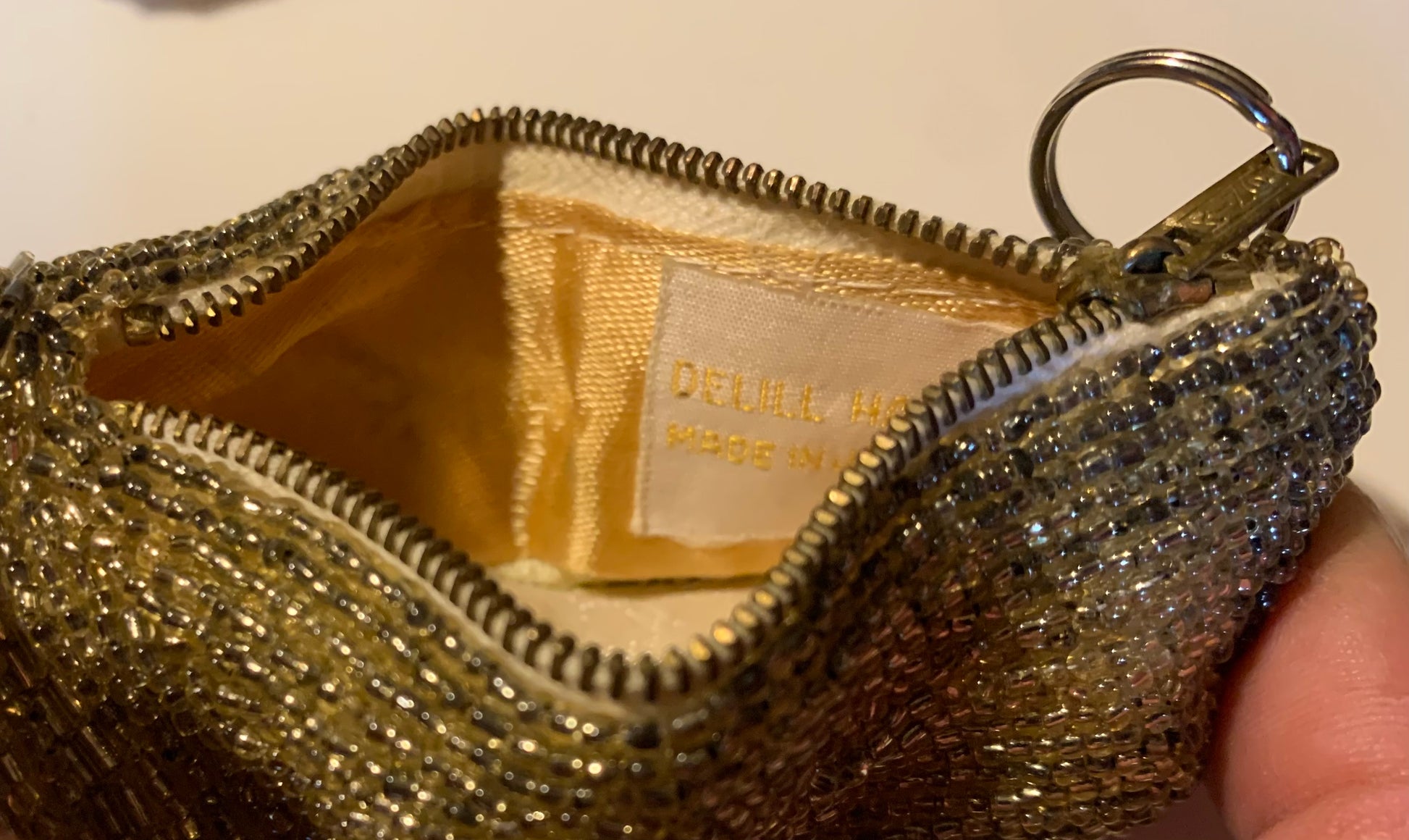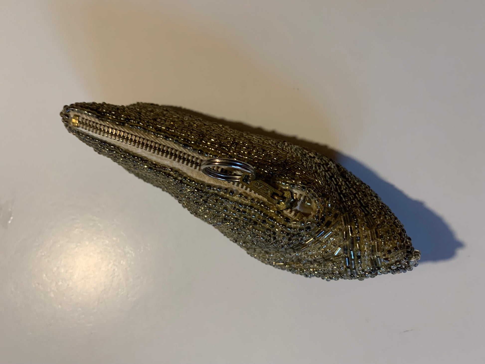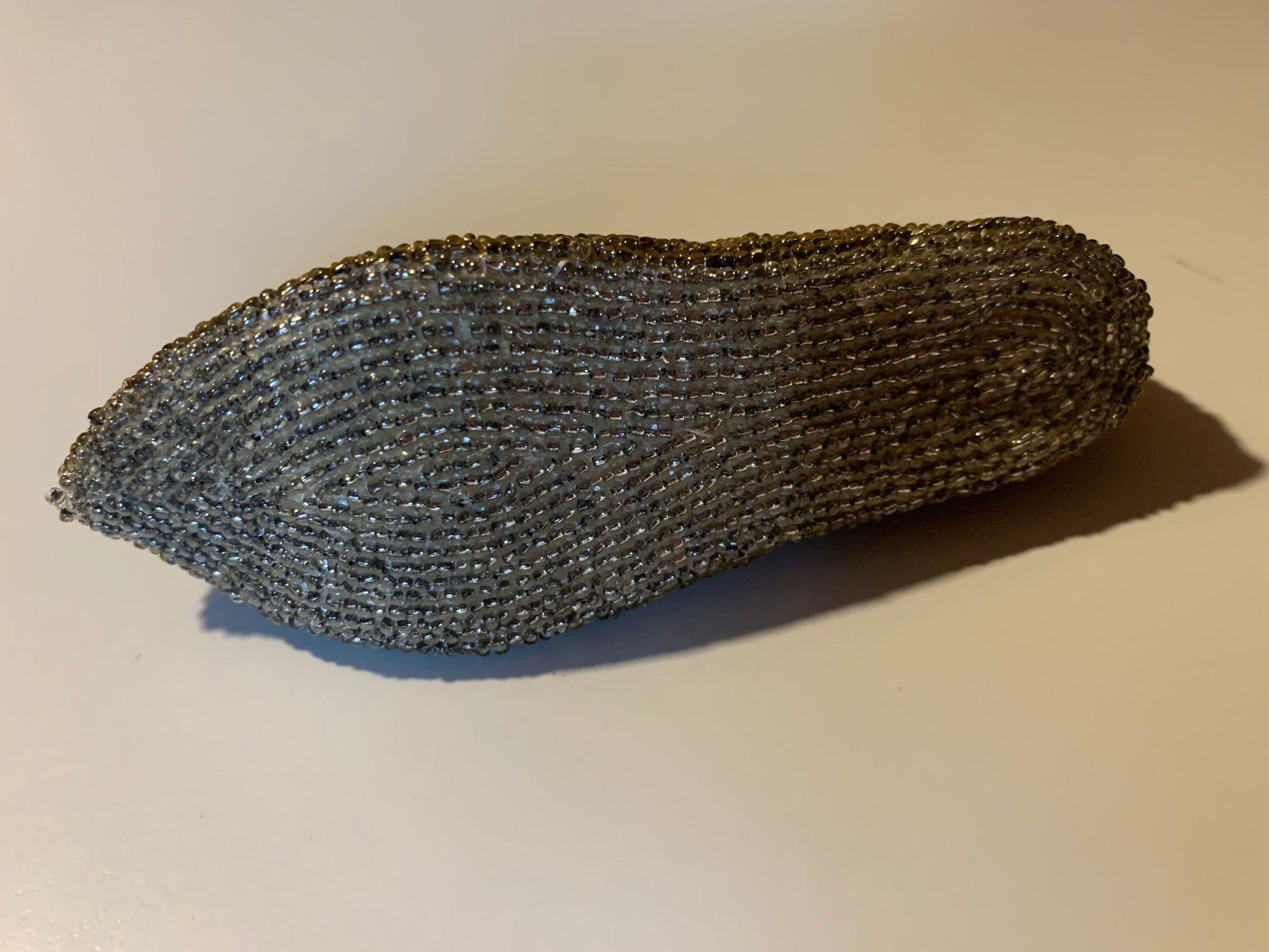 Silver seed bead tiny Persian shoe coin purse with zip top and ring pull, lined in off white satin. By Delill, no flaws.