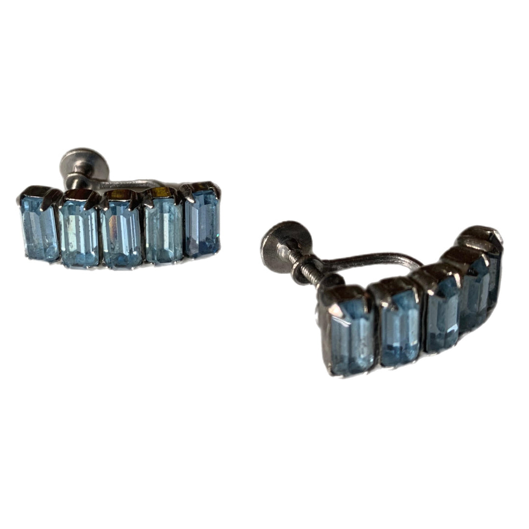 Silver tone curved screw back clip 1950s earrings with sky blue rhinestones. 1", no markings, no flaws.