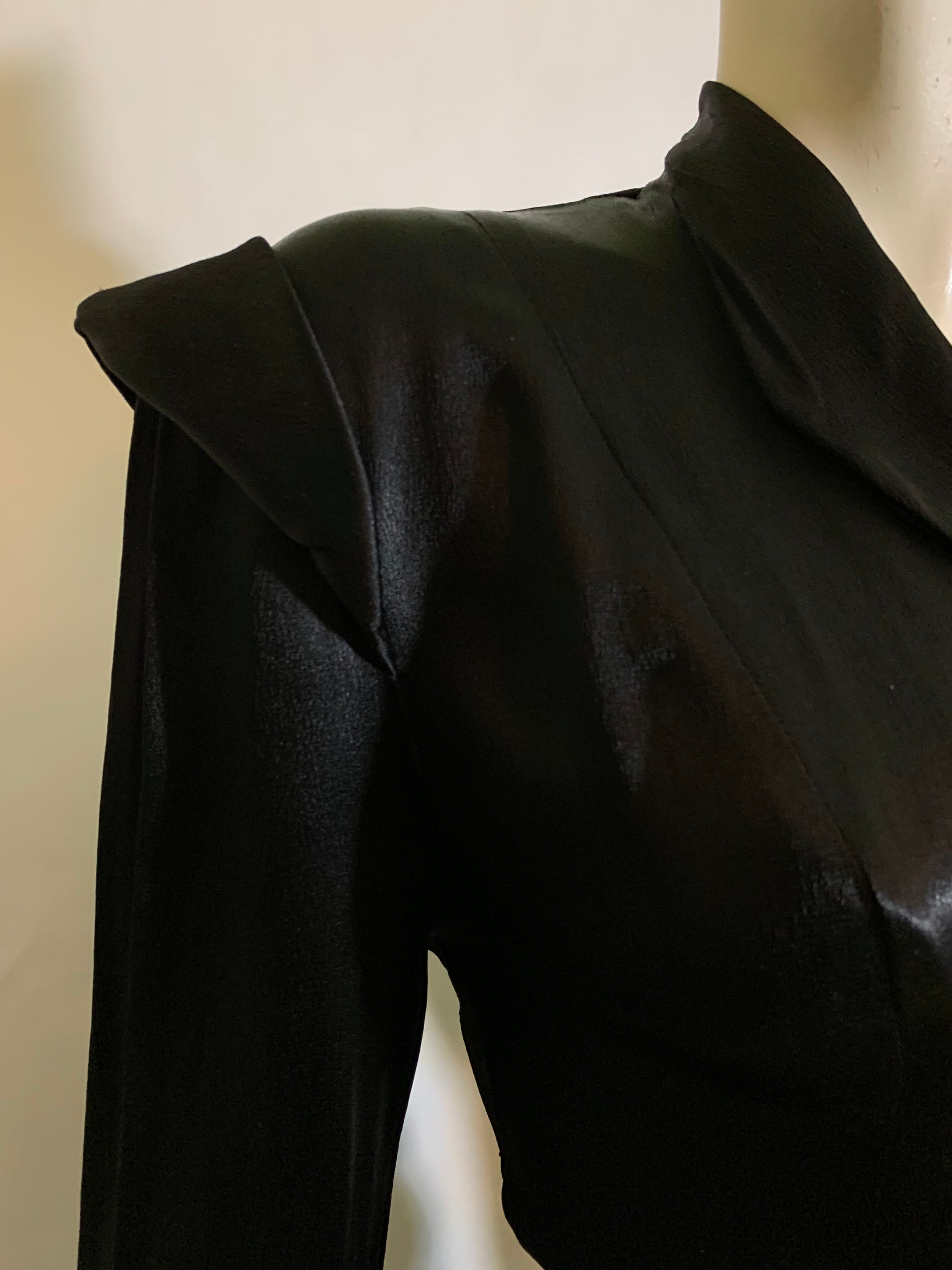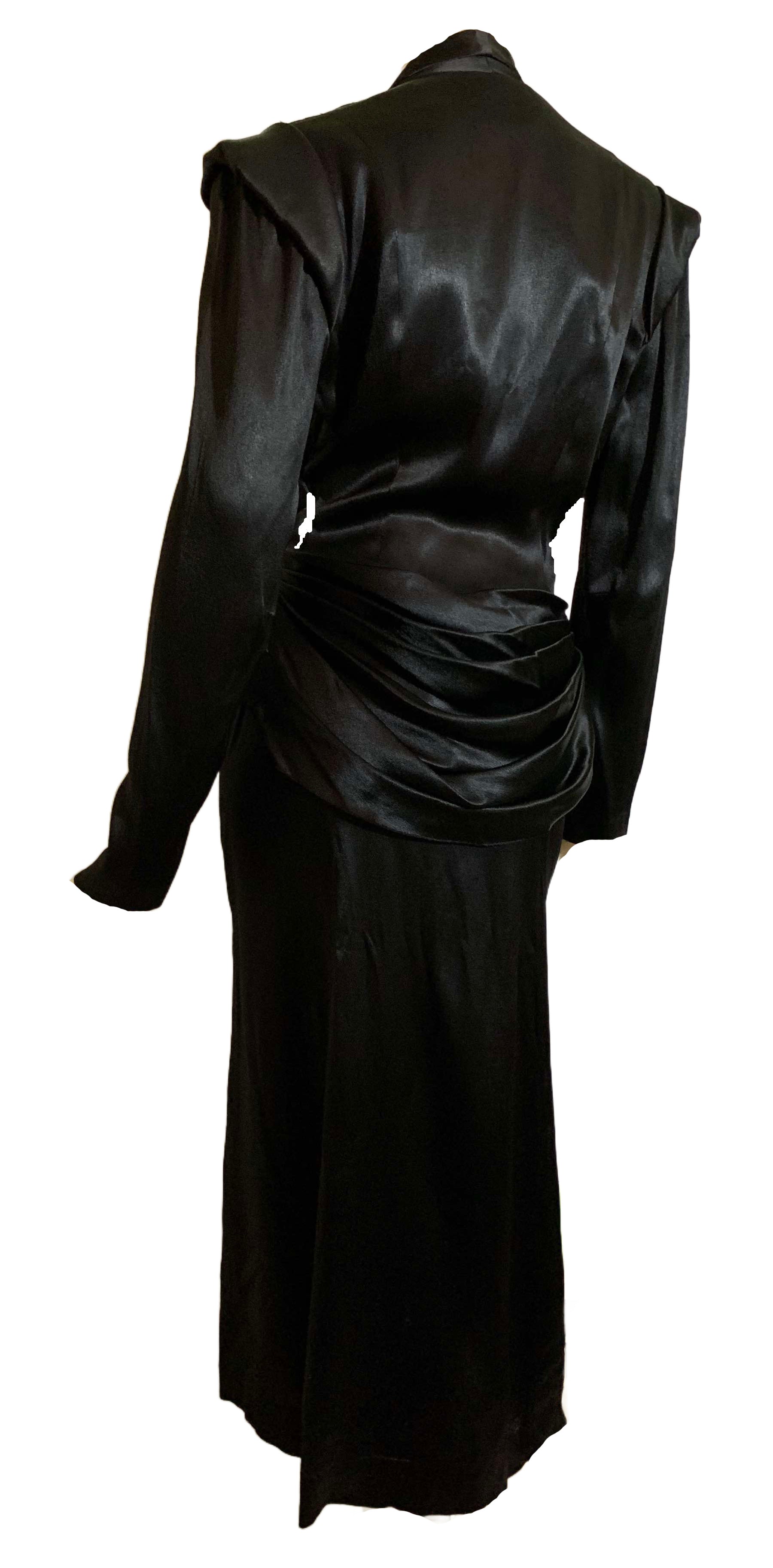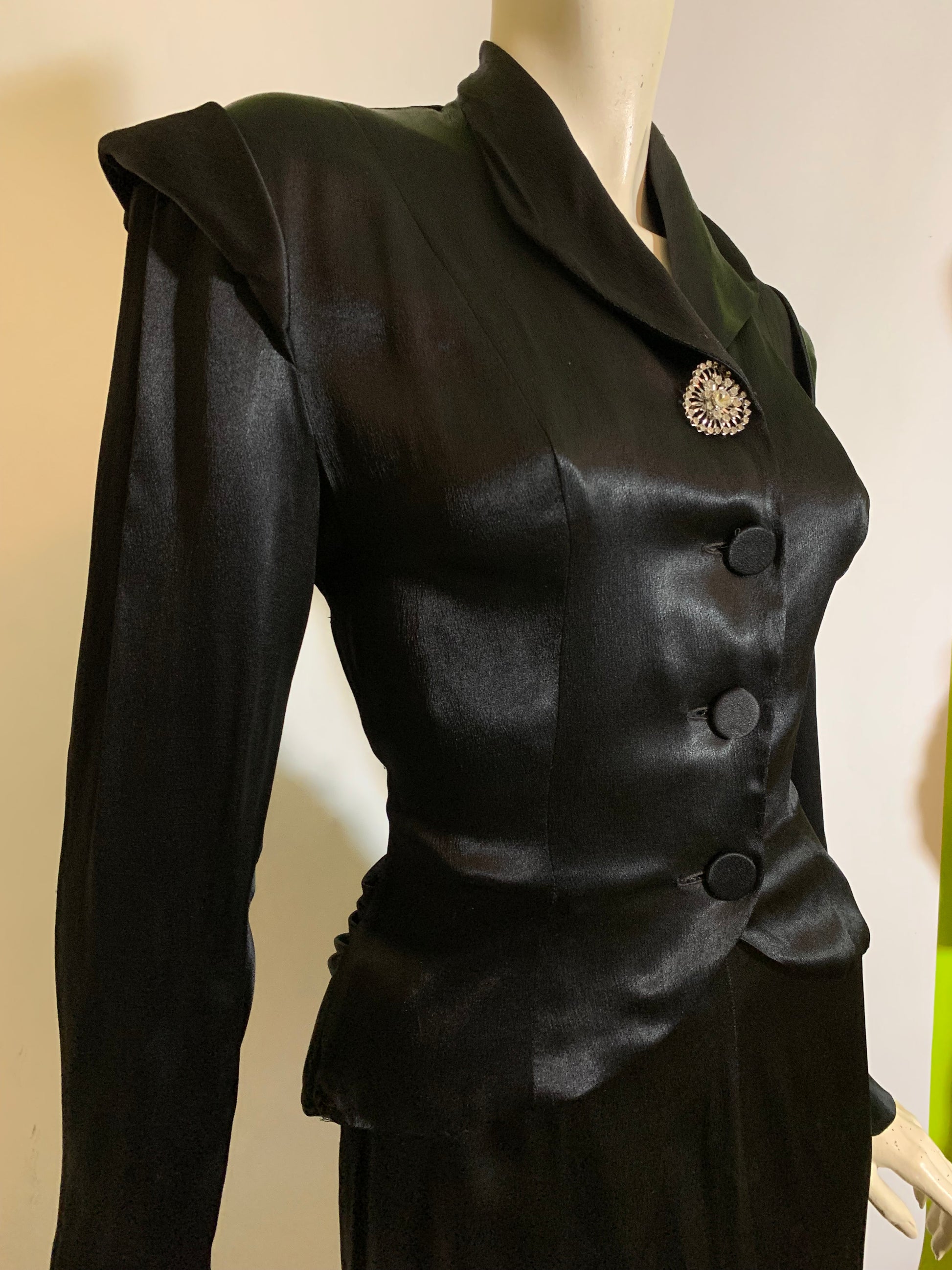 Sleek Black Silk Charmeuse 2 Pc Cocktail Suit with Bustled Drape Back circa 1940s