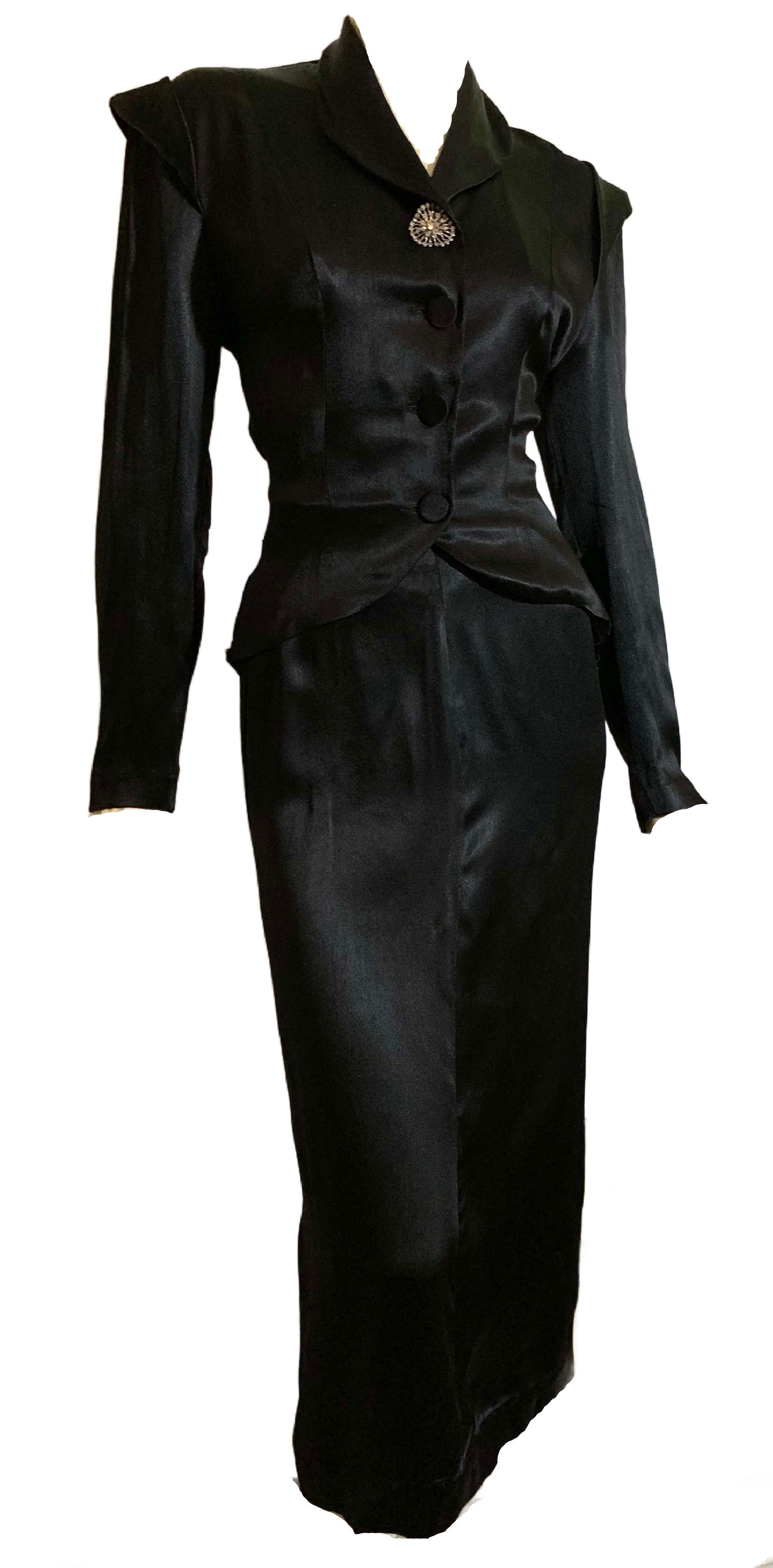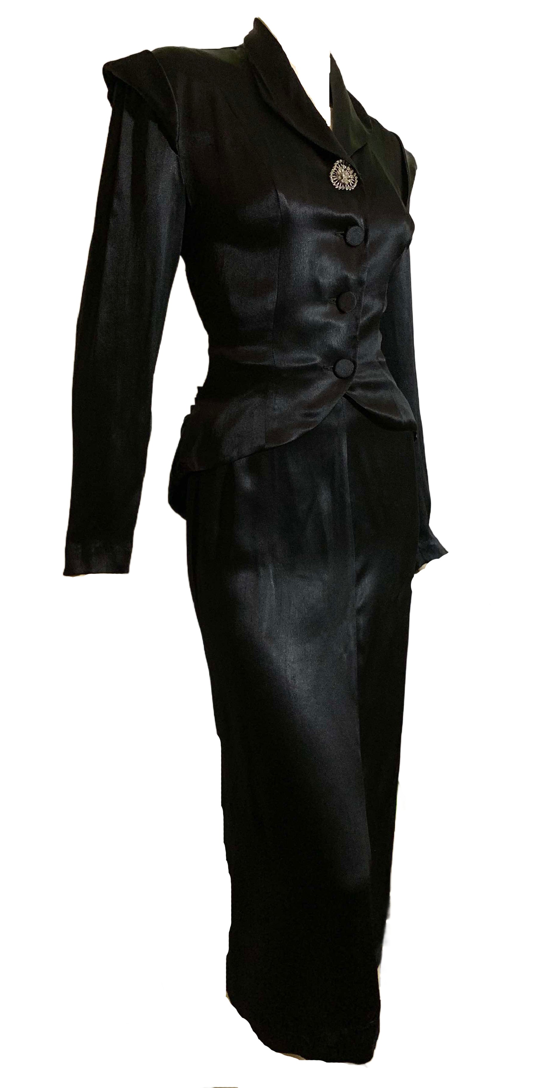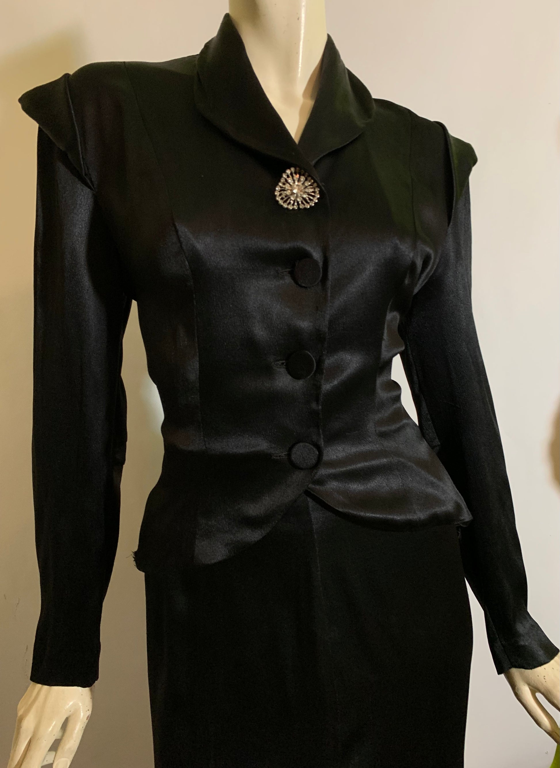Sleek black silk charmeuse 2 piece cocktail suit dress with peaked shoulders, nipped waist and draped bustle back on hem of jacket. Covered buttons, top one missing, shown with a brooch. Pencil skirt with side metal zip and hooks and eyes. Unlined. A few tiny holes on sleeve, a worn spot on right side hem on jacket. By Helen of California.Â