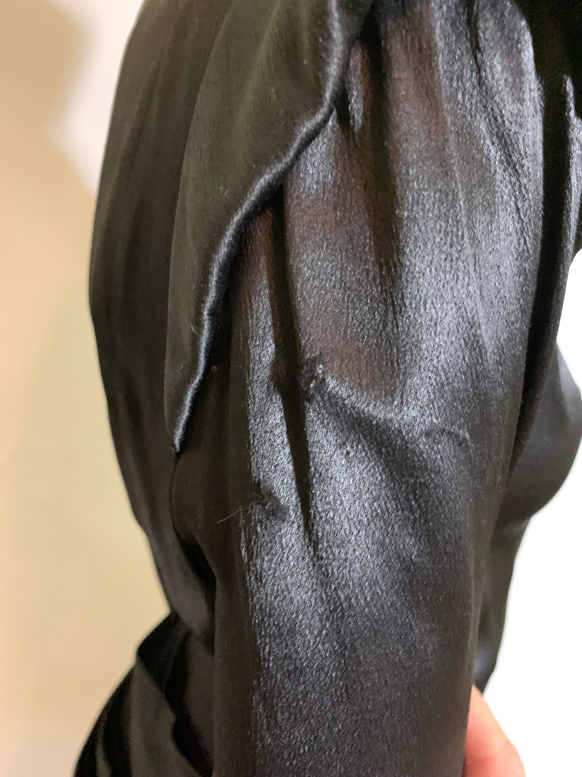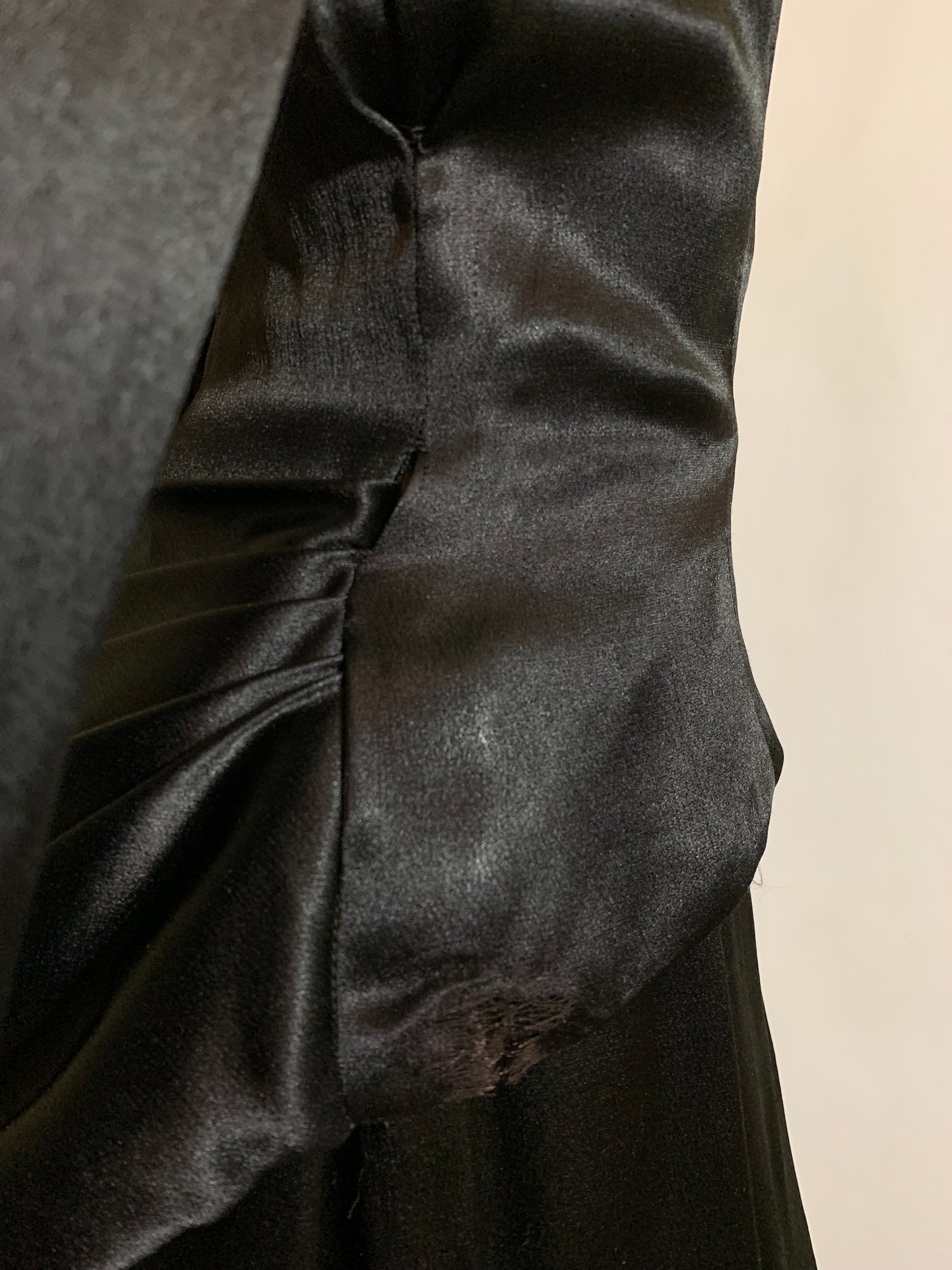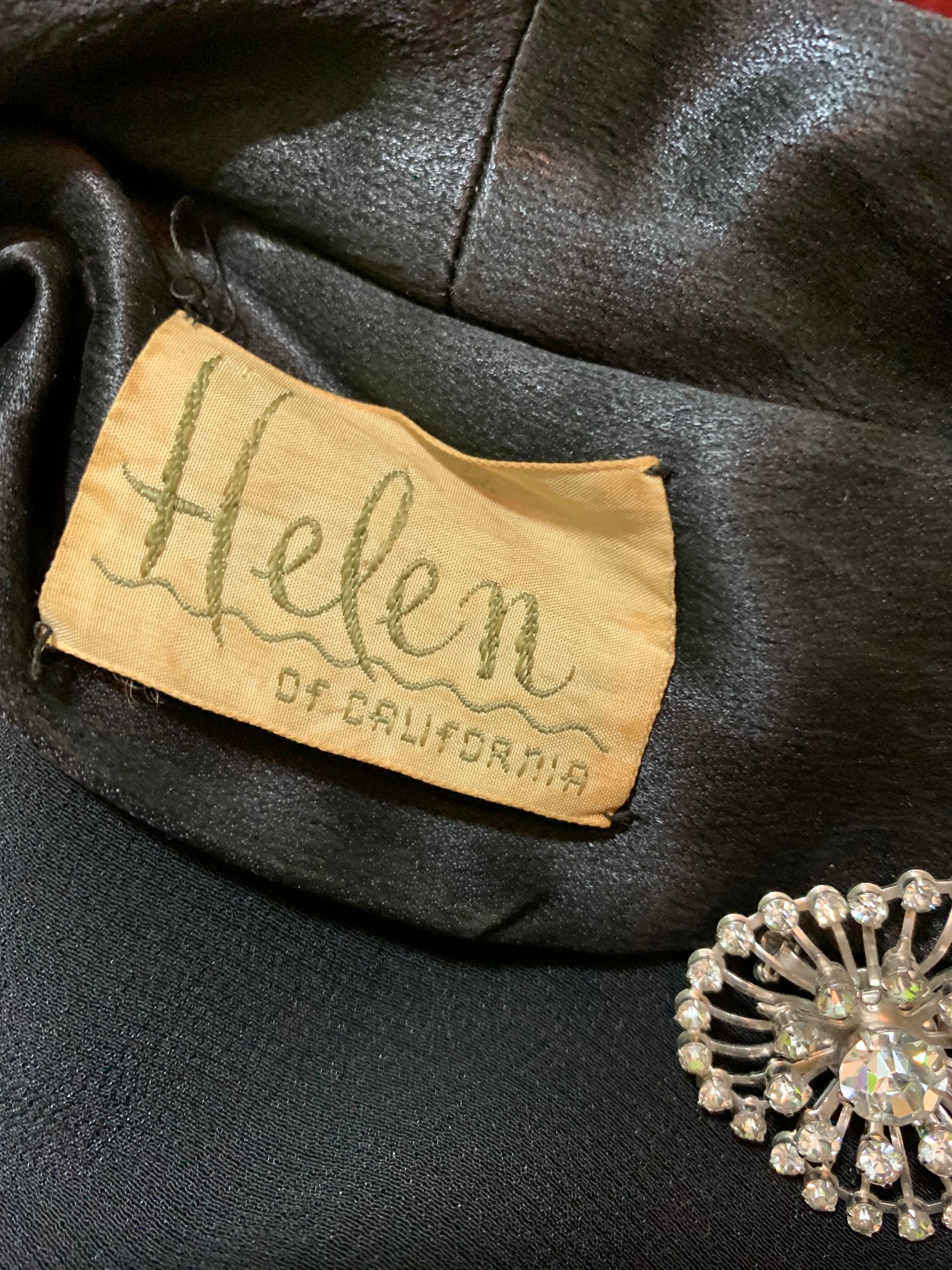 Sleek black silk charmeuse 2 piece cocktail suit dress with peaked shoulders, nipped waist and draped bustle back on hem of jacket. Covered buttons, top one missing, shown with a brooch. Pencil skirt with side metal zip and hooks and eyes. Unlined. A few tiny holes on sleeve, a worn spot on right side hem on jacket. By Helen of California.Â
