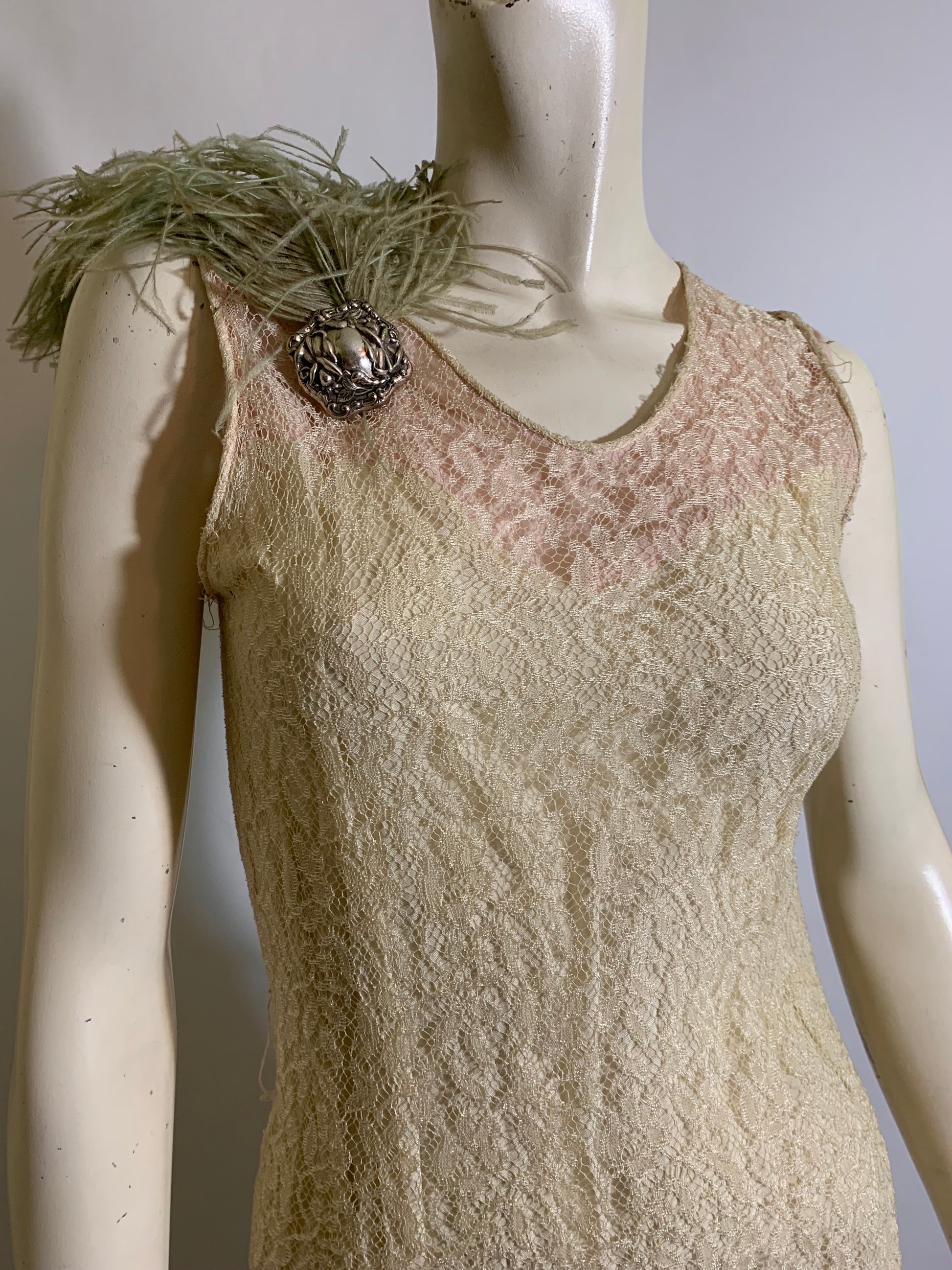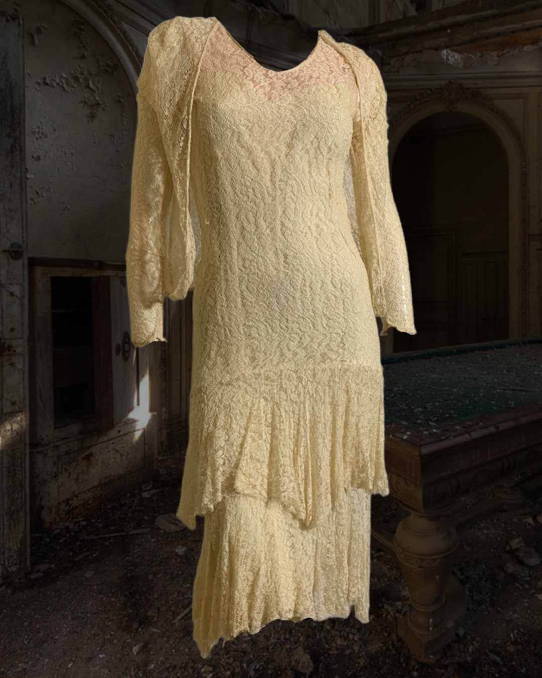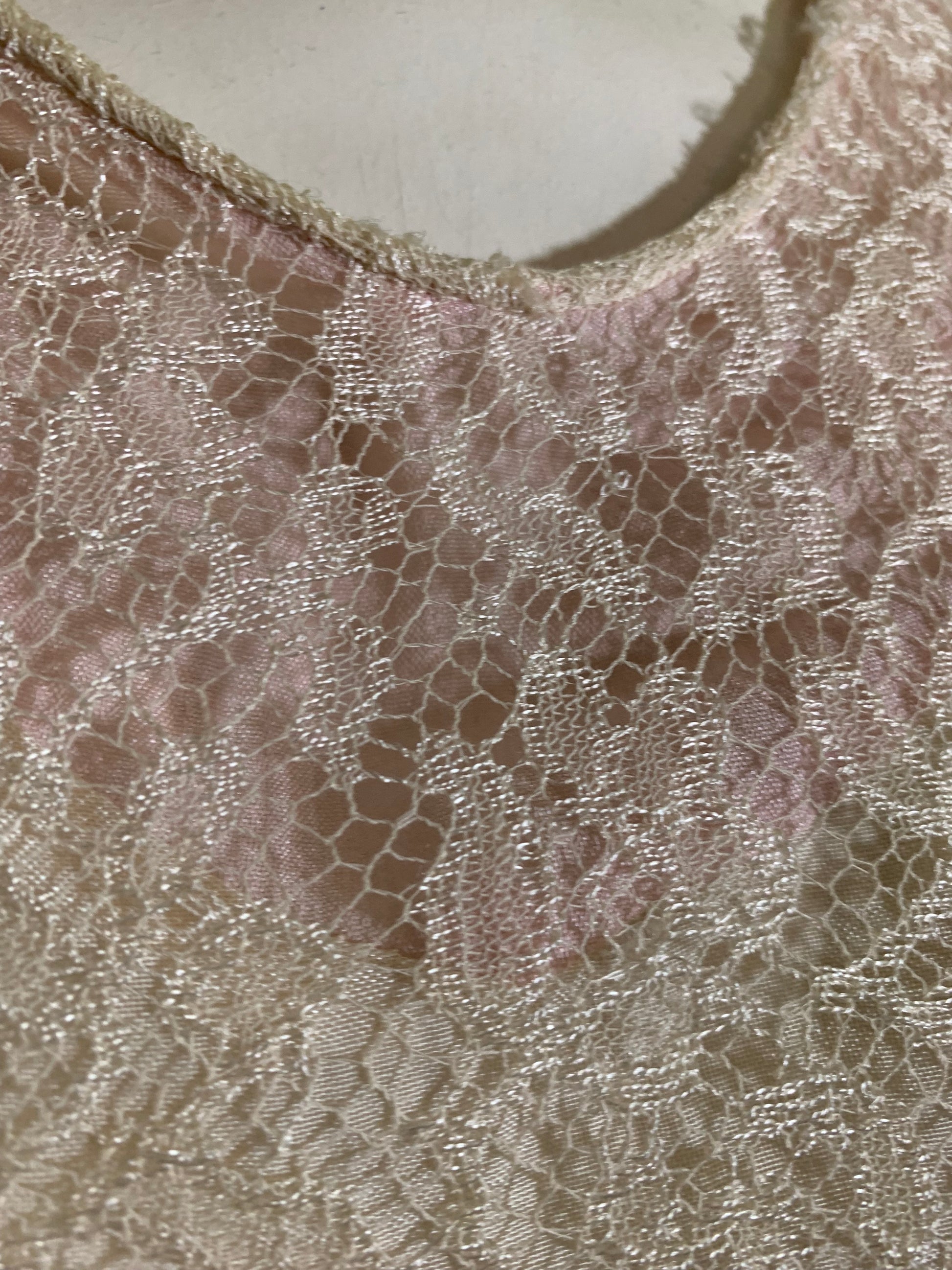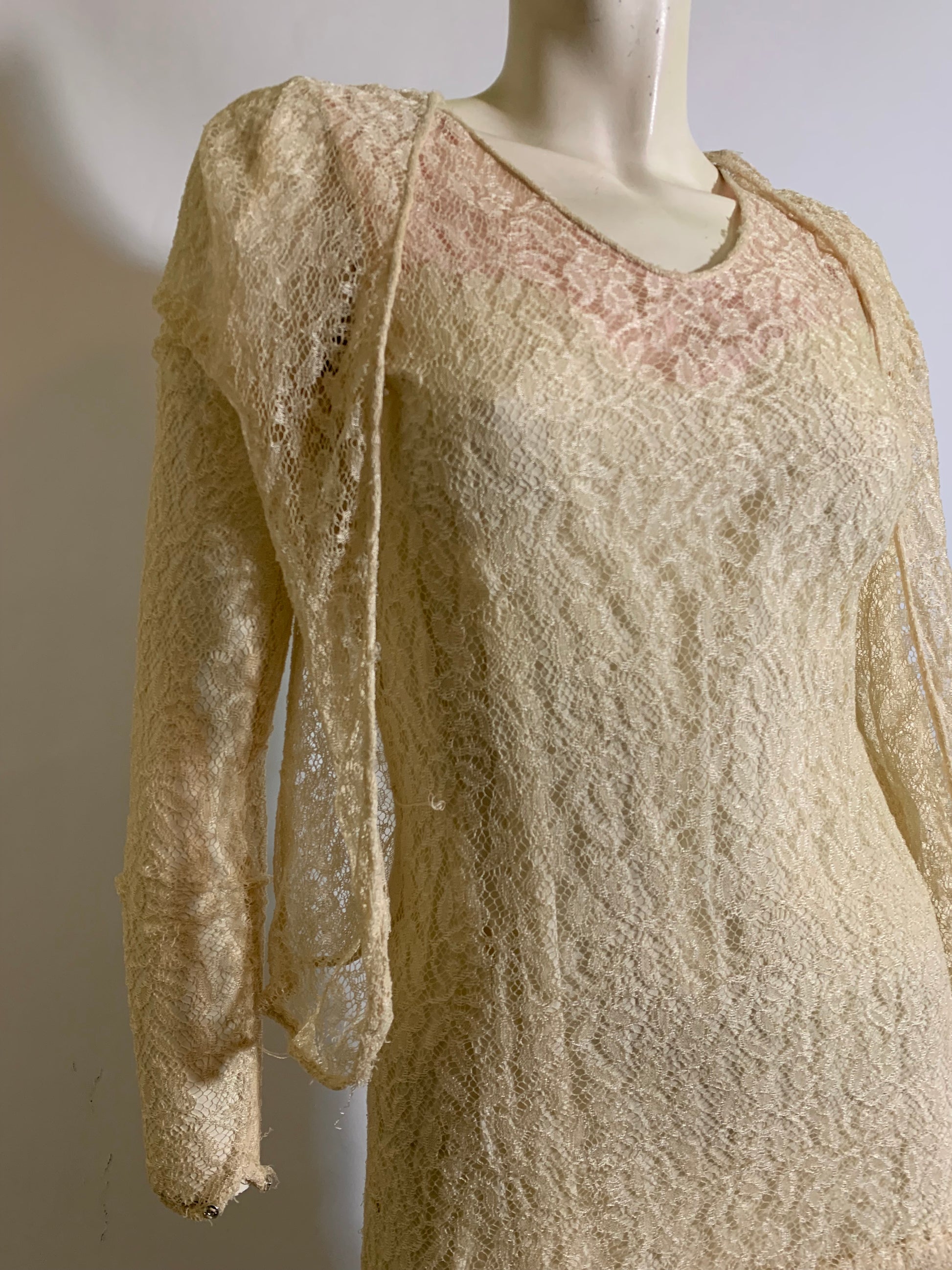 1930s off white sleeveless dress with hanky hem, pink lined neckline, matching long sleeved jacket. Lined. No openings at sides or back- has a little stretch to it. A few small holes and overall wear. AS IS.
