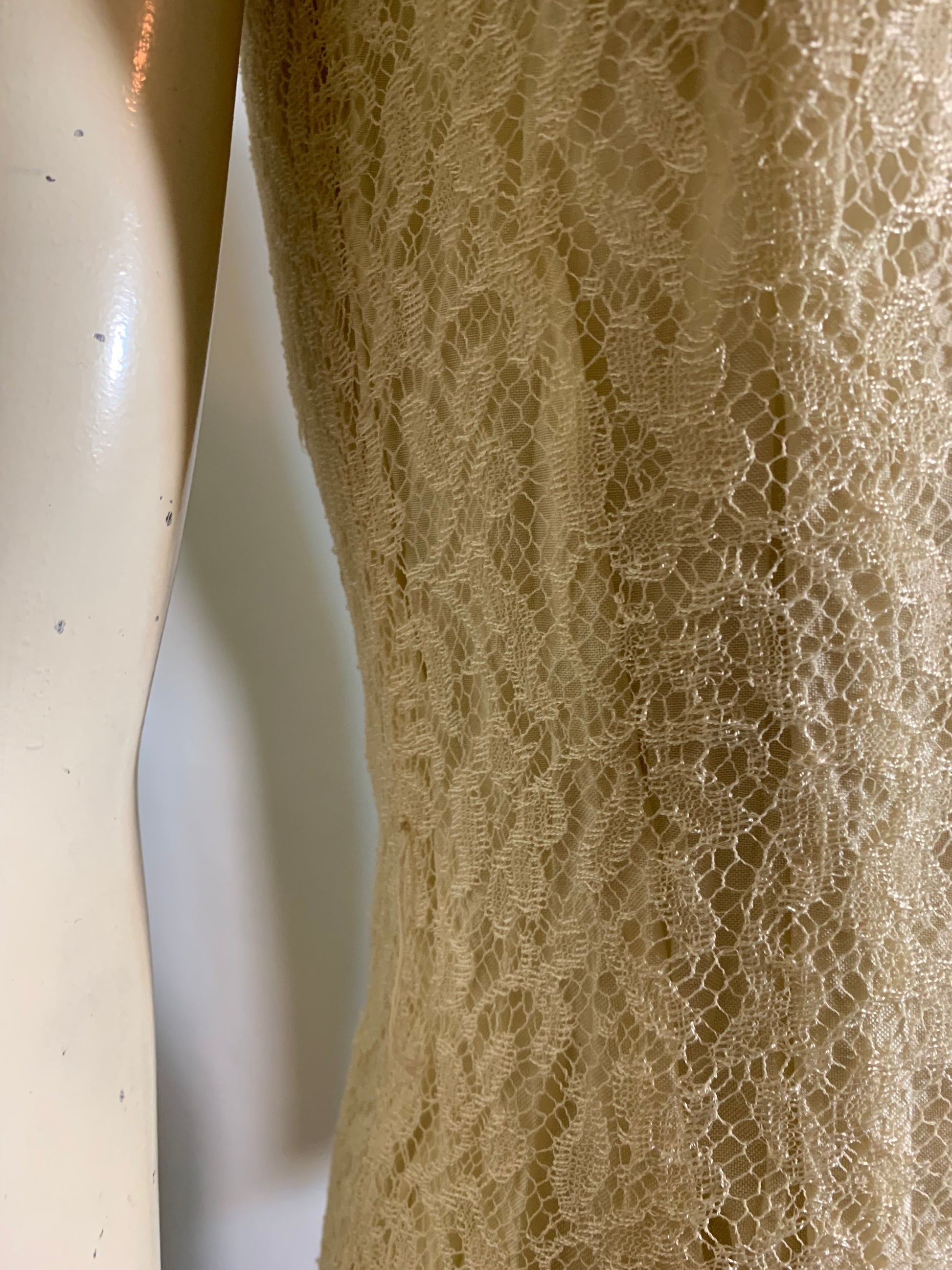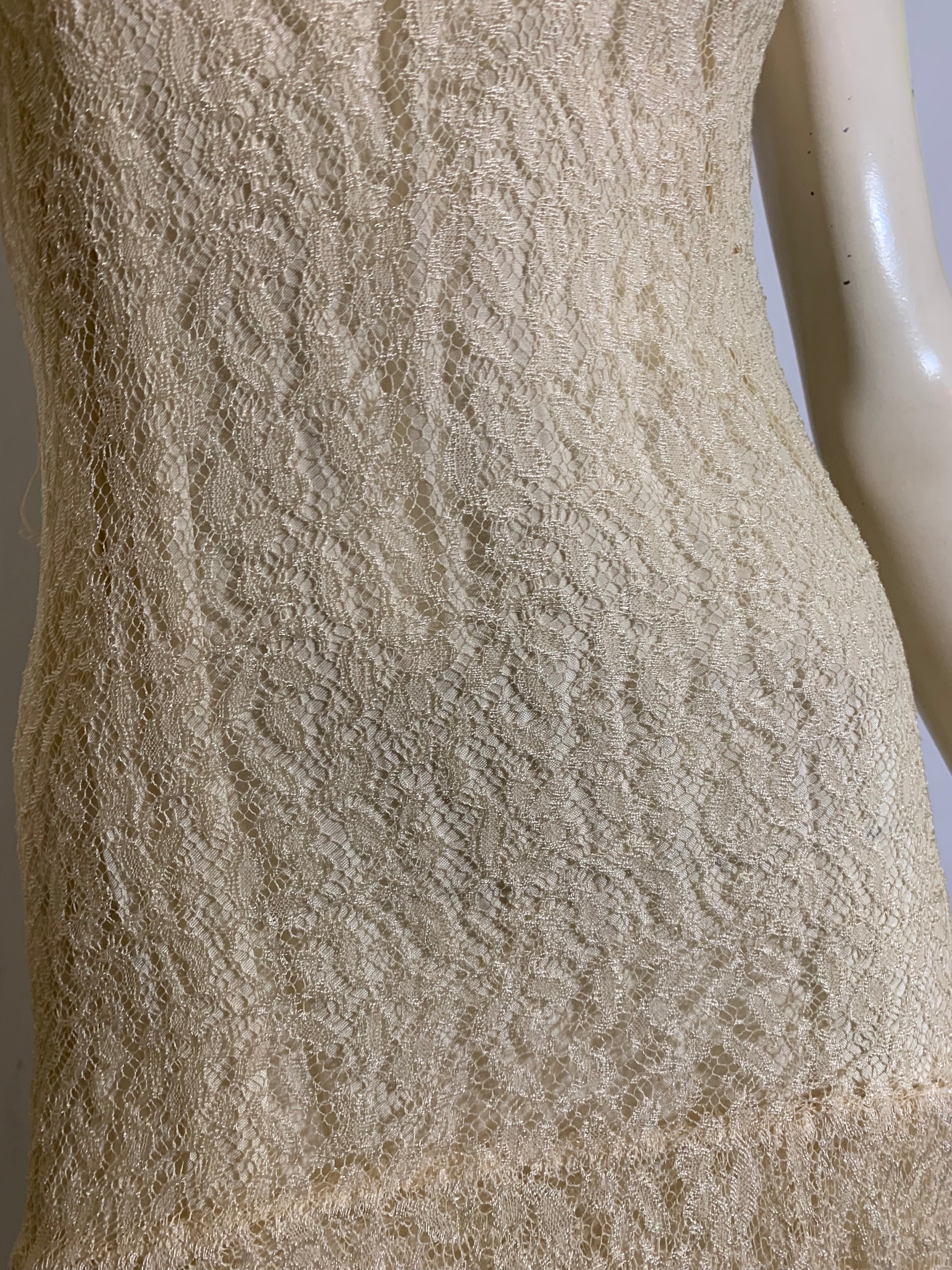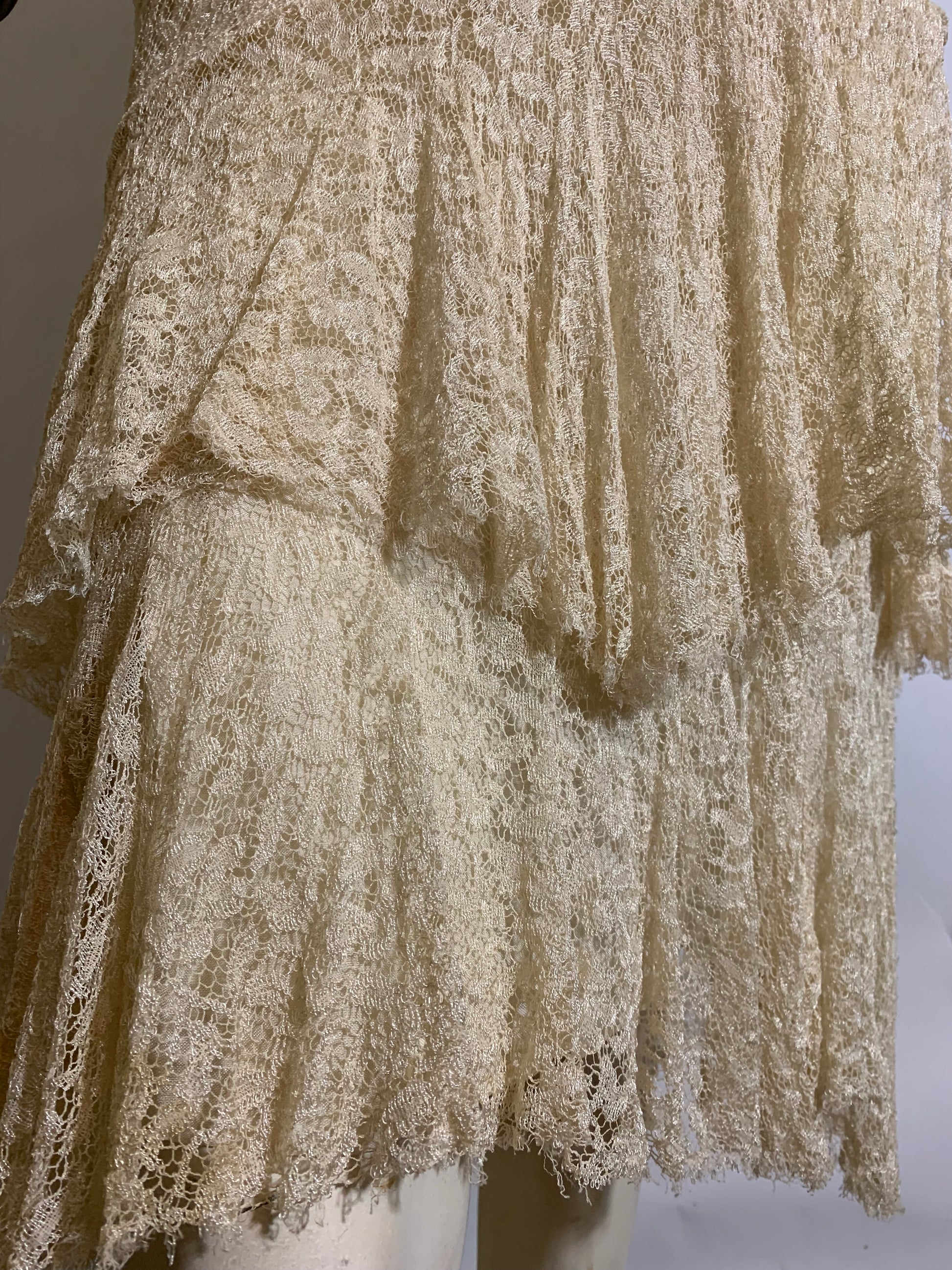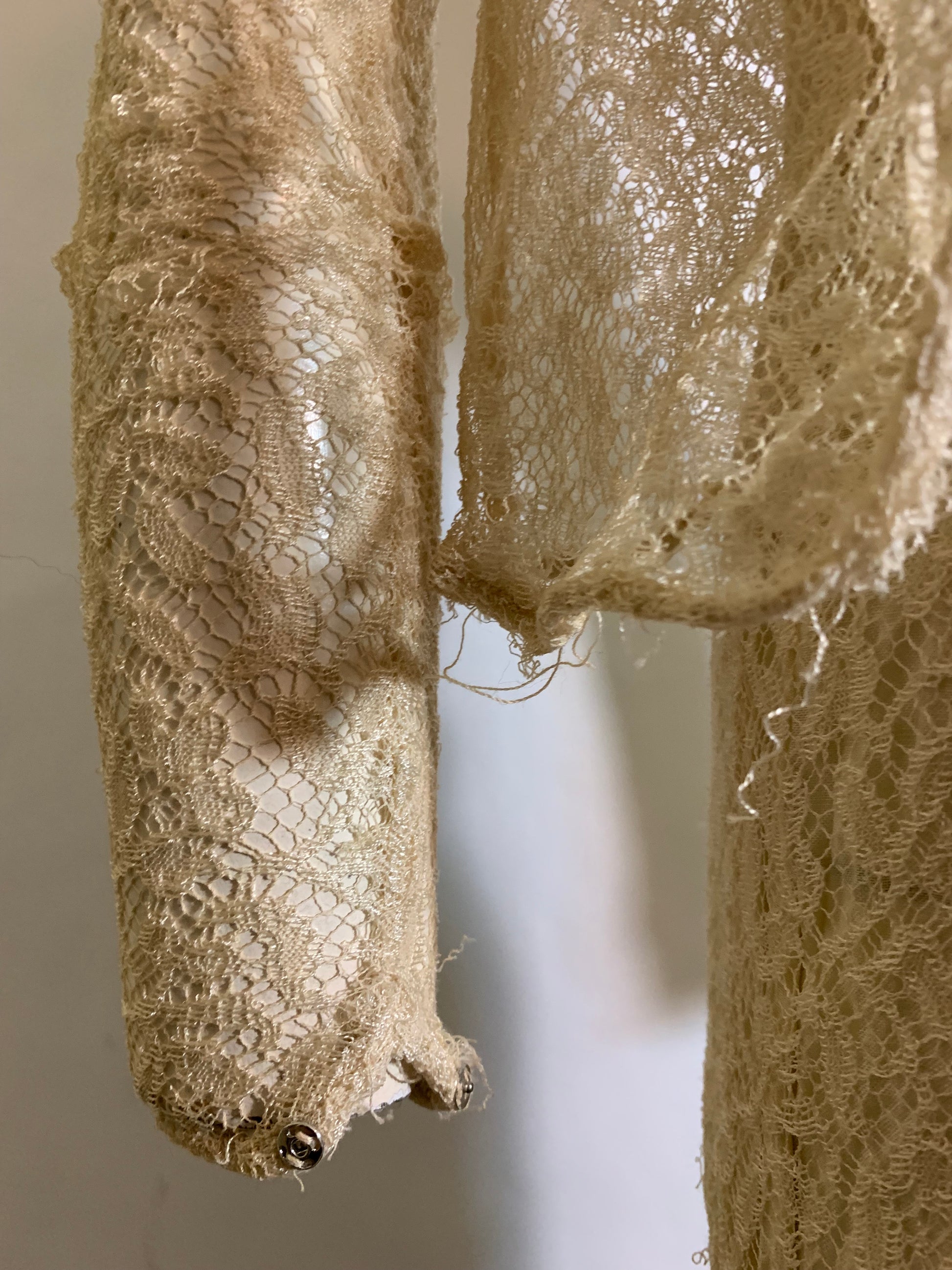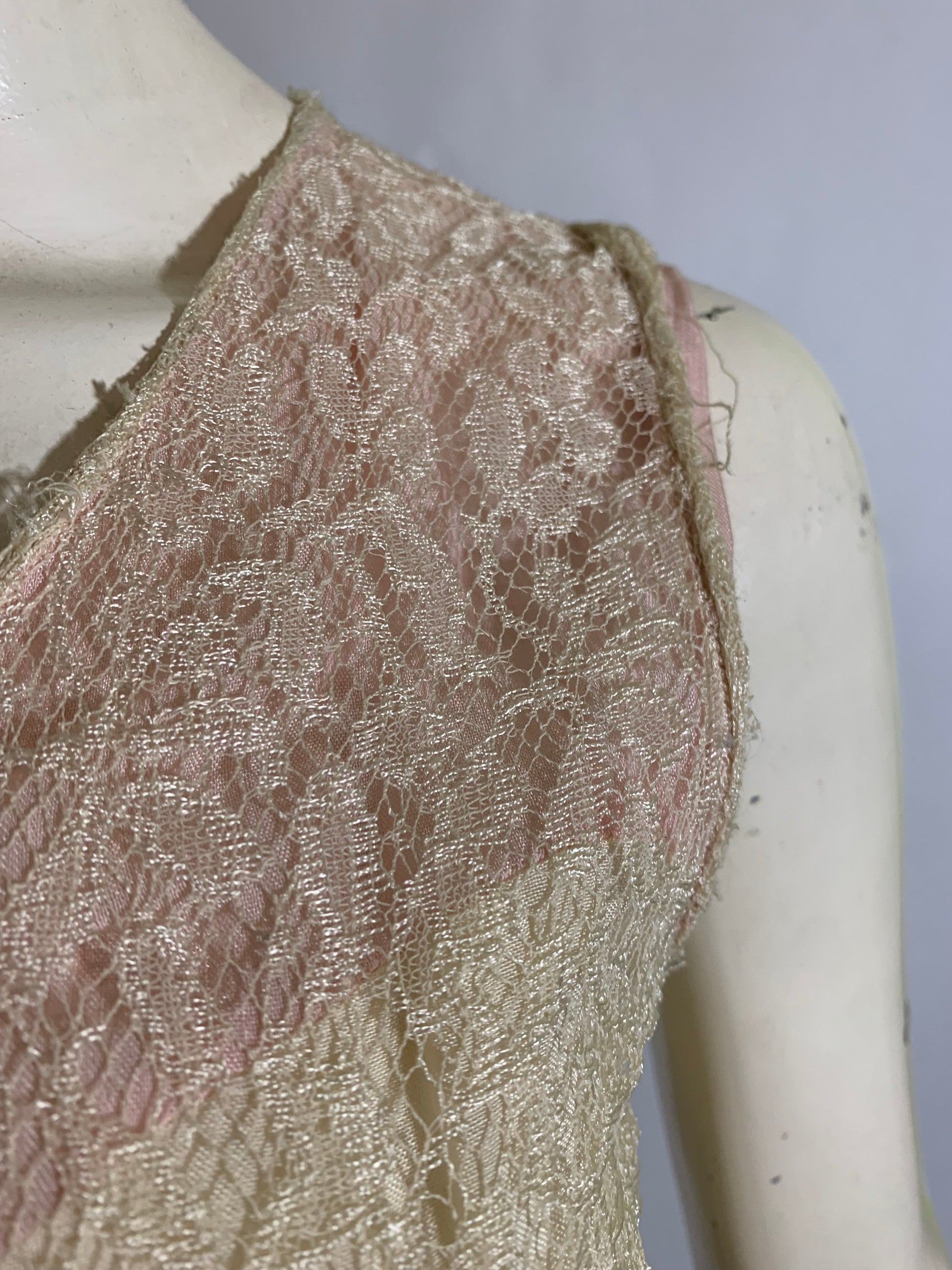 1930s off white sleeveless dress with hanky hem, pink lined neckline, matching long sleeved jacket. Lined. No openings at sides or back- has a little stretch to it. A few small holes and overall wear. AS IS.
