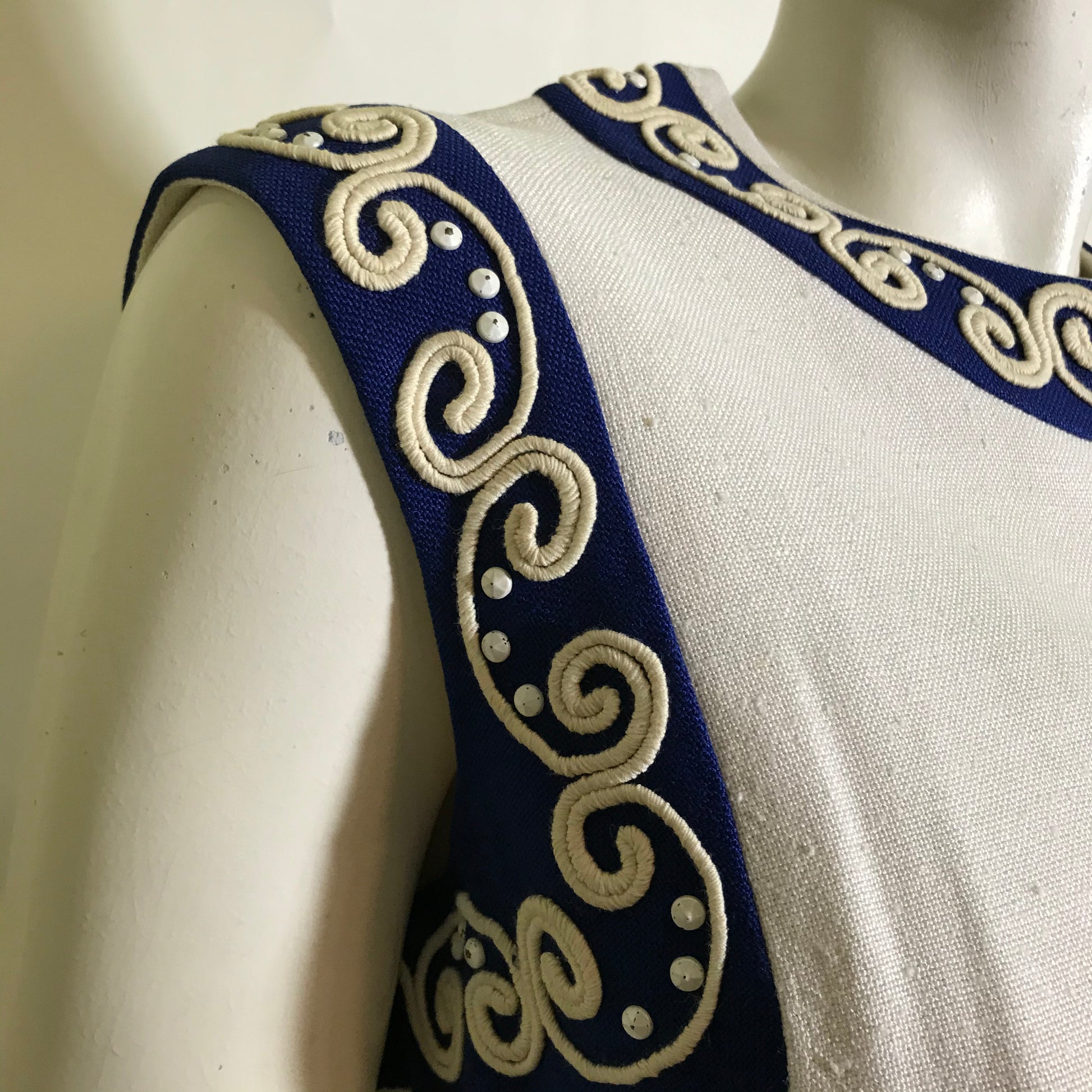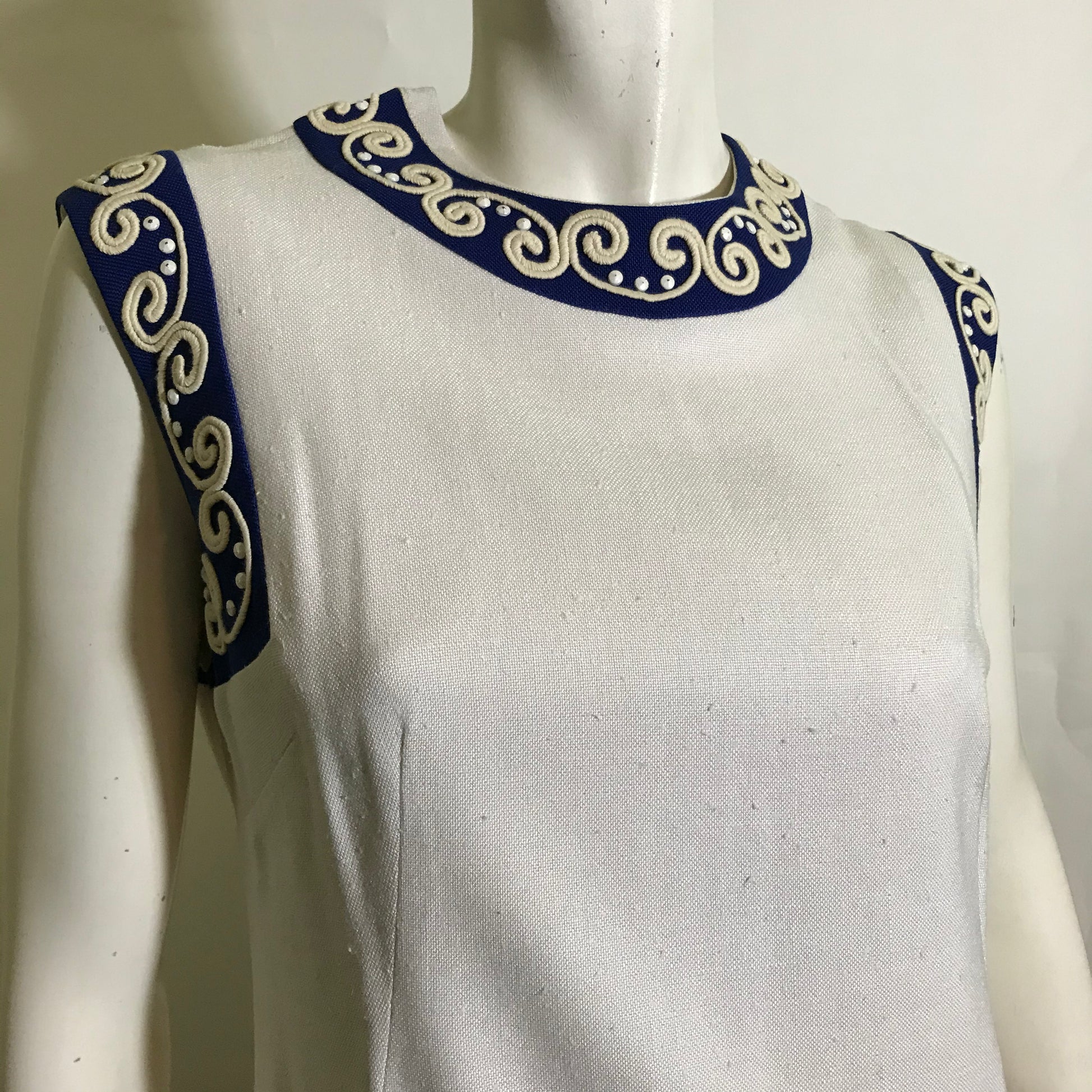 Sleeveless White Linen Weave Rayon Shift Dress with Blue and White Beaded Trim circa 1960s