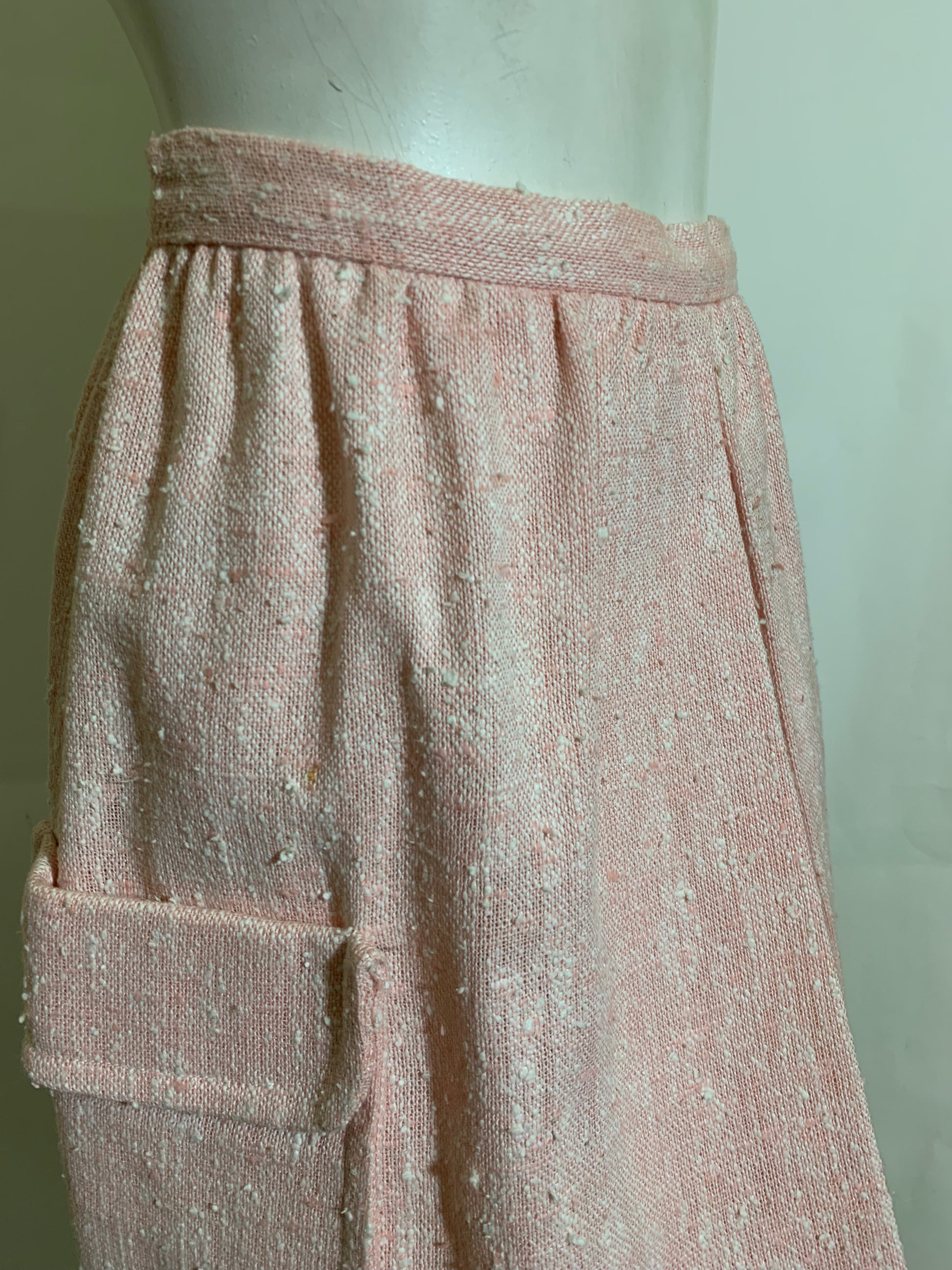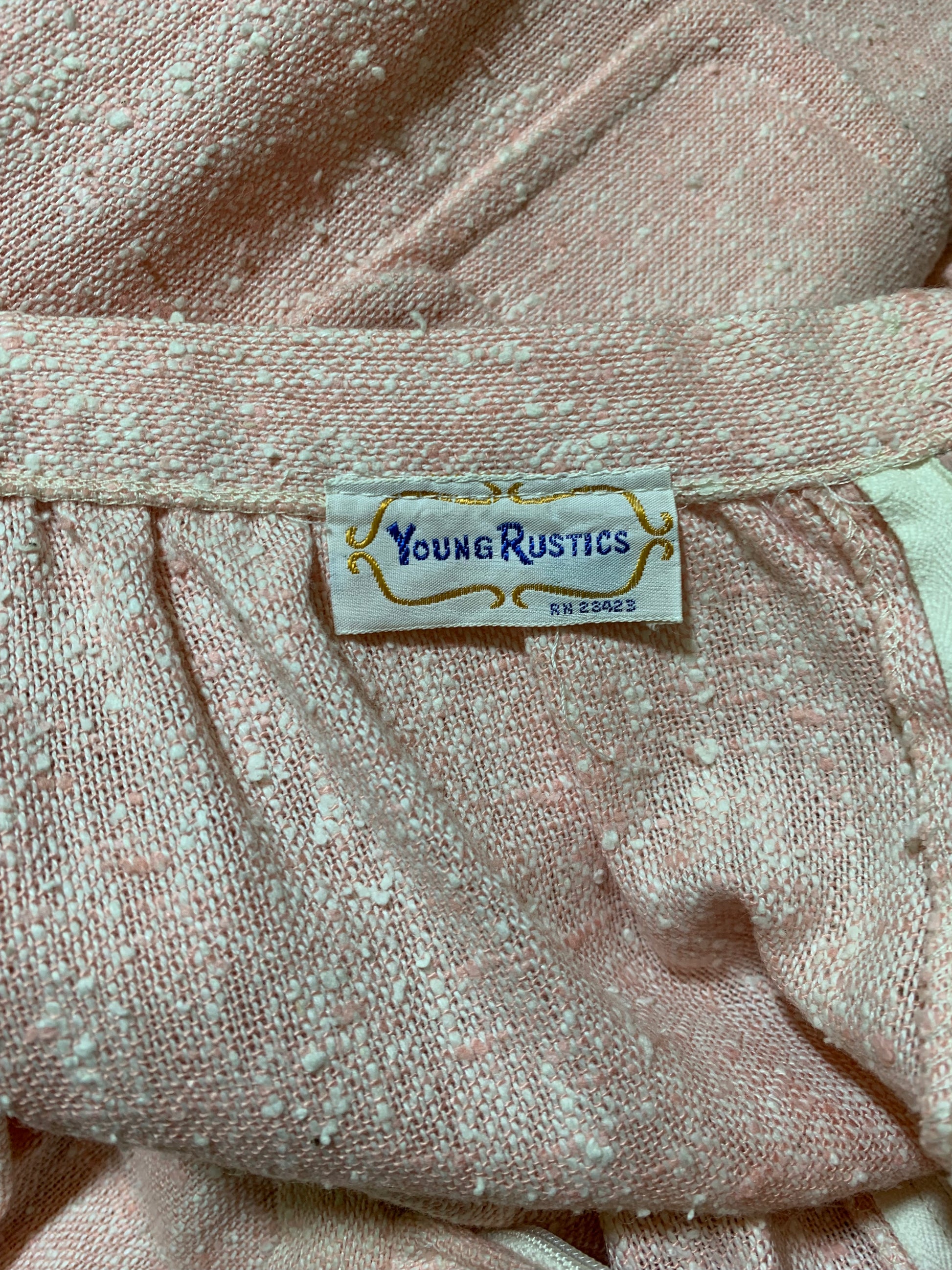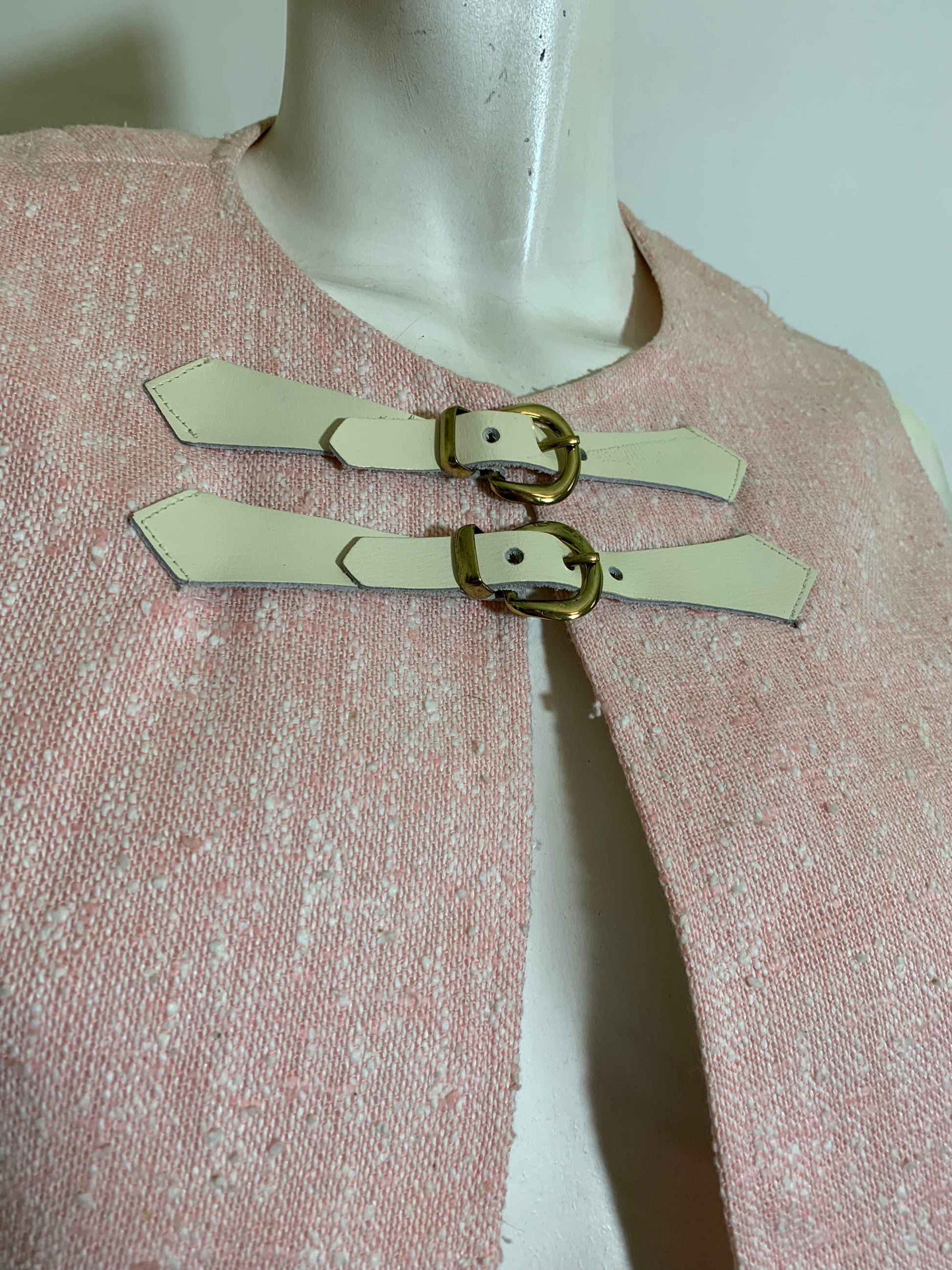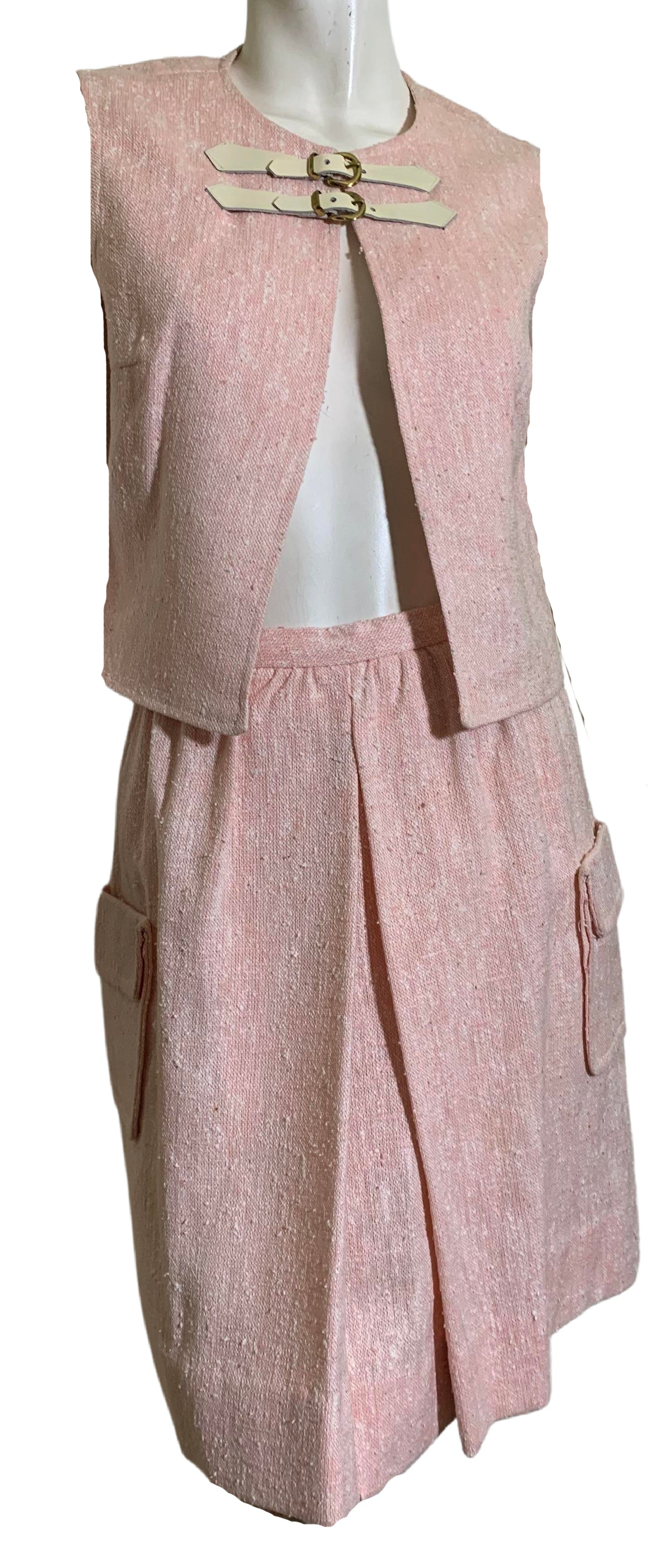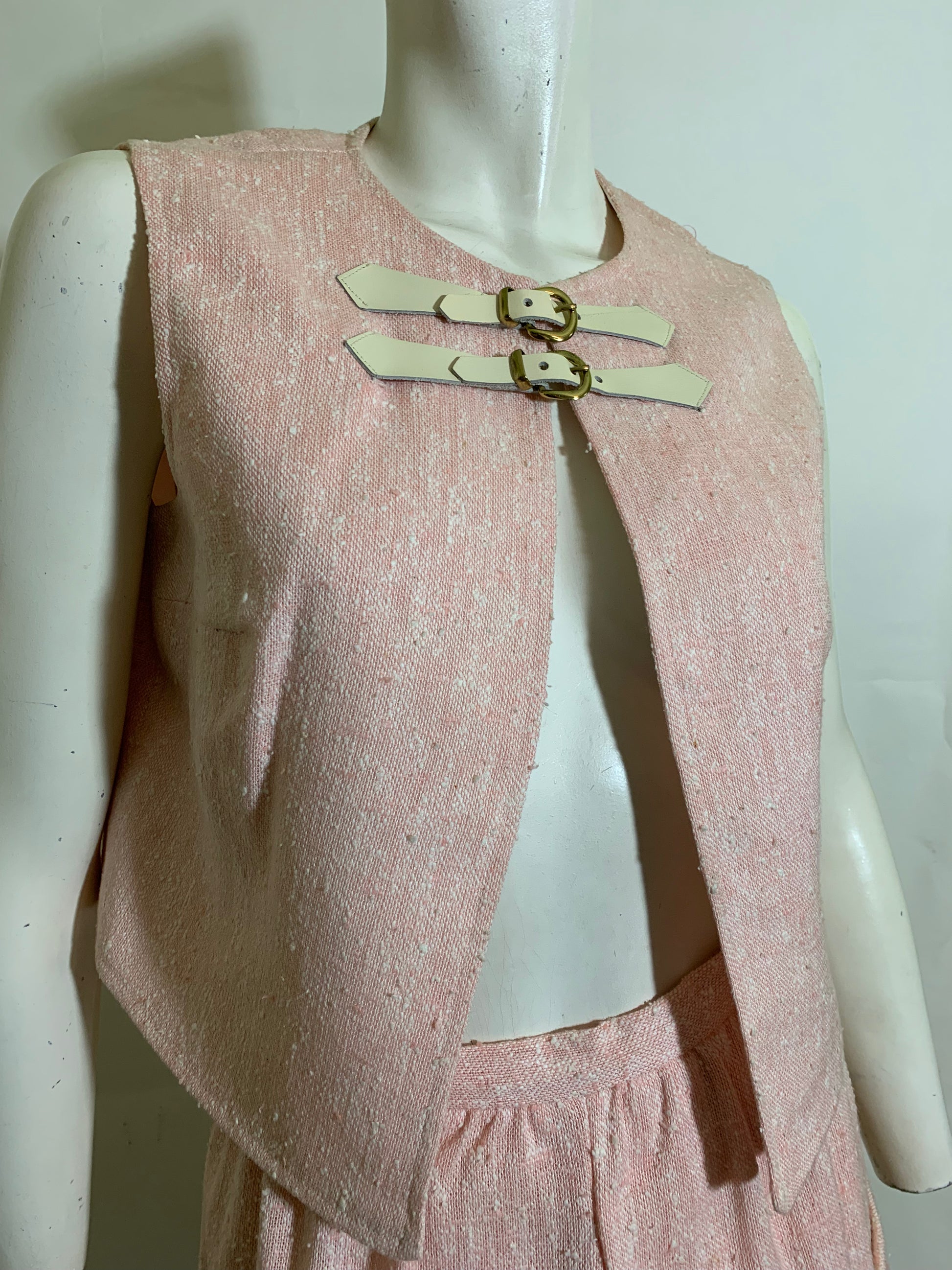 Rose petal pink textured linen weave rayon vest and mini skirt from the 1970s, off white vinyl buckles on vest. Both pieces lined, skirt has zip and button. No flaws.