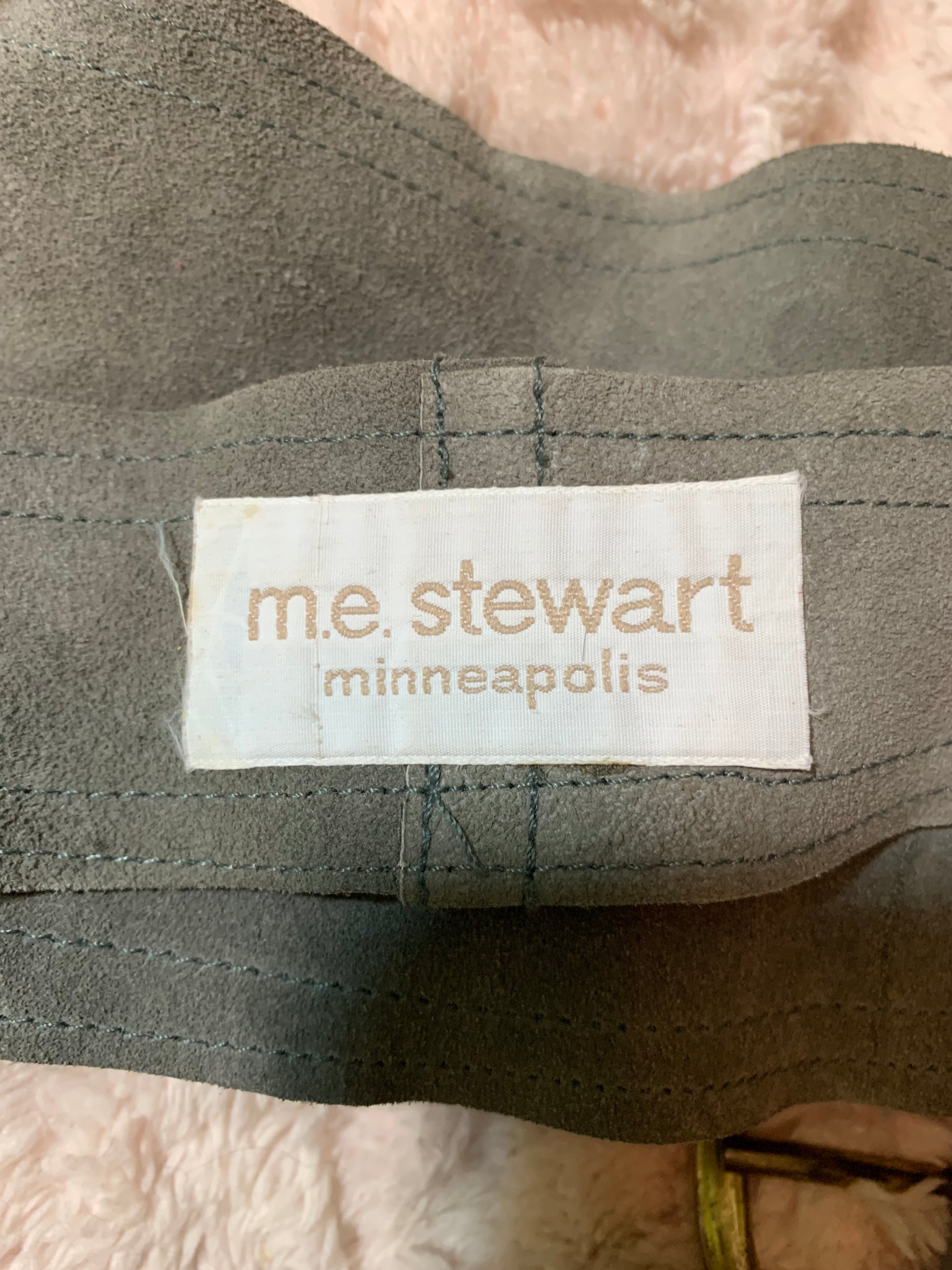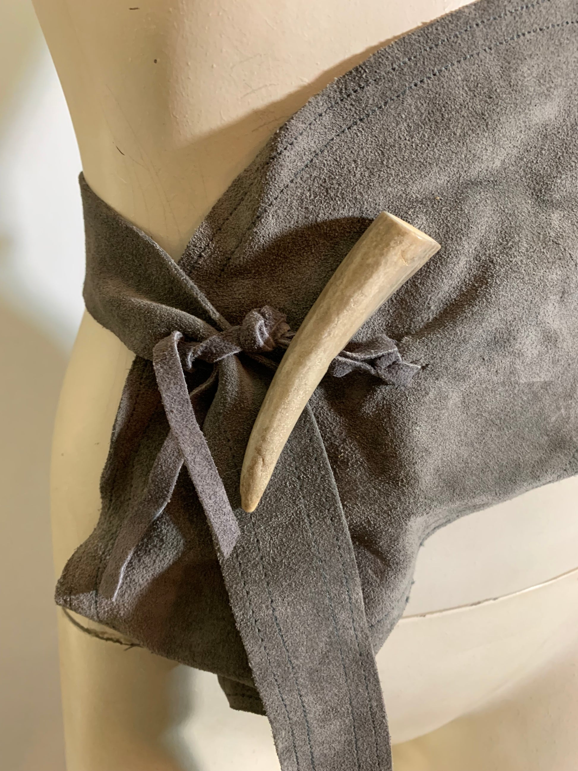 Smoky grey suede 1980s belt with faux horn and tie closure. No flaws, fits a range of sizes. By M.E. Stewart.