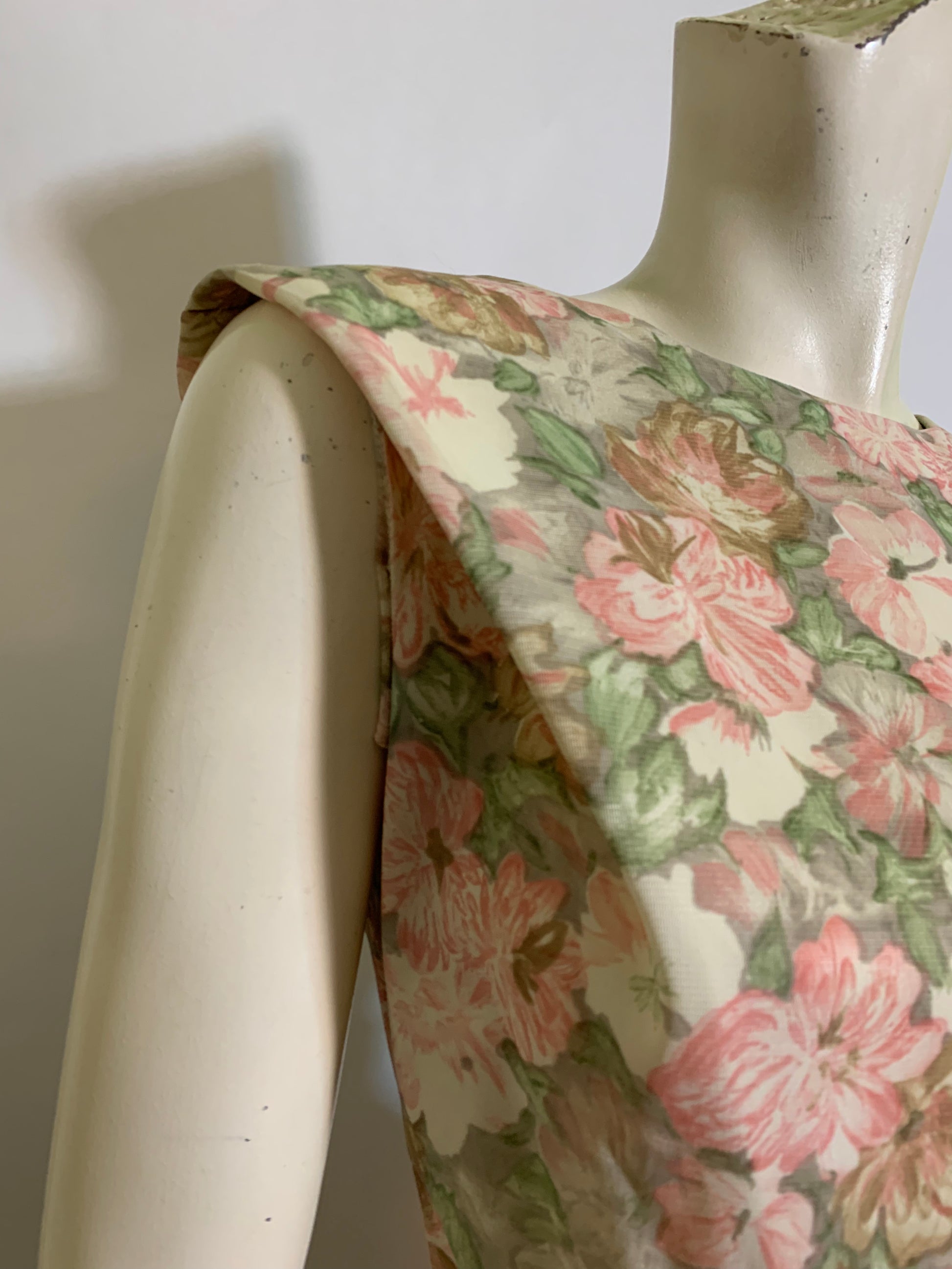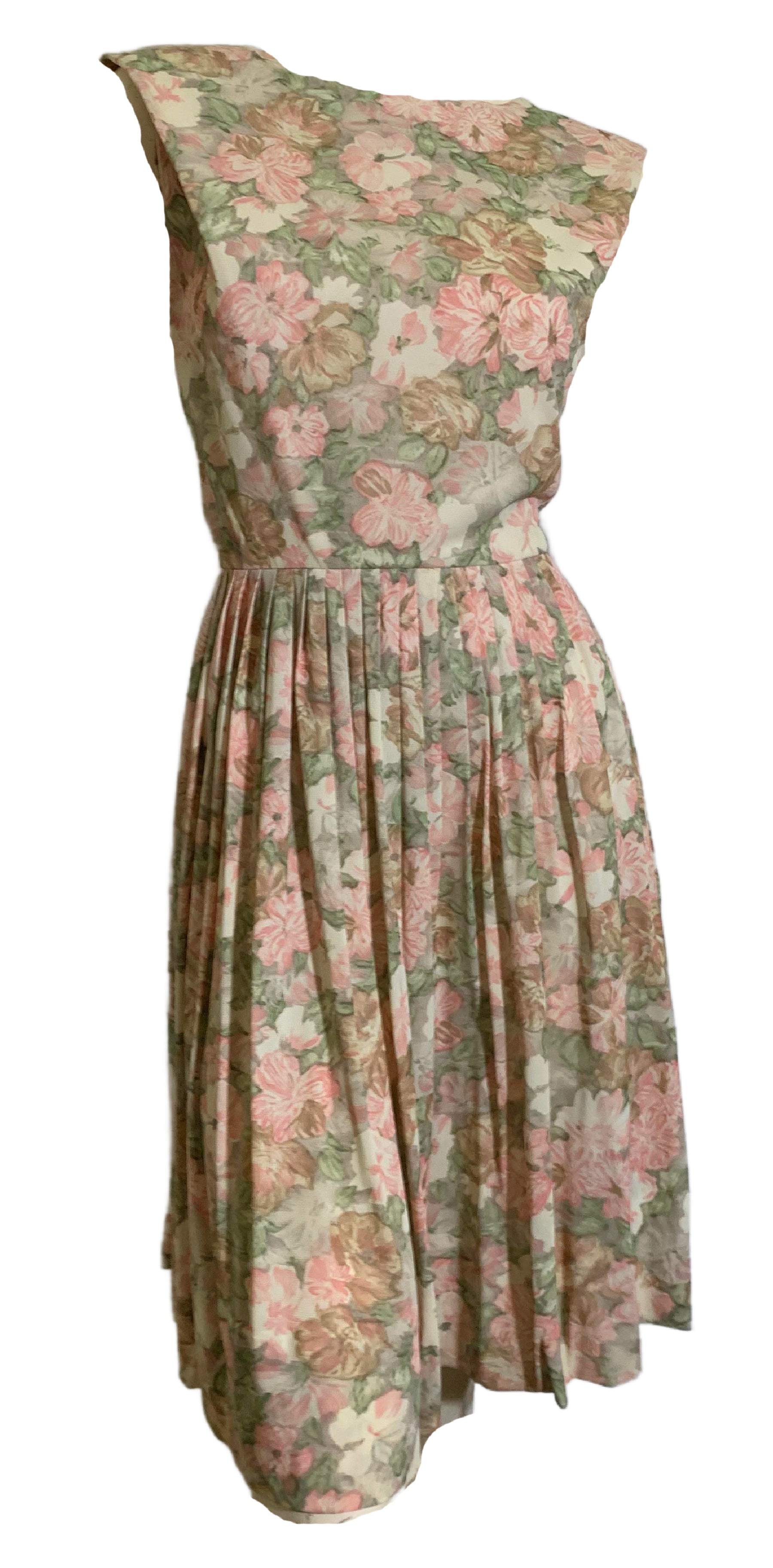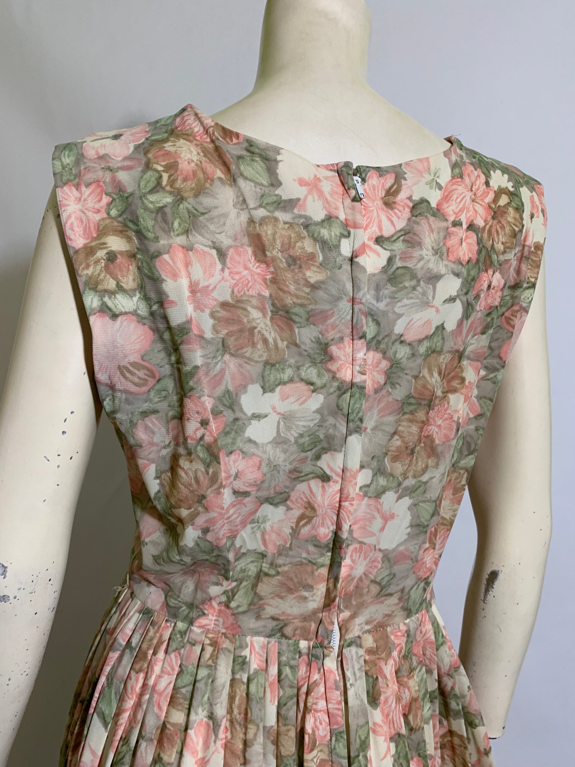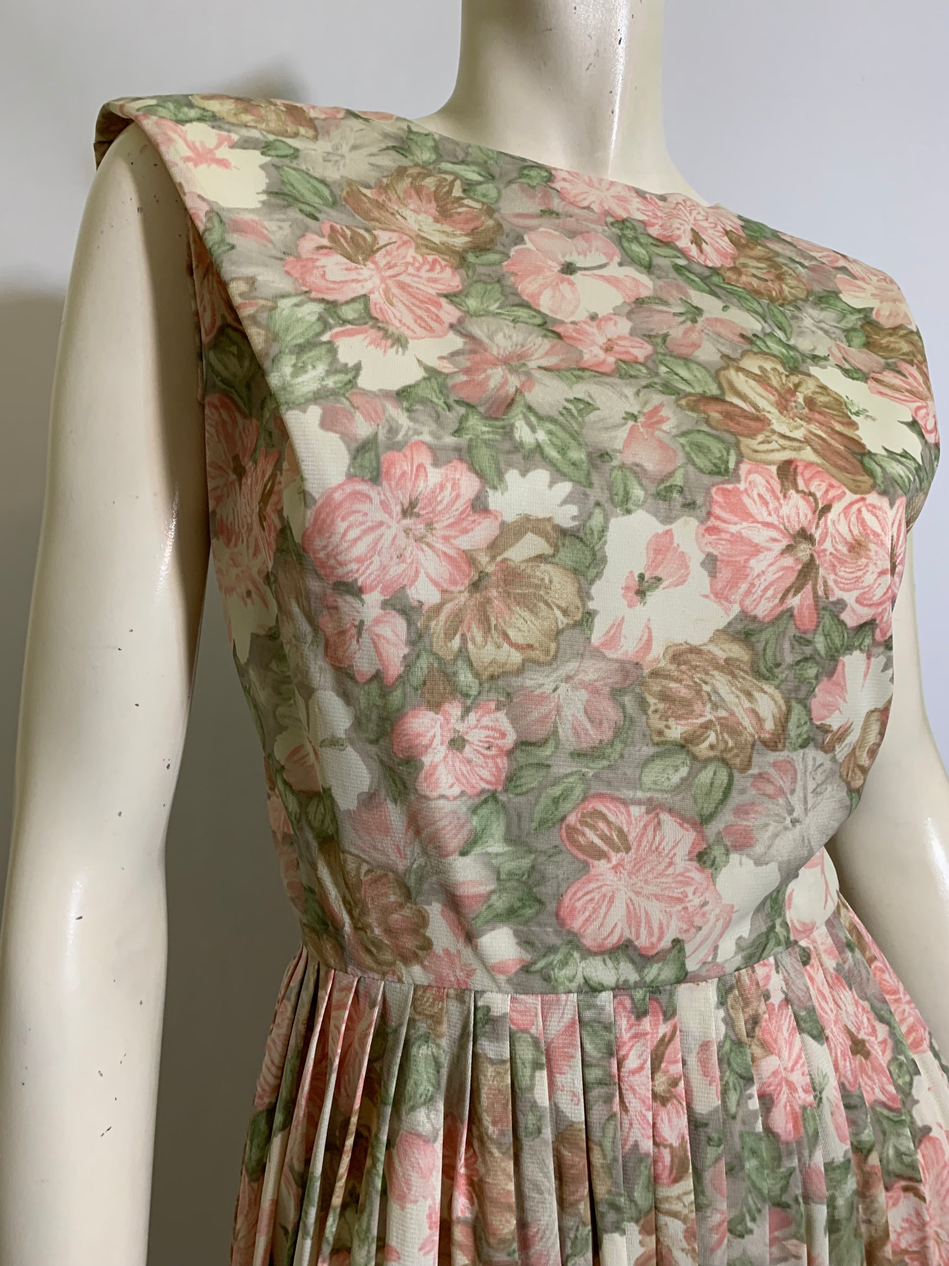 Lovely peach floral print pleated skirt nylon jersey 1960s dress with pleated detail at upper bodice/shoulders. Sleeveless, back metal zip. No label, no flaws.
