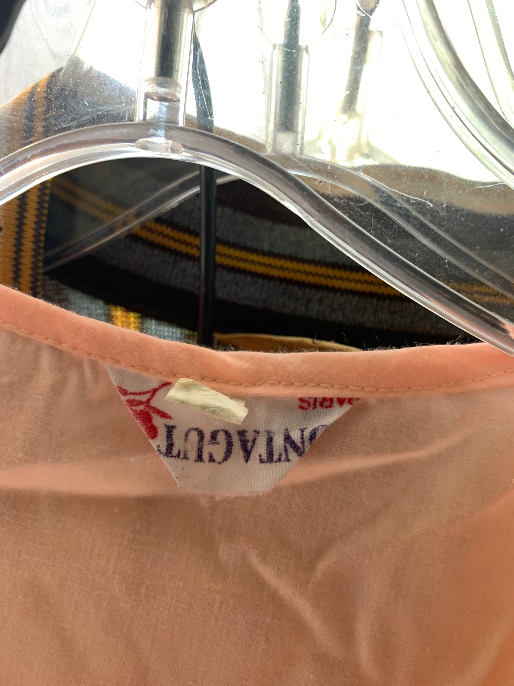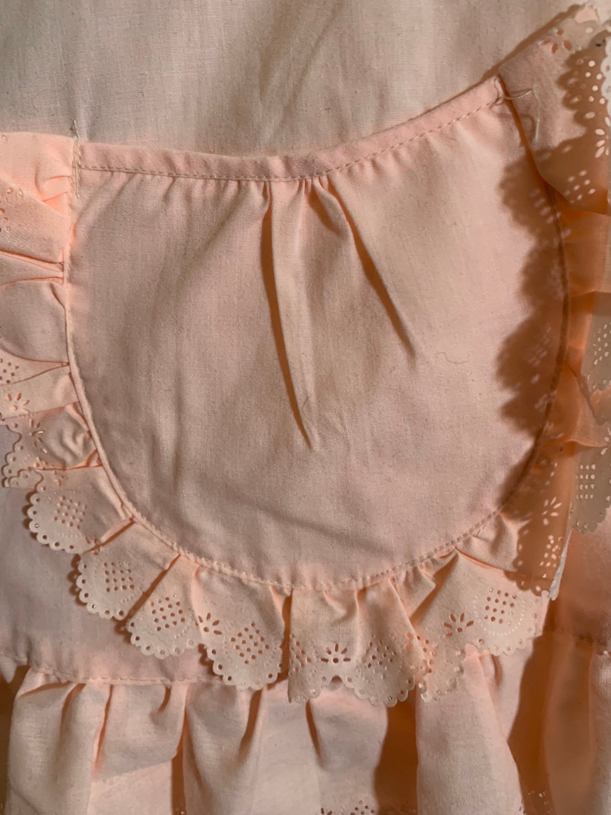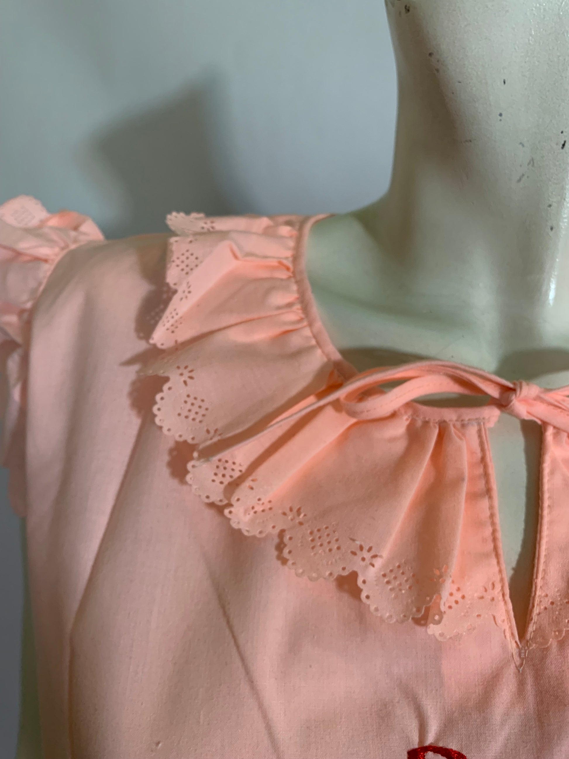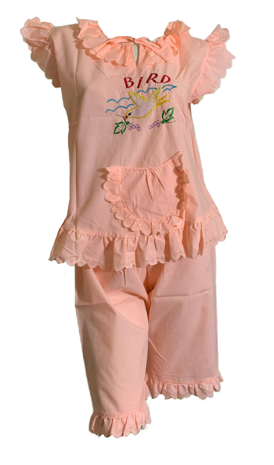 Brand new old stock peach cotton 1930s inspired pajama set with embroidered "BIRD" and bird design. Bird body is done in an interfacing white texture. Bow at neck, ruffled shoulders, elastic waist on knee length pants. No flaws. Really not sure of dating, definitely not 1930s though they very much look like it!