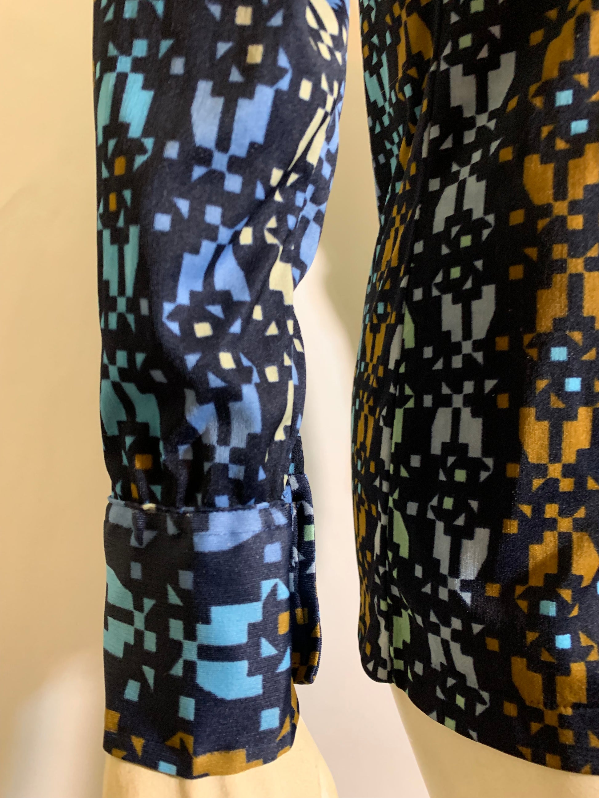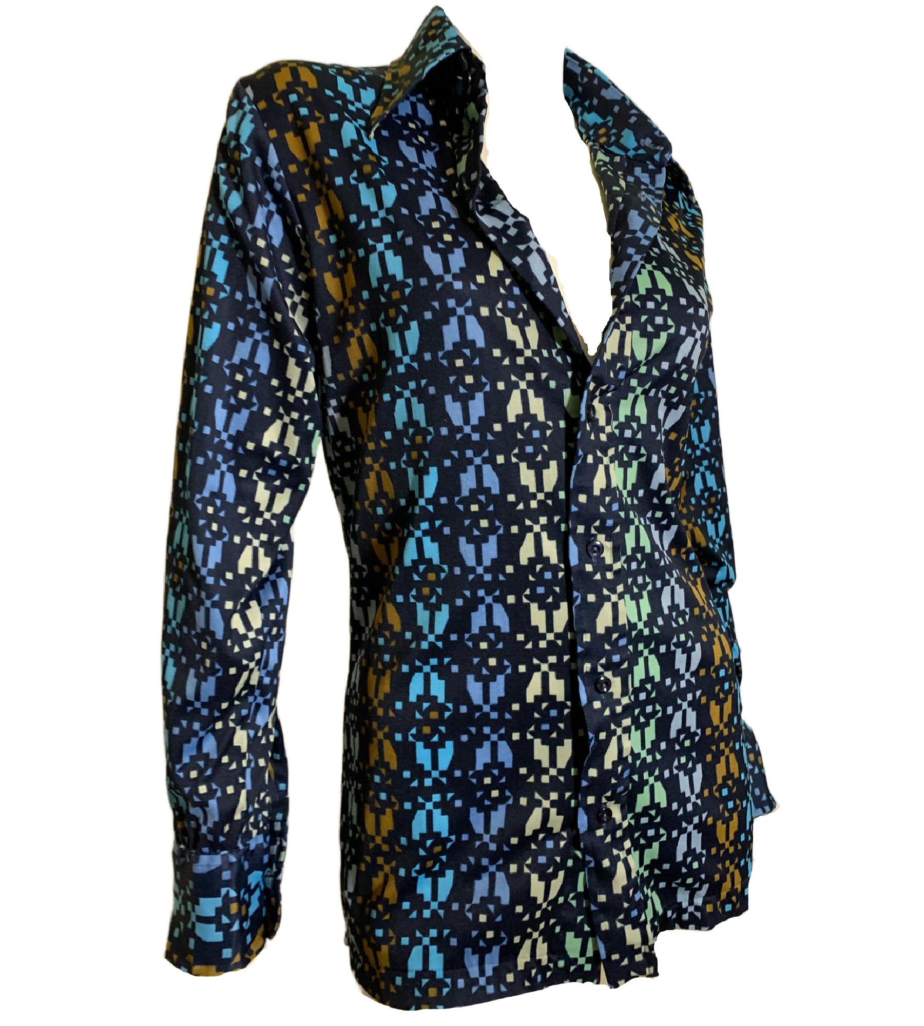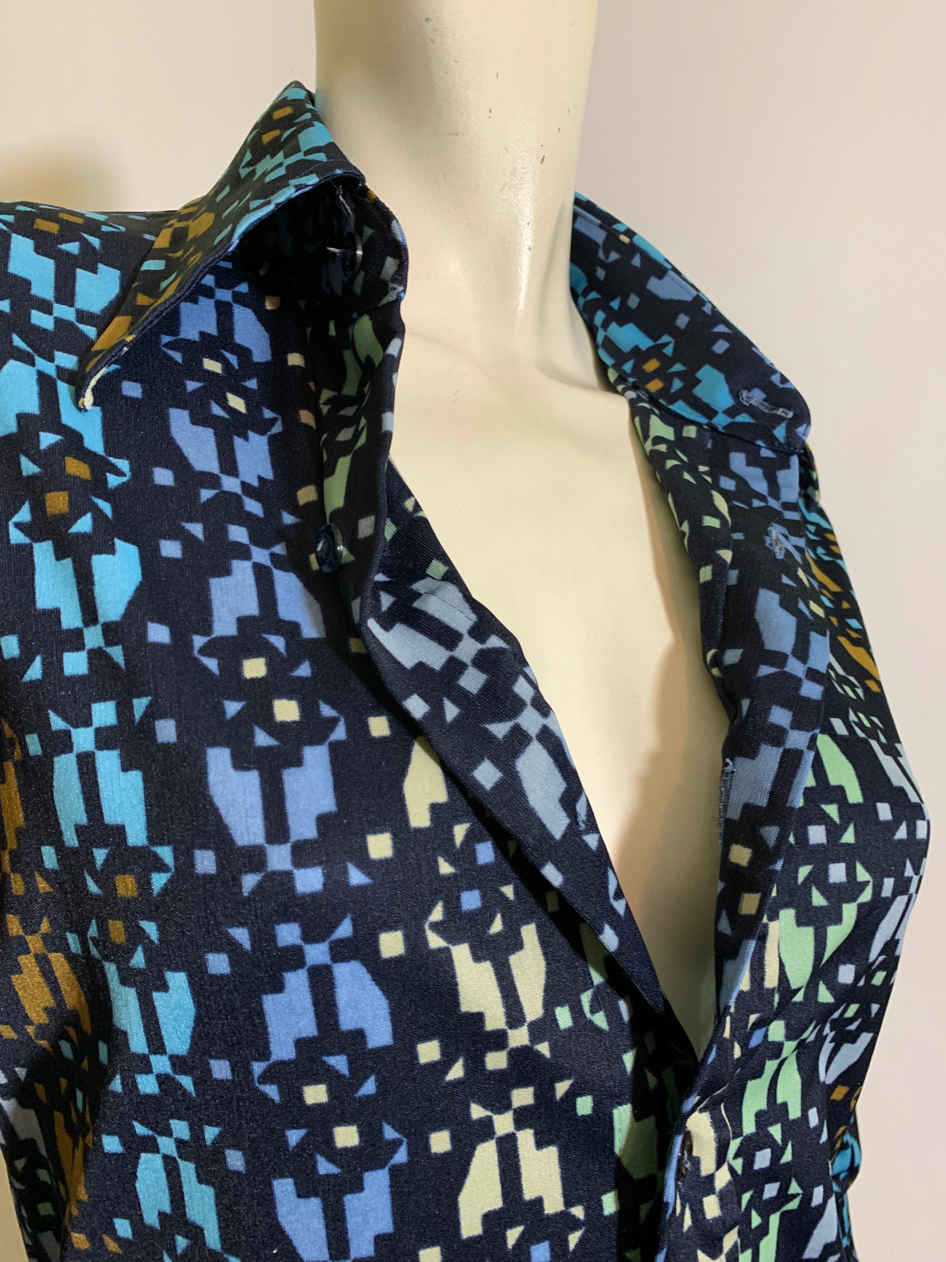 Poly blend deep blue dagger collar shirt with stylized print that reminds me of Space Invaders or Galaga! By jon norman designs, size S. No flaws. Men's shirt easily worn by anyone it will fit!