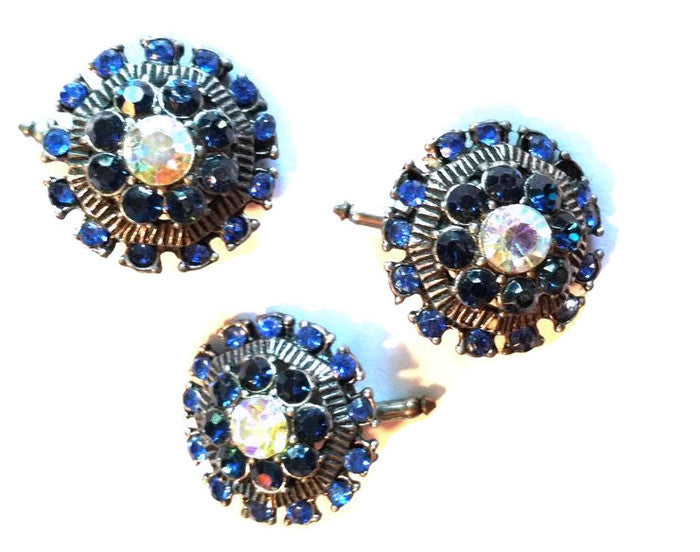 Sparkling Bold Blue and Clear Rhinestone Button Studs Set 3 circa 1940s