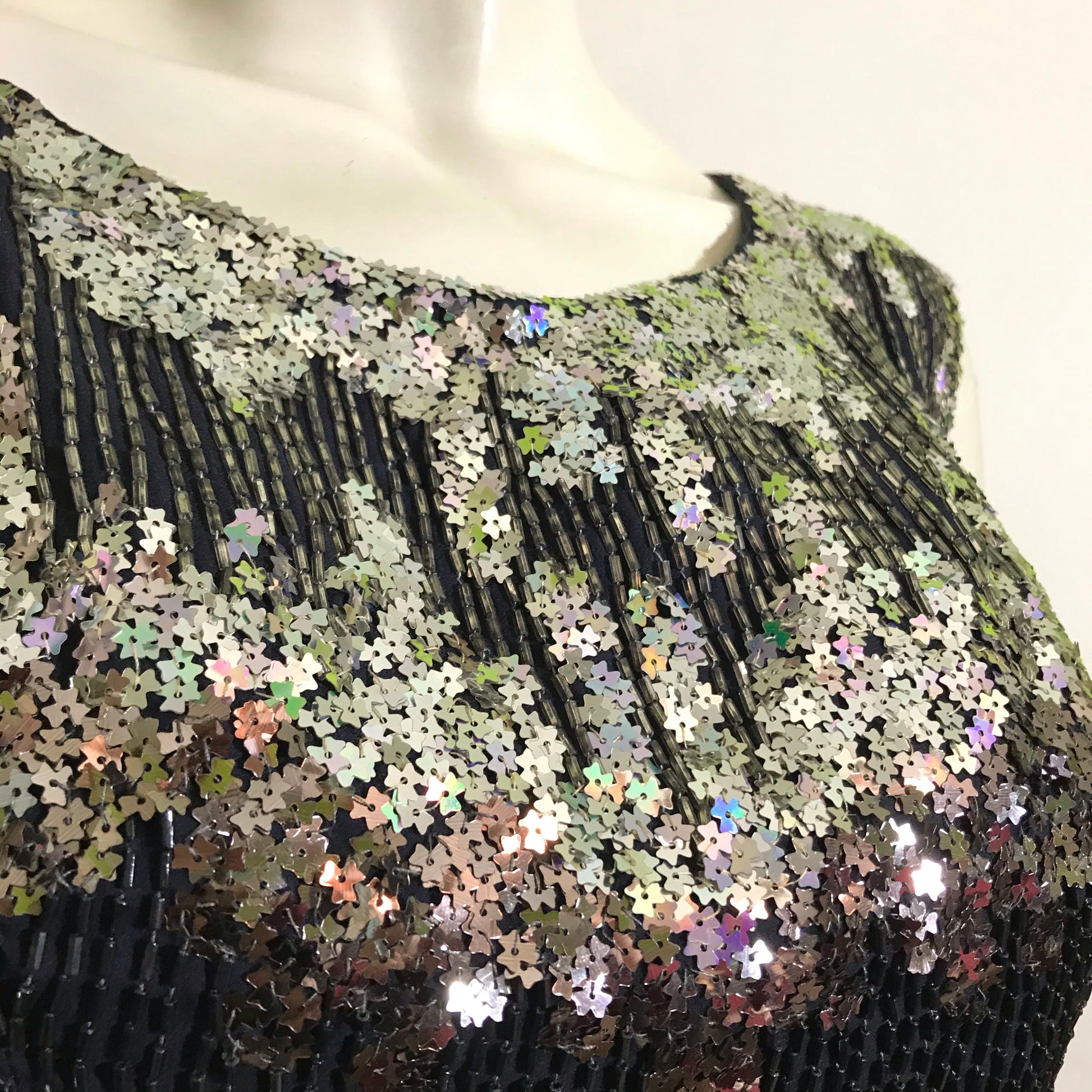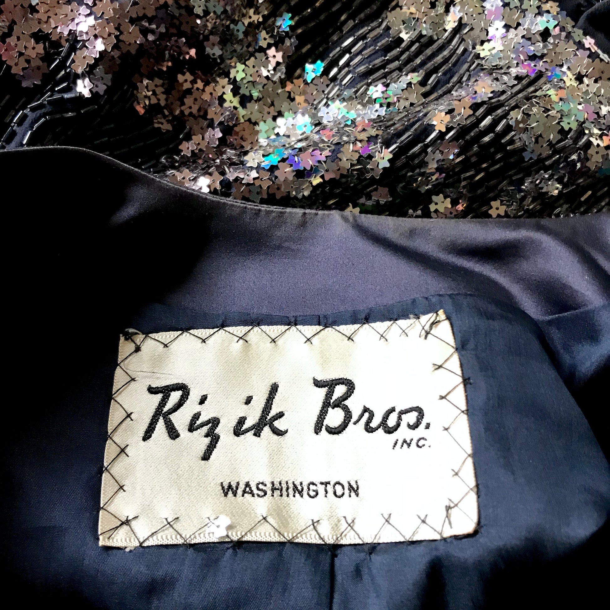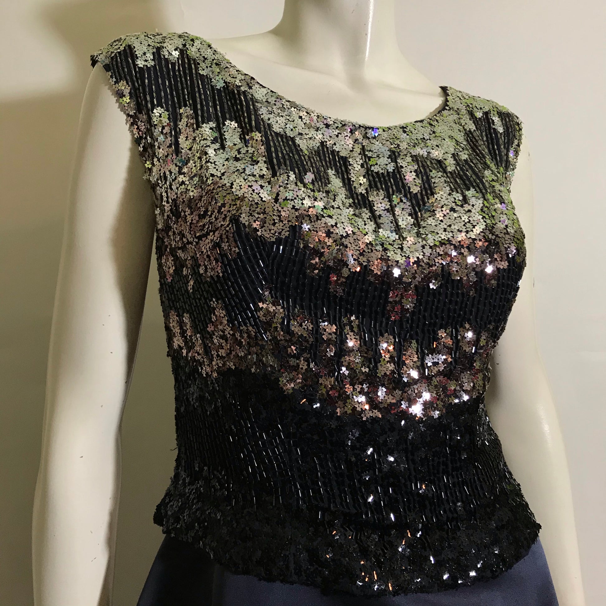Incredible 1960s deep blue silk dress set. Three pieces- dress has sheer silk bodice (not meant to be worn alone) and full skirt with back metal zipper. Then there's the shell! AMAZING blue silk sleeveless snap back shell loaded with gorgeous shimmering sequins in shades of blue and star shapes. You can wear it with something else for more versatility! Matching silk jacket. No flaws. From Rizik Brothers of Washington.