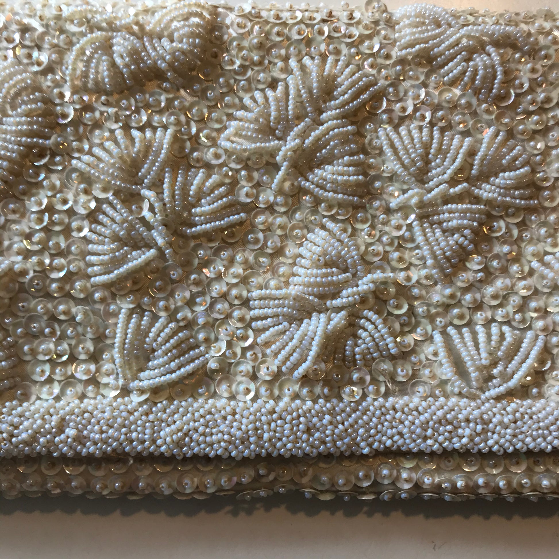 1960s off-white satin beaded envelope style evening bag, made in Hong Kong. No flaws.