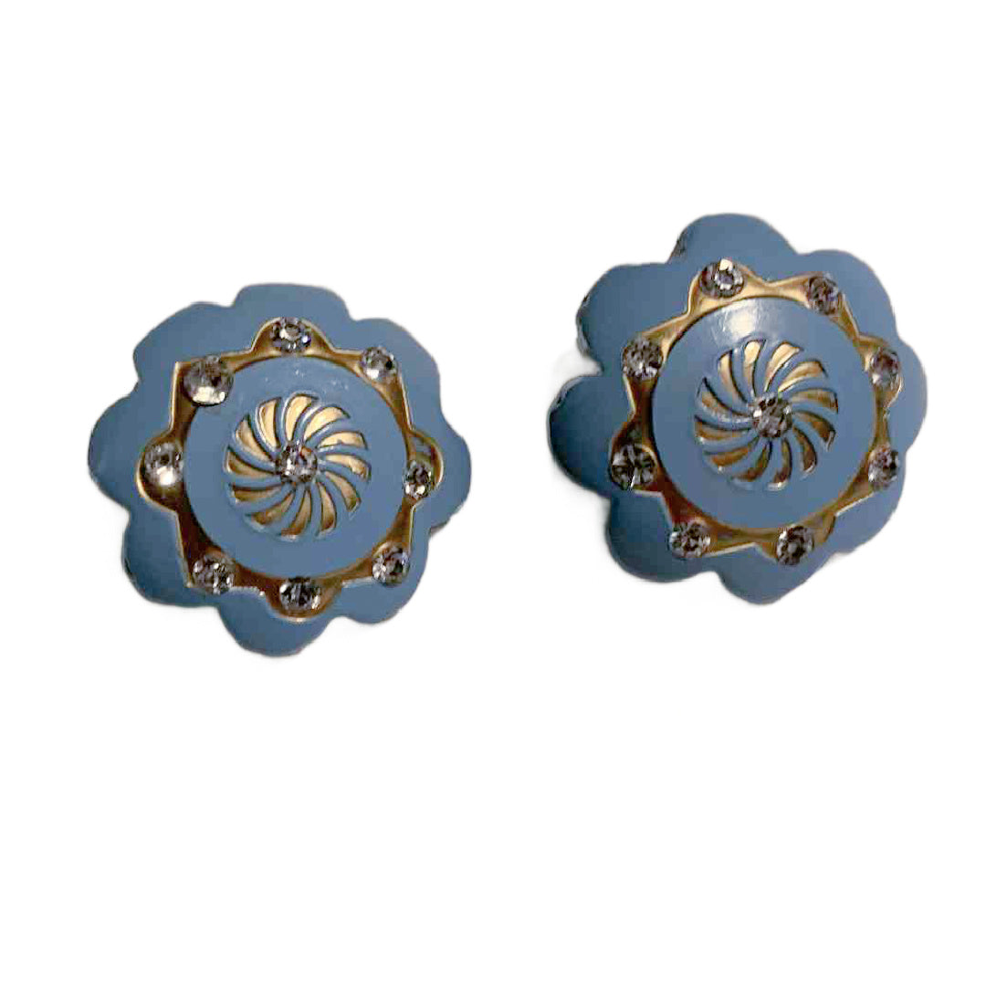 Steel Blue Carved Plastic Clip Earrings with Gold and Rhinestone Accents circa 1950s