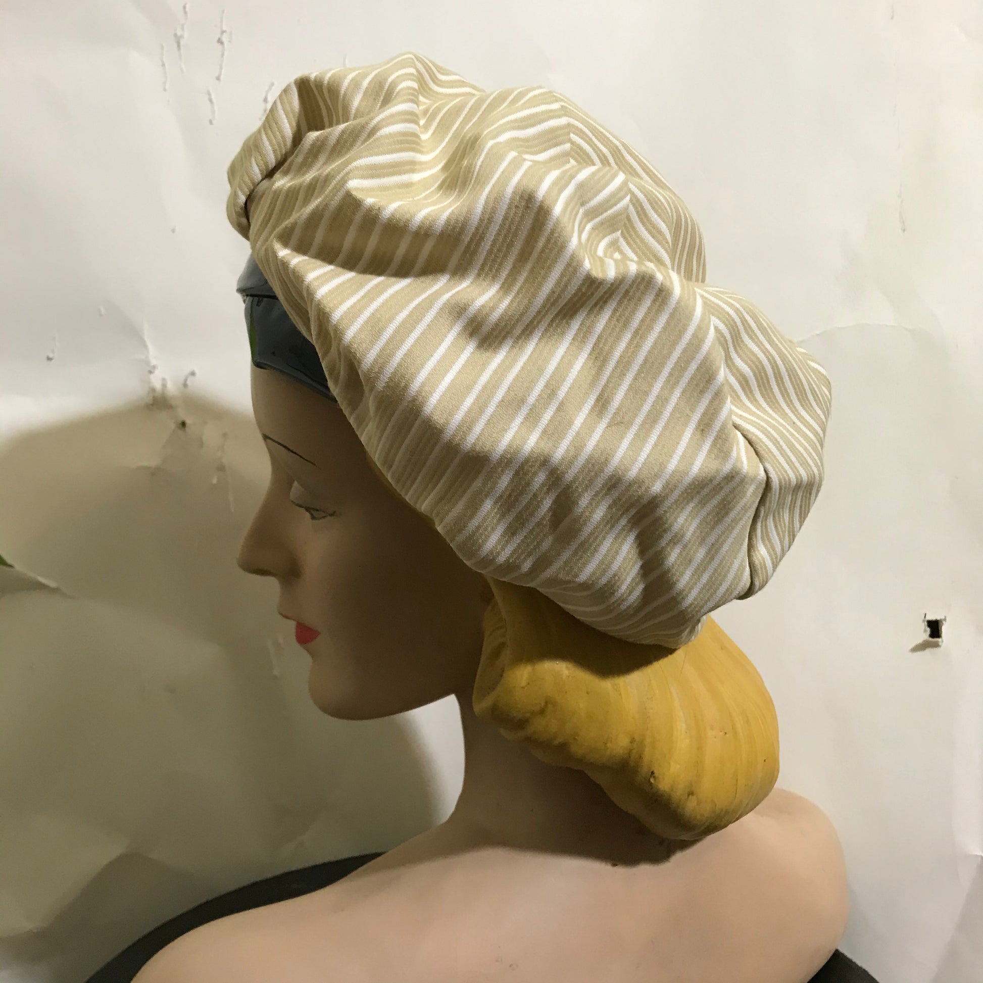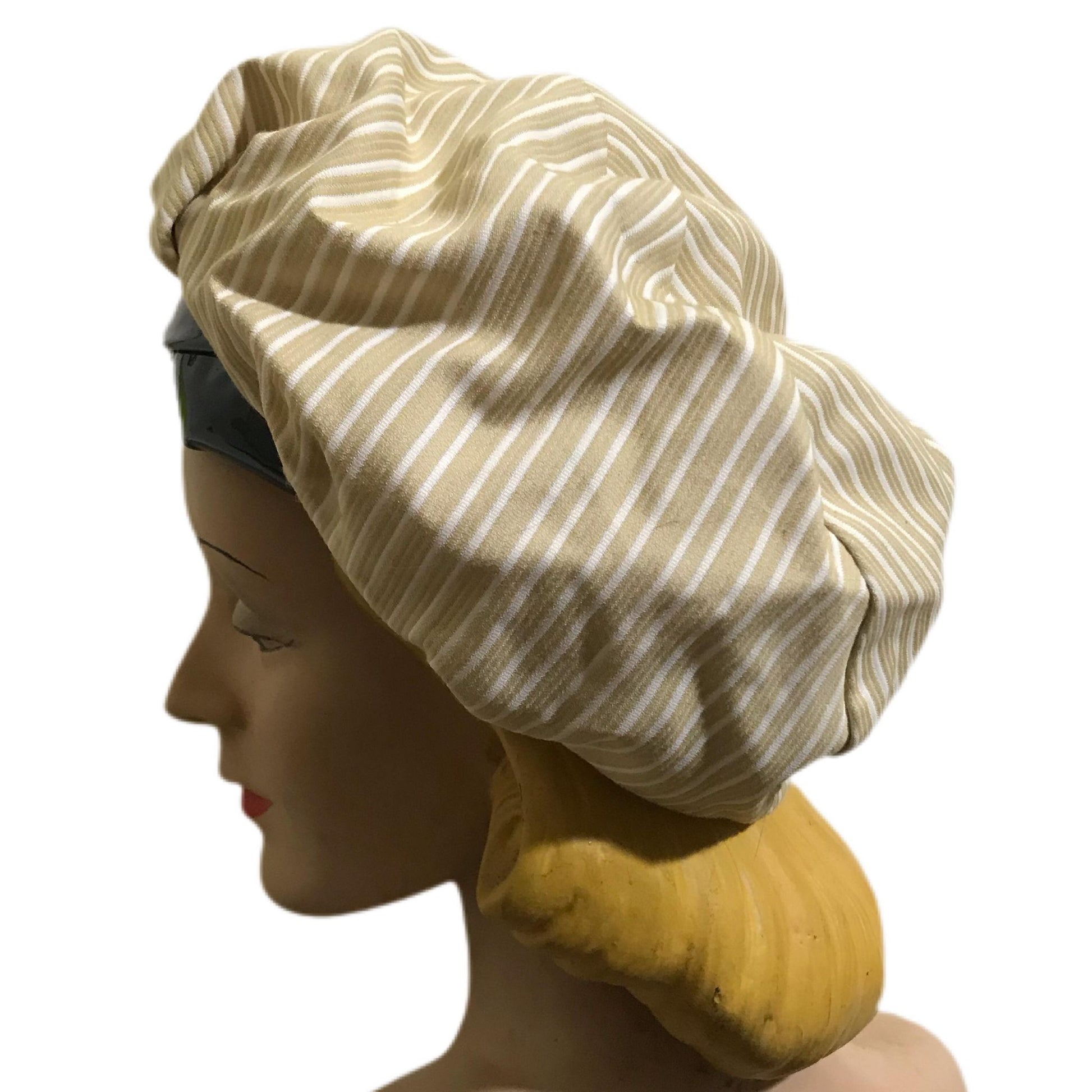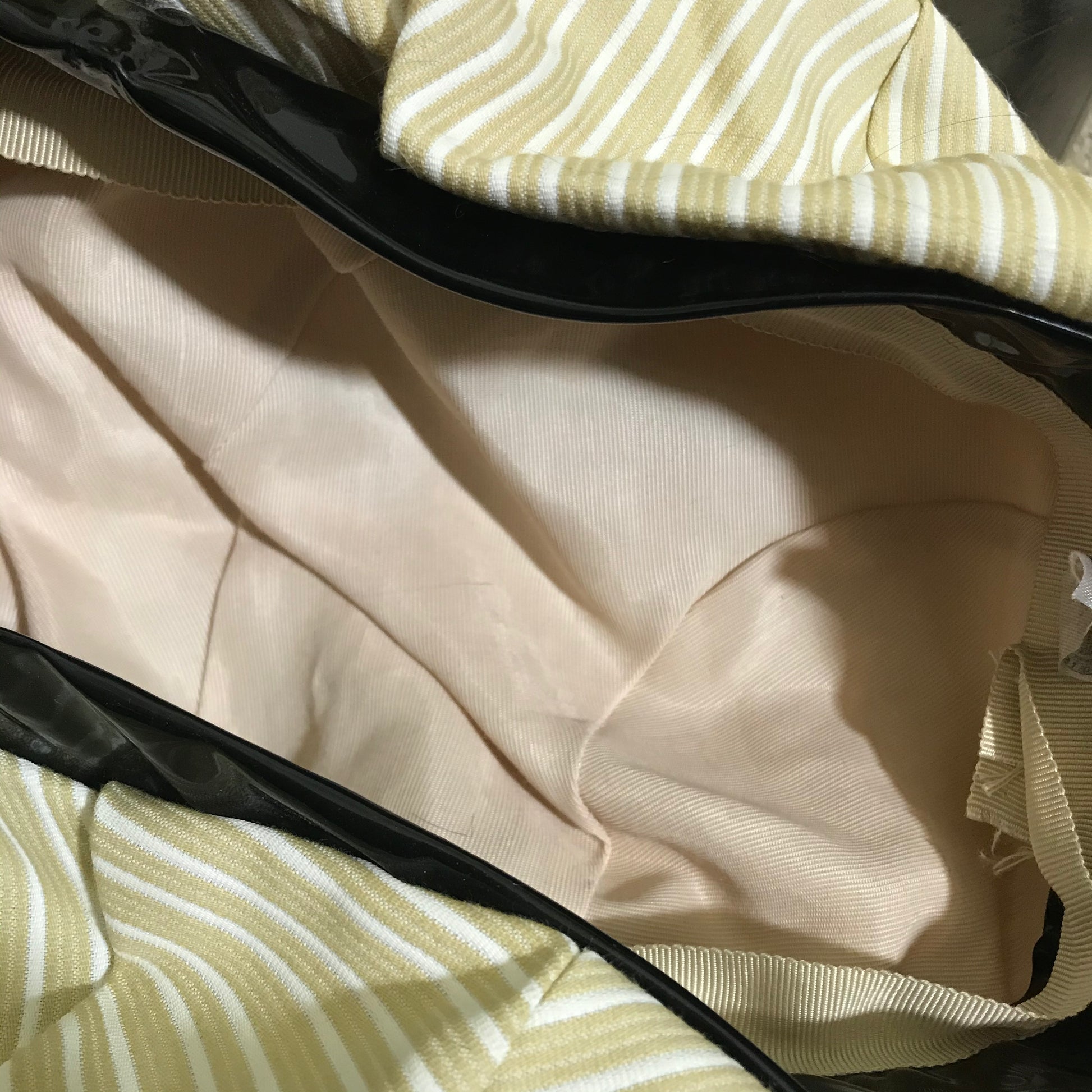 Tan & white striped structured bonnet hat and matching handbag with black patent vinyl trim! SO cute! Hat has no flaws, no label- size 22. Handbag has wear at corners as shown (sold as is). Bag measures 14" wide, 9" tall.
