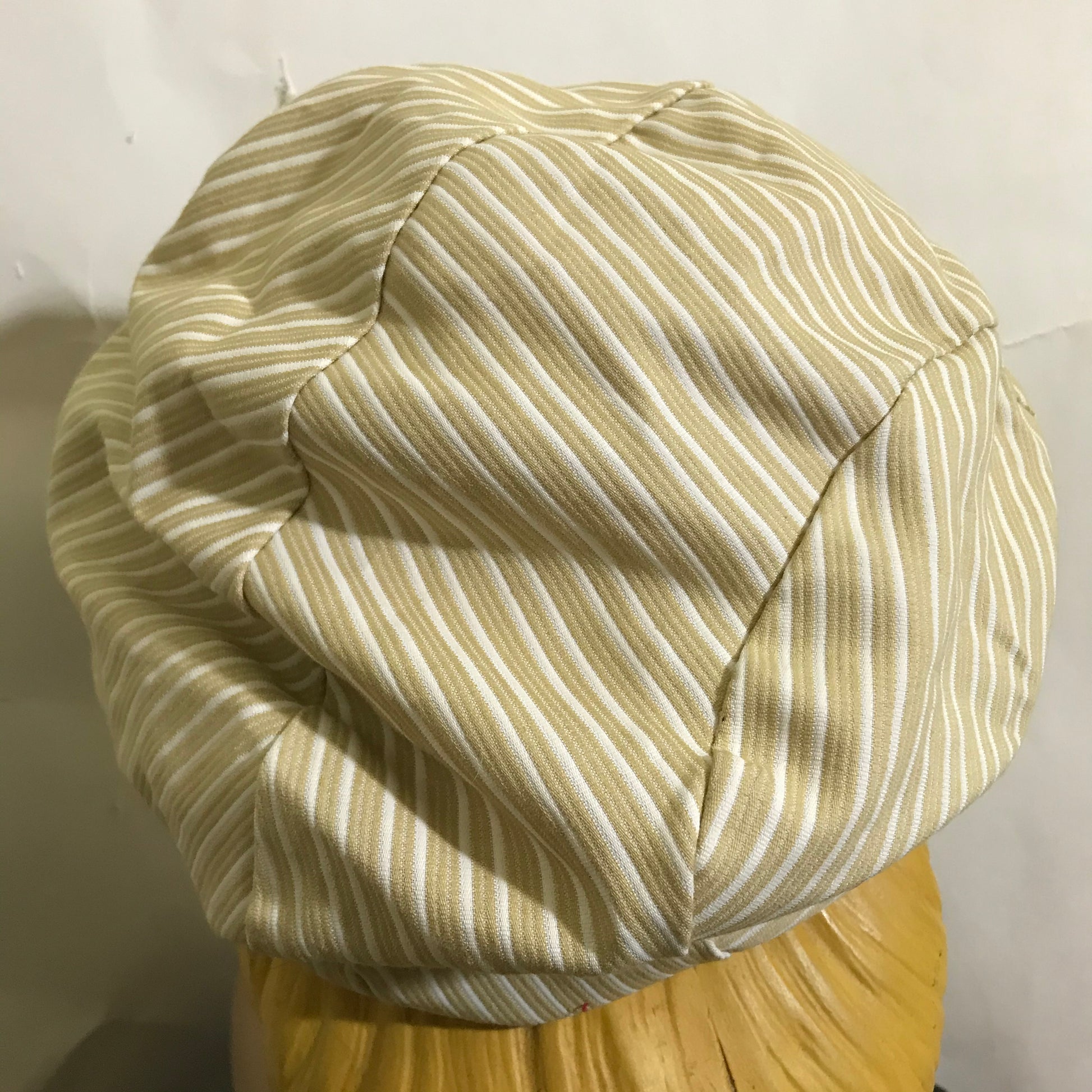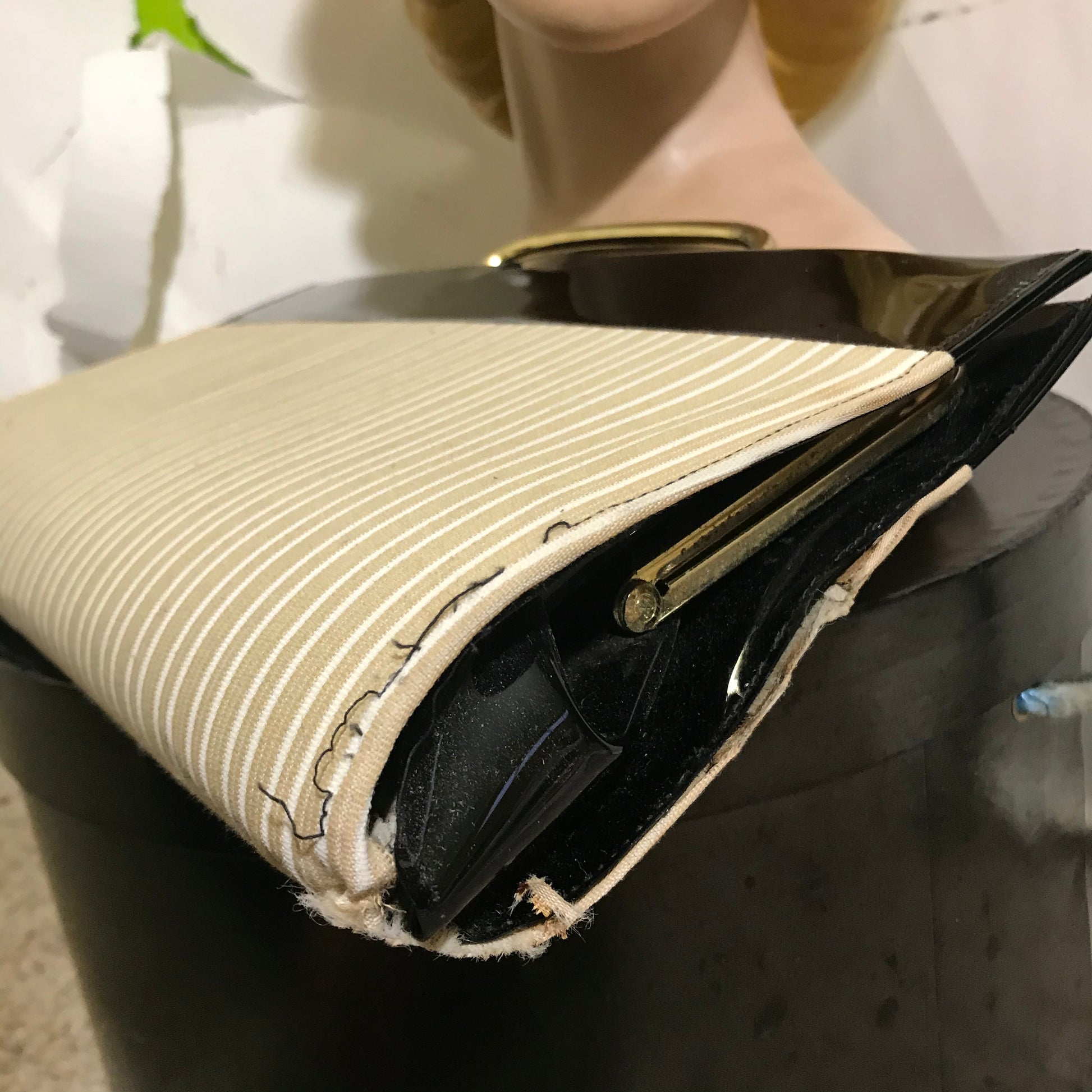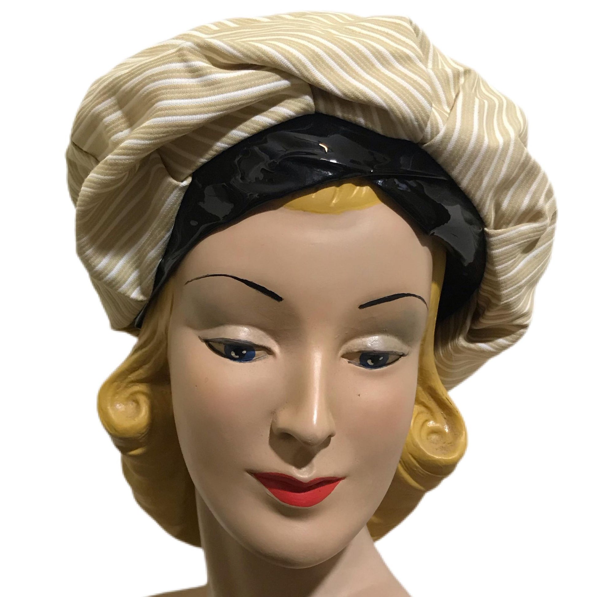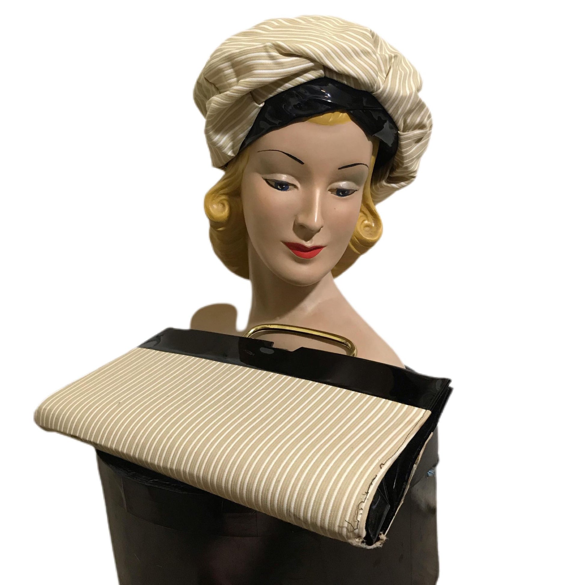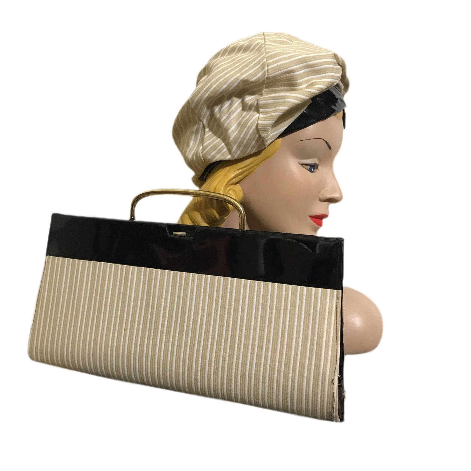 Stylish Tan and White Striped Fabric Hat and Handbag with Black Patent Vinyl Trim circa 1960s