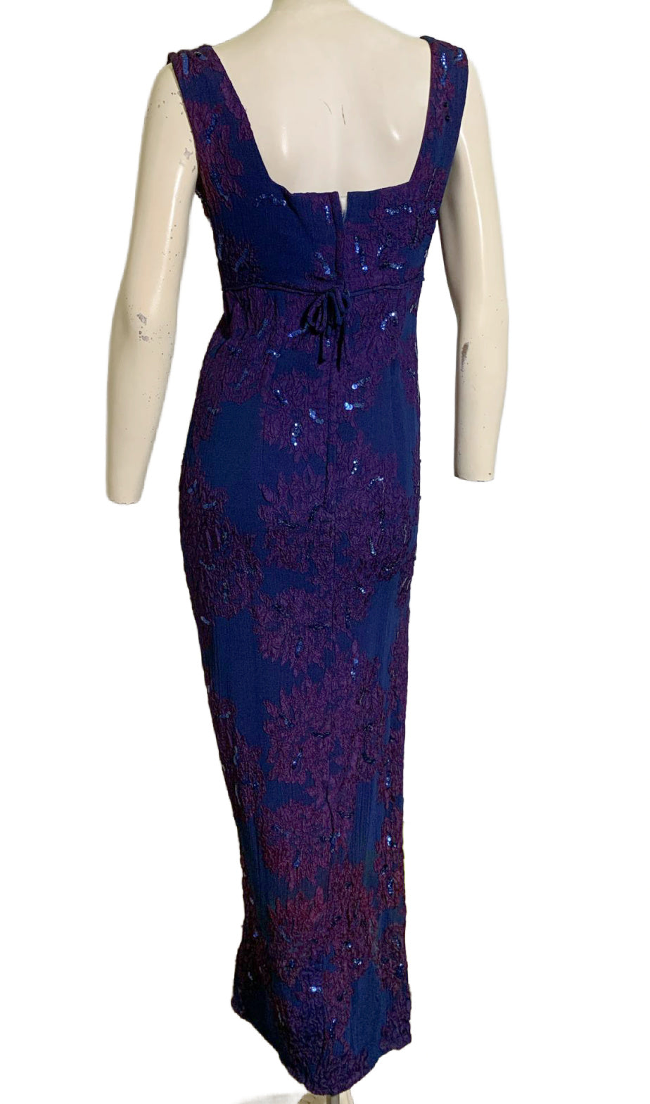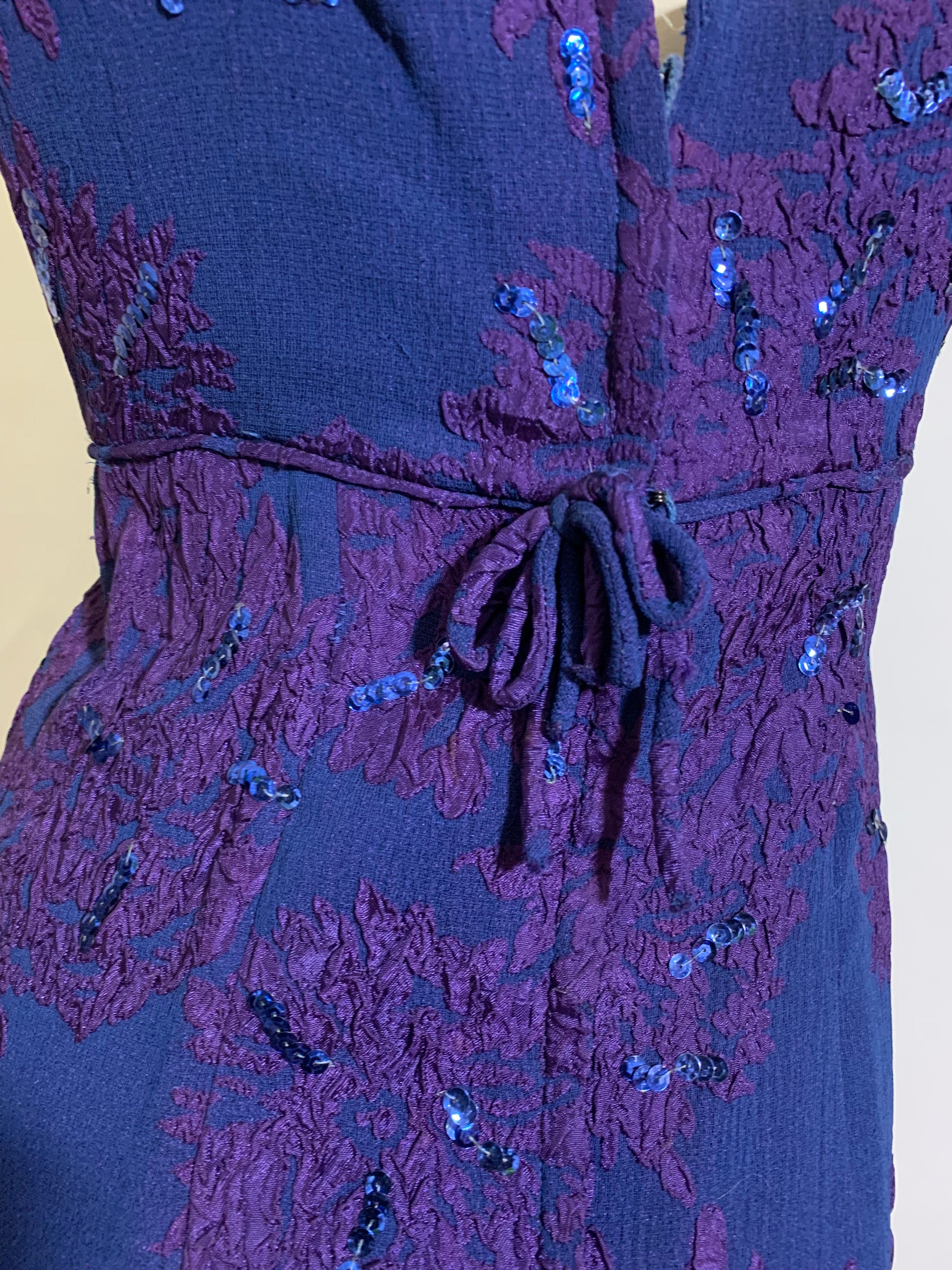Bold, luxe sapphire blue rayon 1960s column gown with darlingly high side slit on right side- adorned with purple ribbon flower design and blue sequins. Little bow in back at high waist, back metal zipper. Lined in acetate. A little fading right at underarm edge. No label.