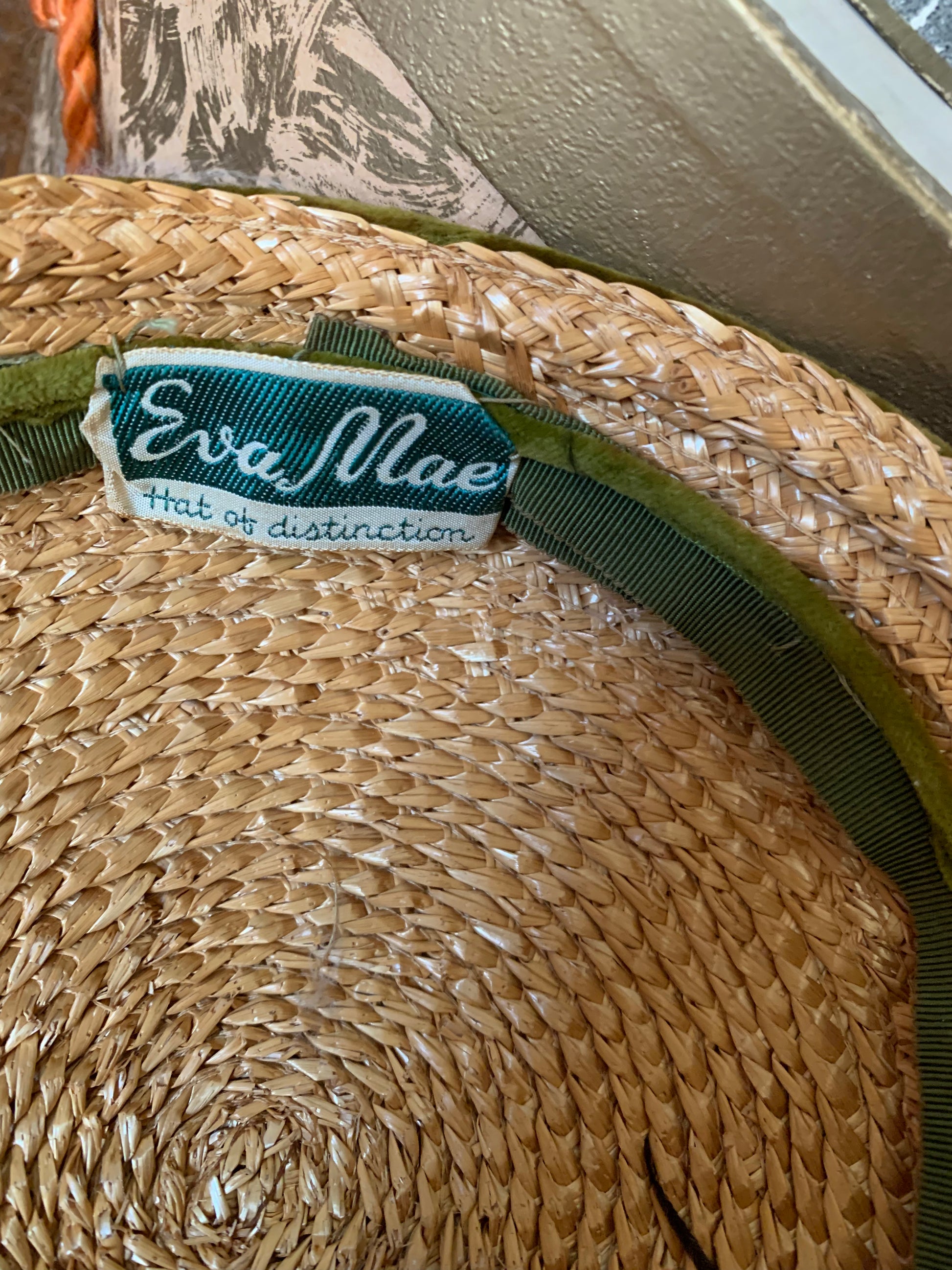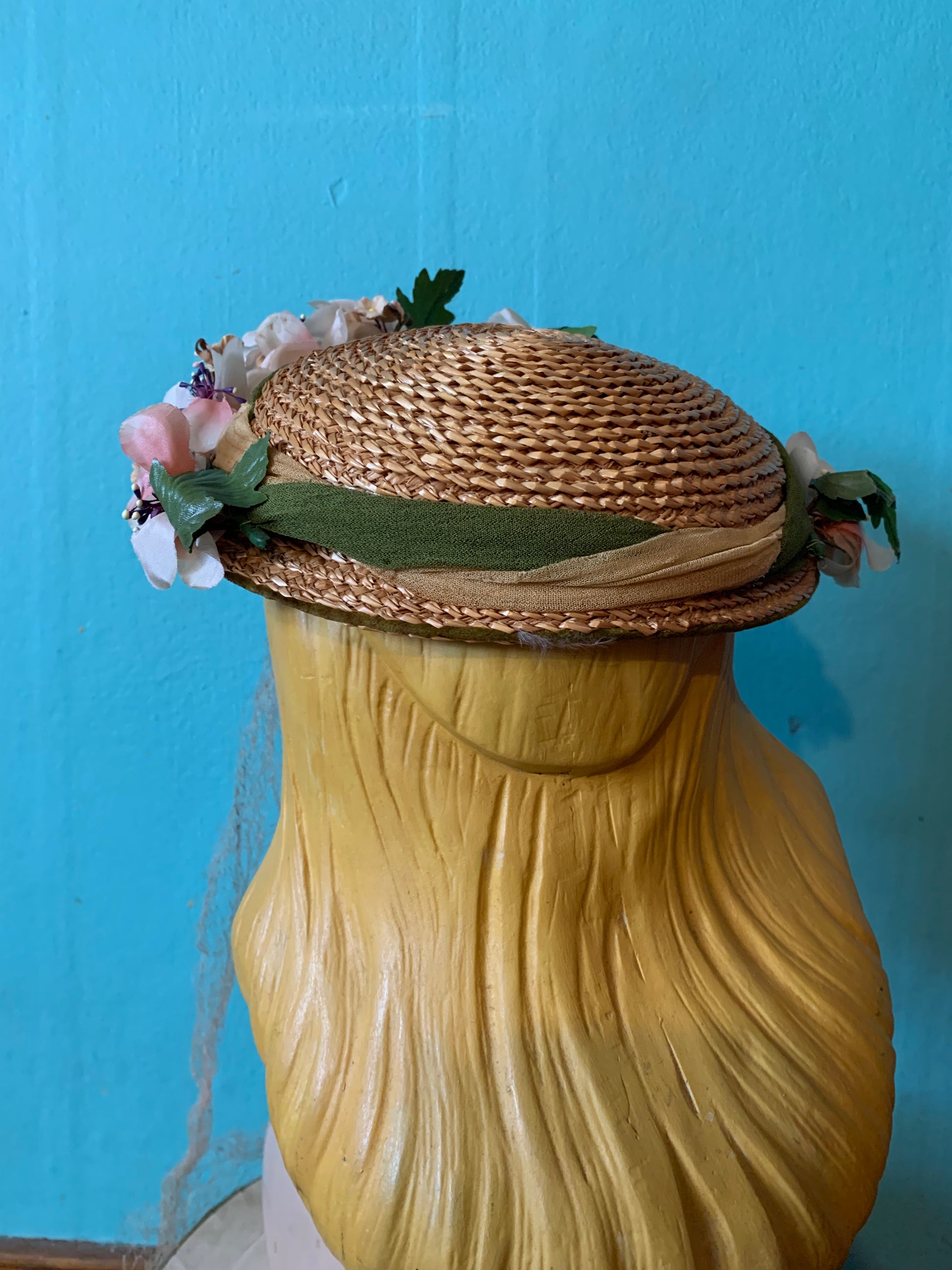 Natural straw small 1950s hat with green velvet wire clips on sides to secure to head, pink veil. By Eva Mae, one size. no flaws.