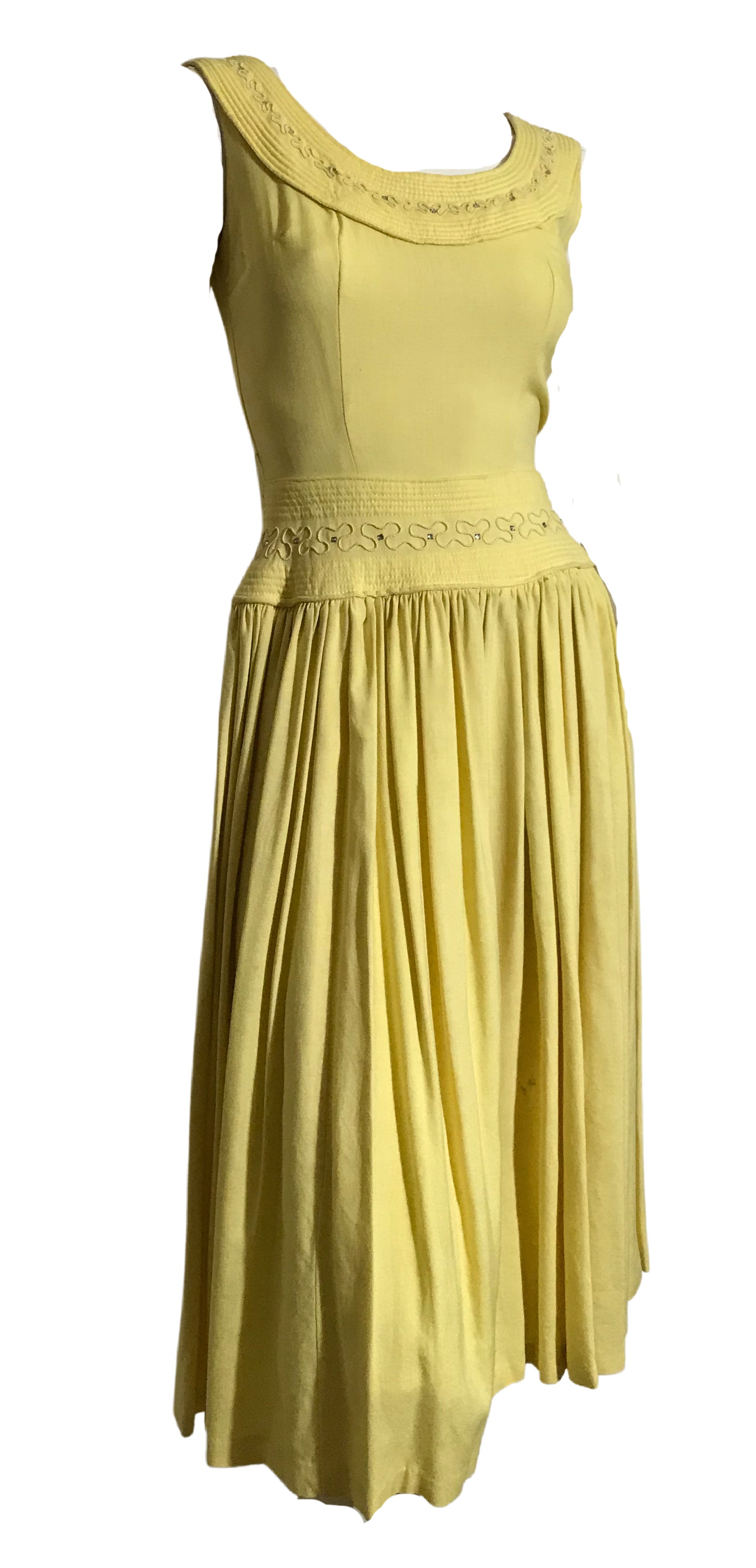 1940s linen weave rayon dress in sunshine yellow. Scooped neck front and back, sleeveless- back zip is vinyl (a replacement at some point). Waist and neckline trimmed with cording and rhinestones! Full skirt gathered at bottom of waist inset, lined in a muslin type fabric for support. Small blemish on front of skirt as shown. No label, appears hand made but very well. Sundrop loveliness!