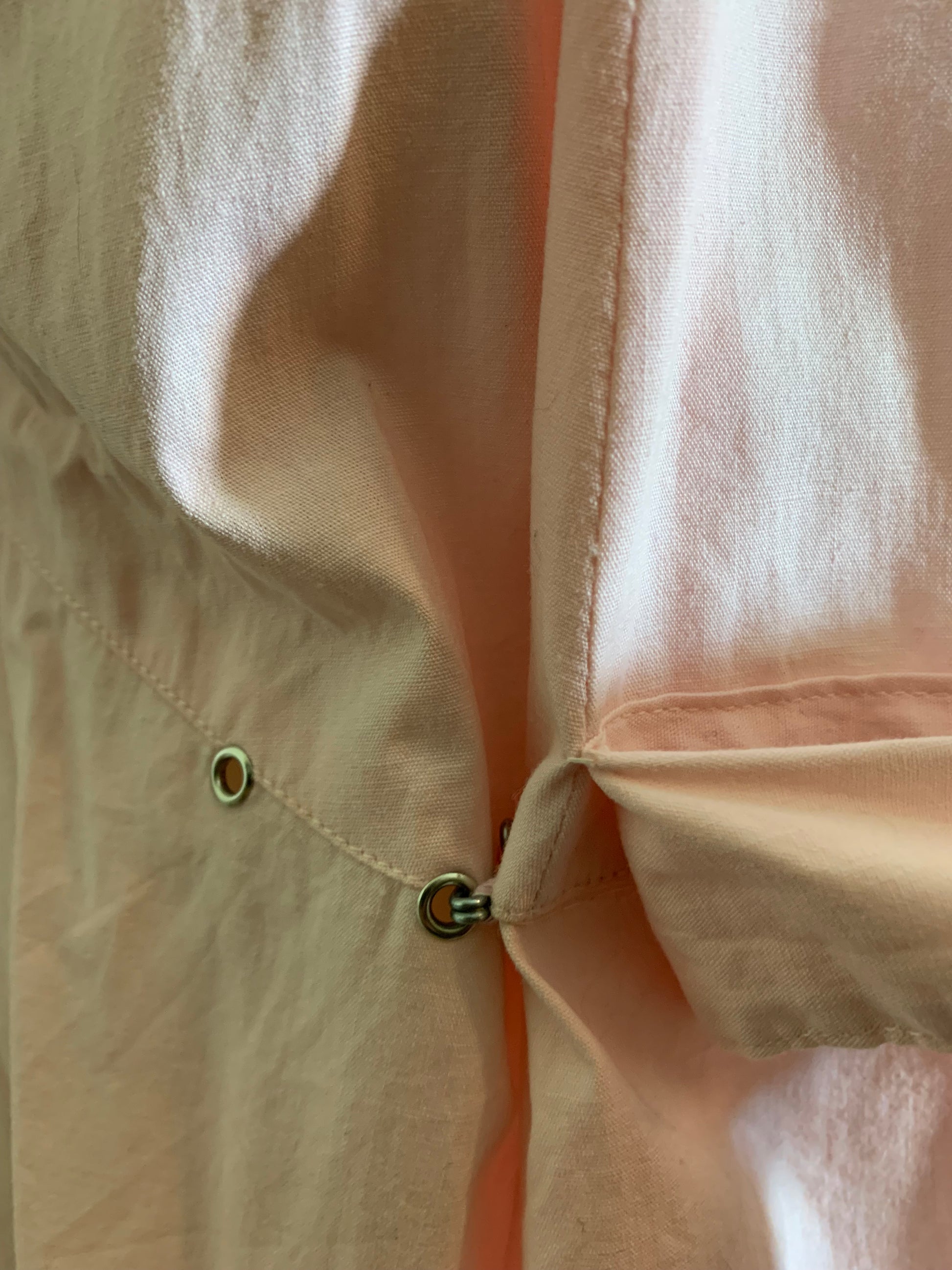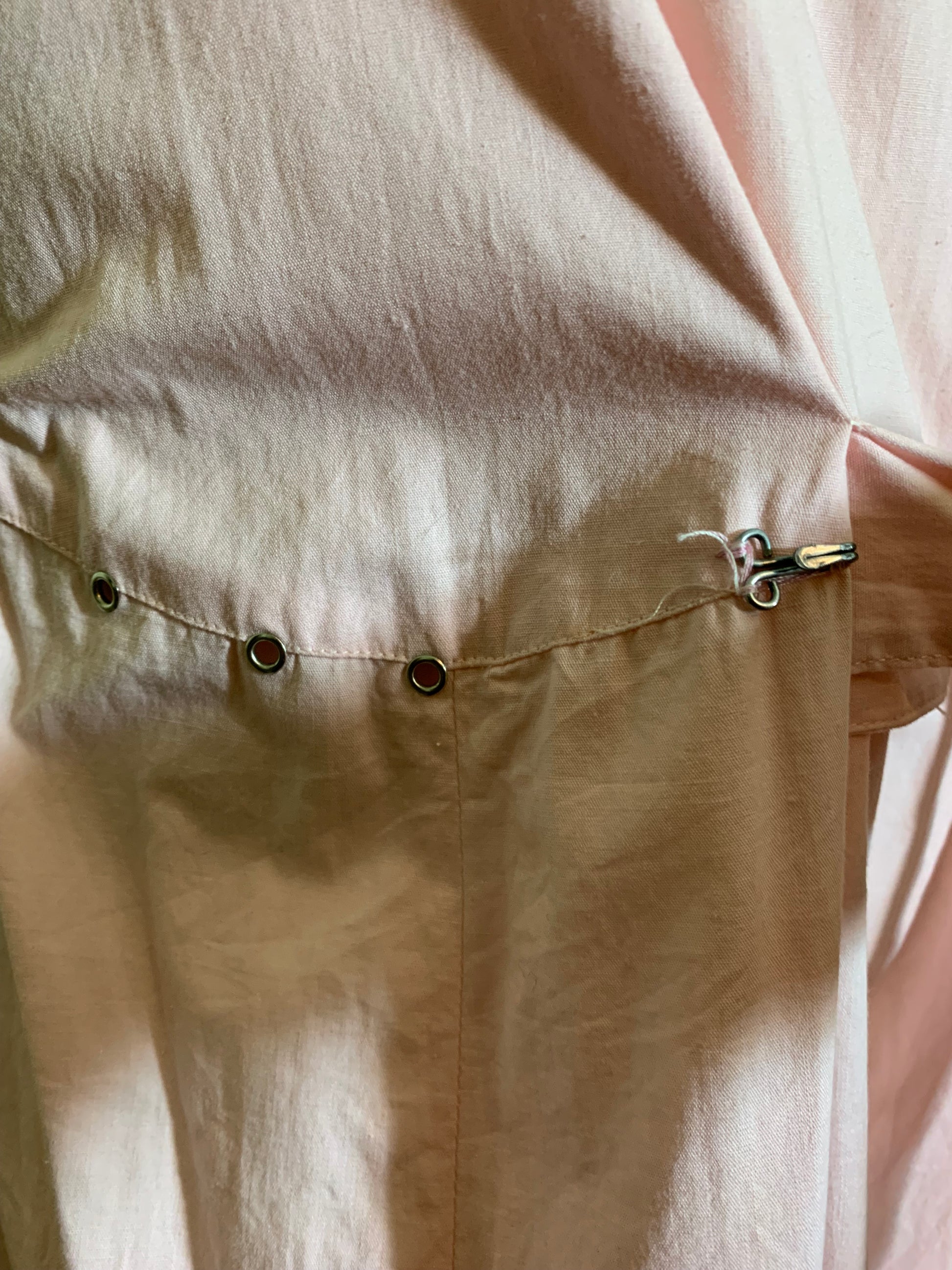 Baby pink cotton 1940s maternity sun dress! Waist adjusts with metal hook and grommets to hook into in 3 places as shown, has half sash that ties in back. Loop lace trim around top of bodice, wide straps. No zipper or closure. By Coming Attractions. One small spot as shown on skirt.
