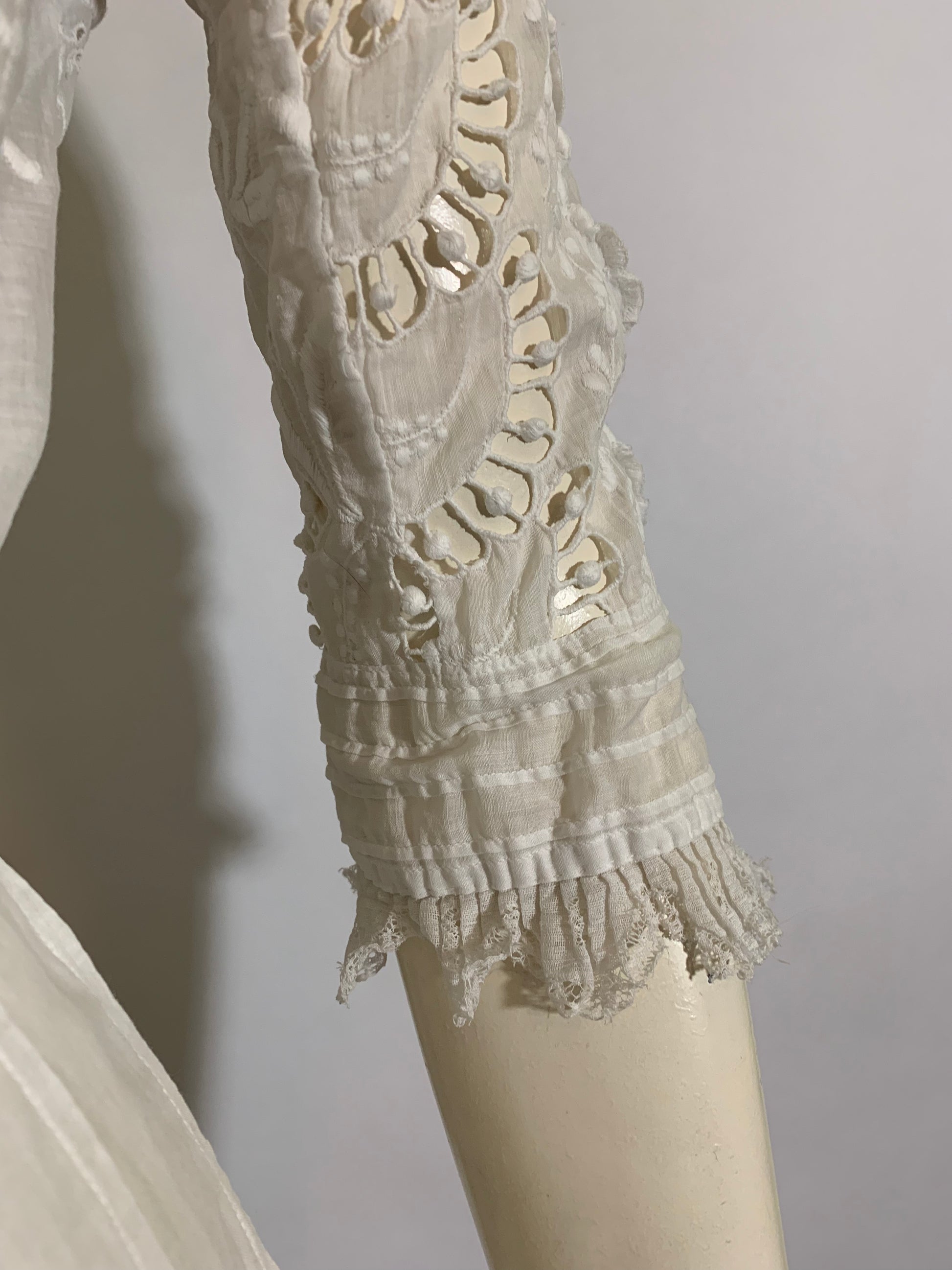 Classic white cotton early 1800s embroidered lace dress with high ruffled neck, elbow length sleeves with ruffled lace trim- blouson bodice, embroidery on bodice, back and hem. Hook and eye closure at waist and below in center back, hidden buttons up back of bodice. No stains or holes.