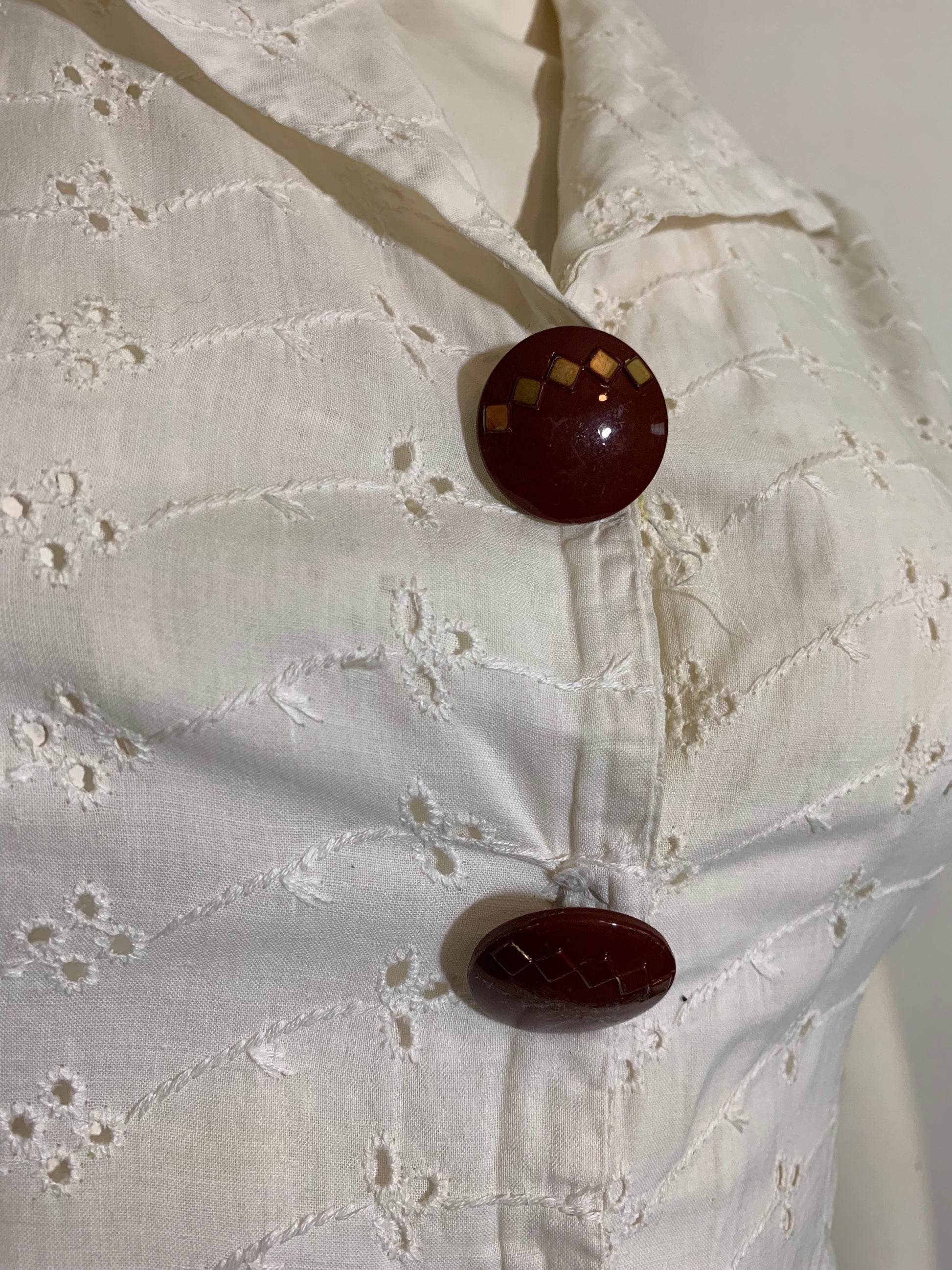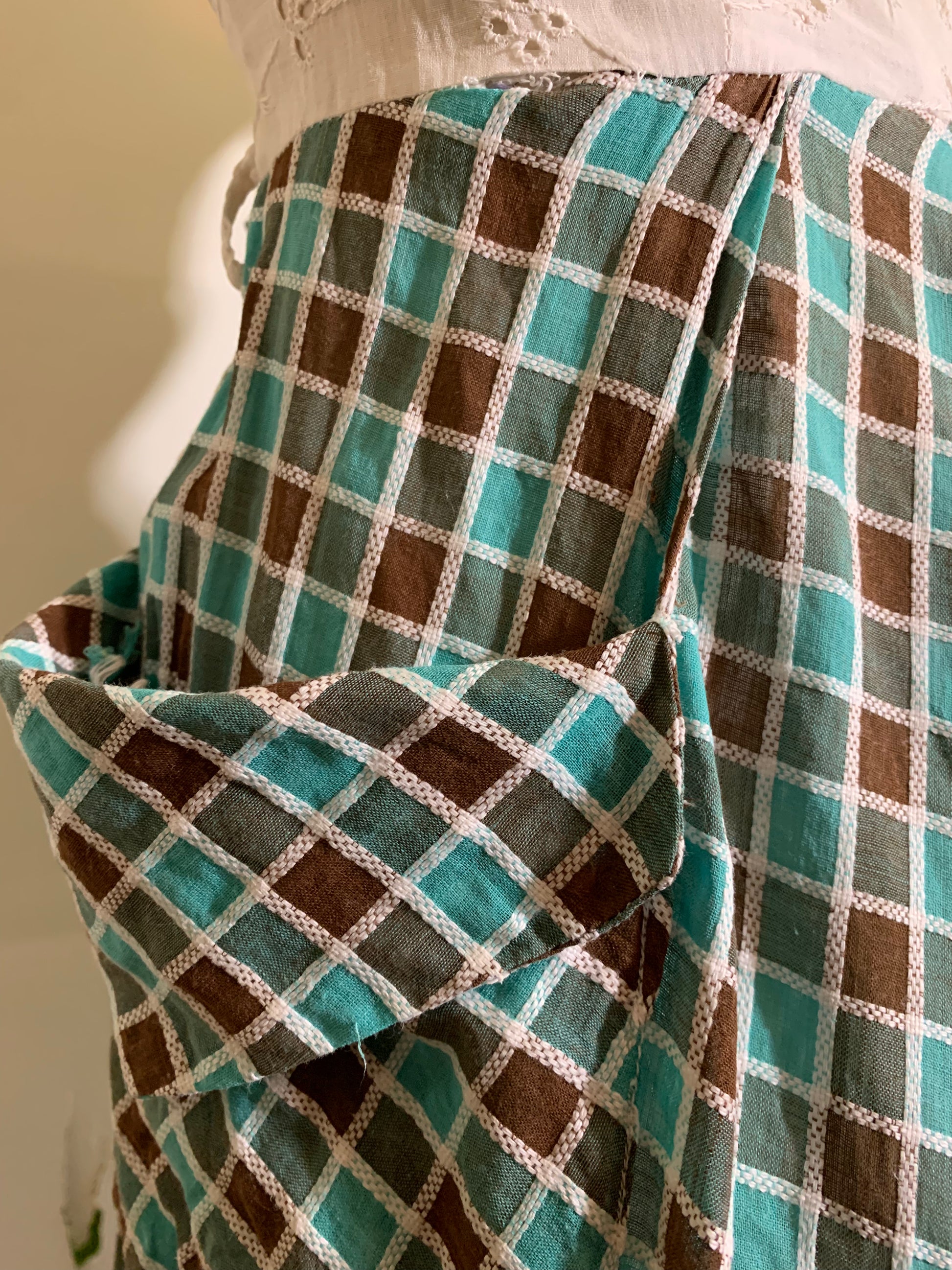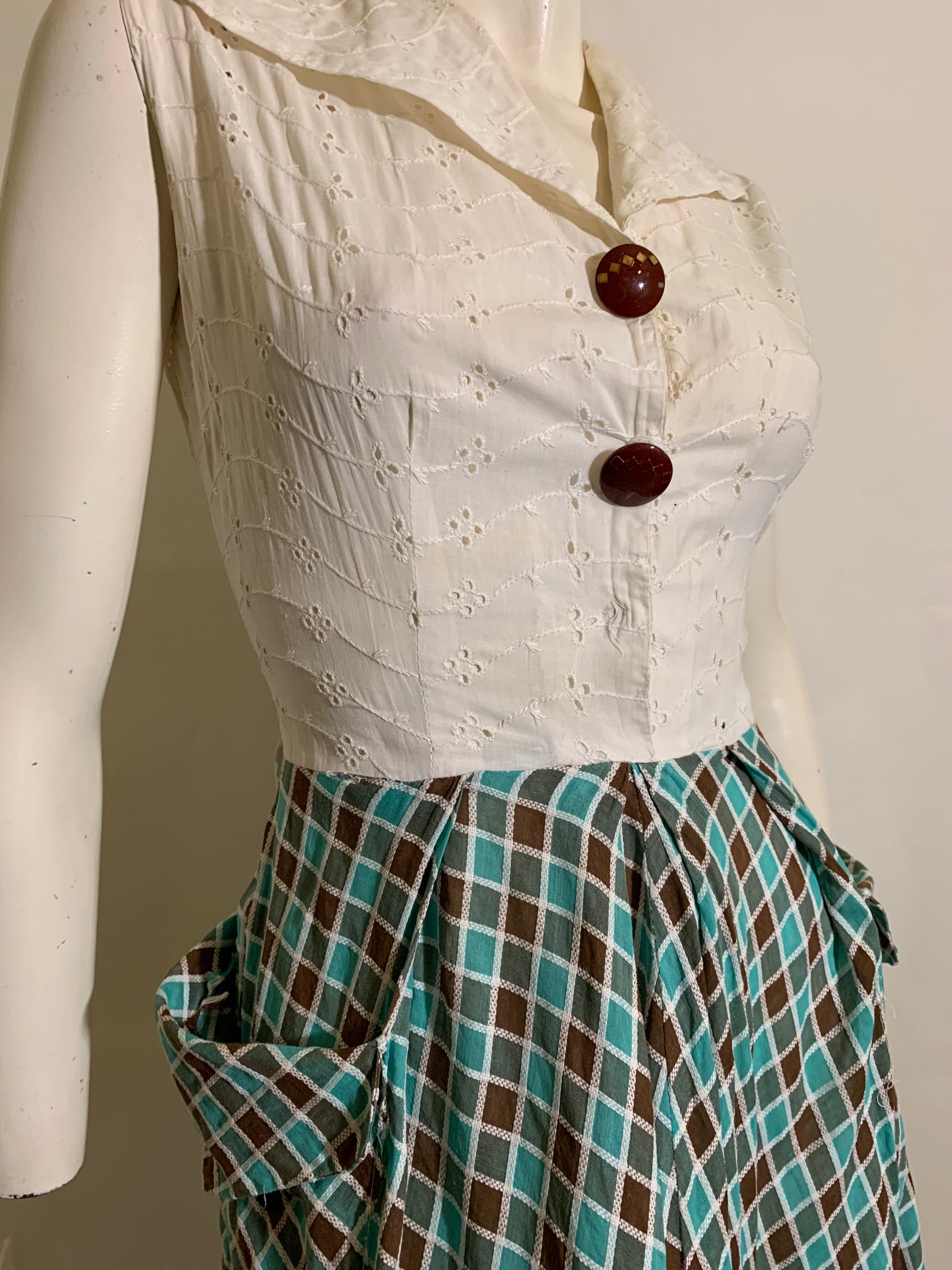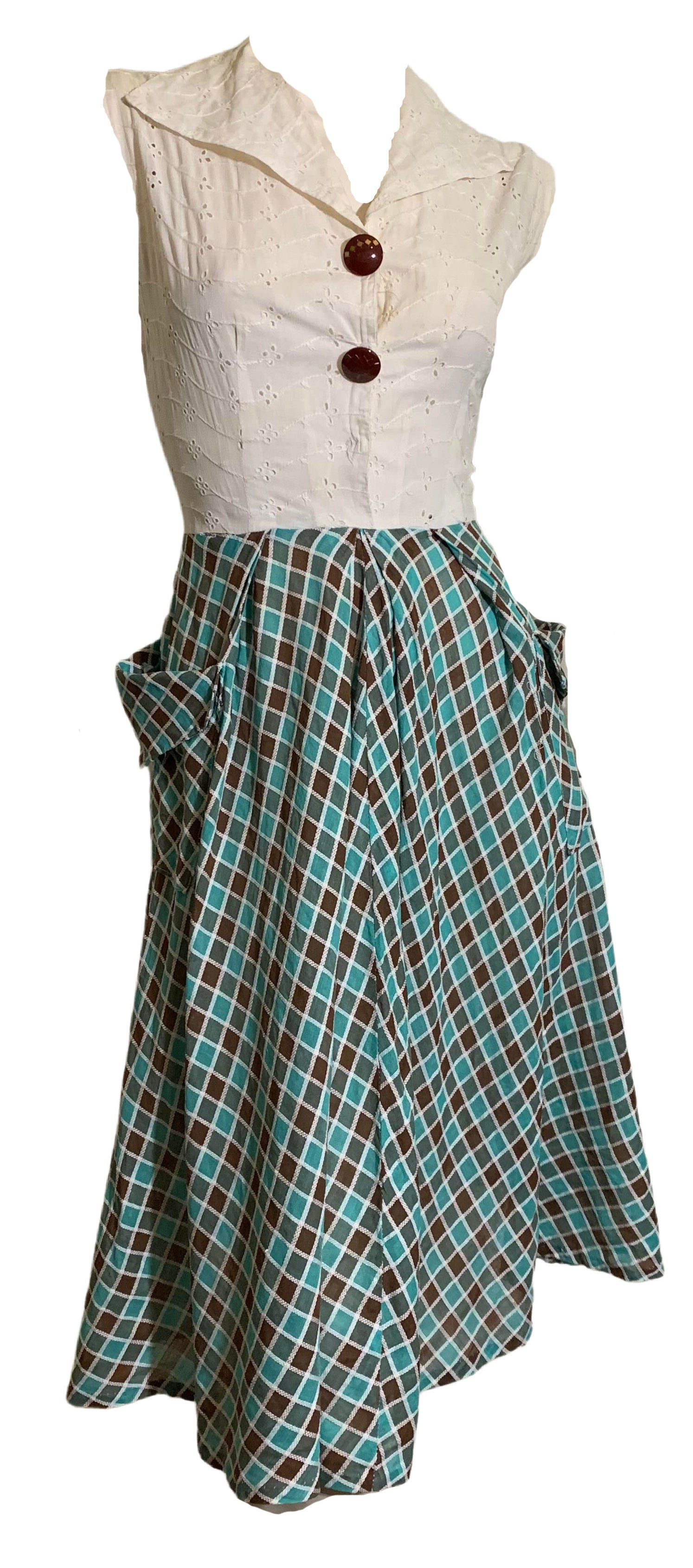 Sweetest 1940s teal and brown harlequin weave cotton dress with white bodice, matching painted buttons. Sleeveless. Snaps shut- maybe missing one button? Can't be sure. Matching belt but it has yellowed and can't be washed. Side metal zipper. Some general wear but clean, no holes or stains. No label.