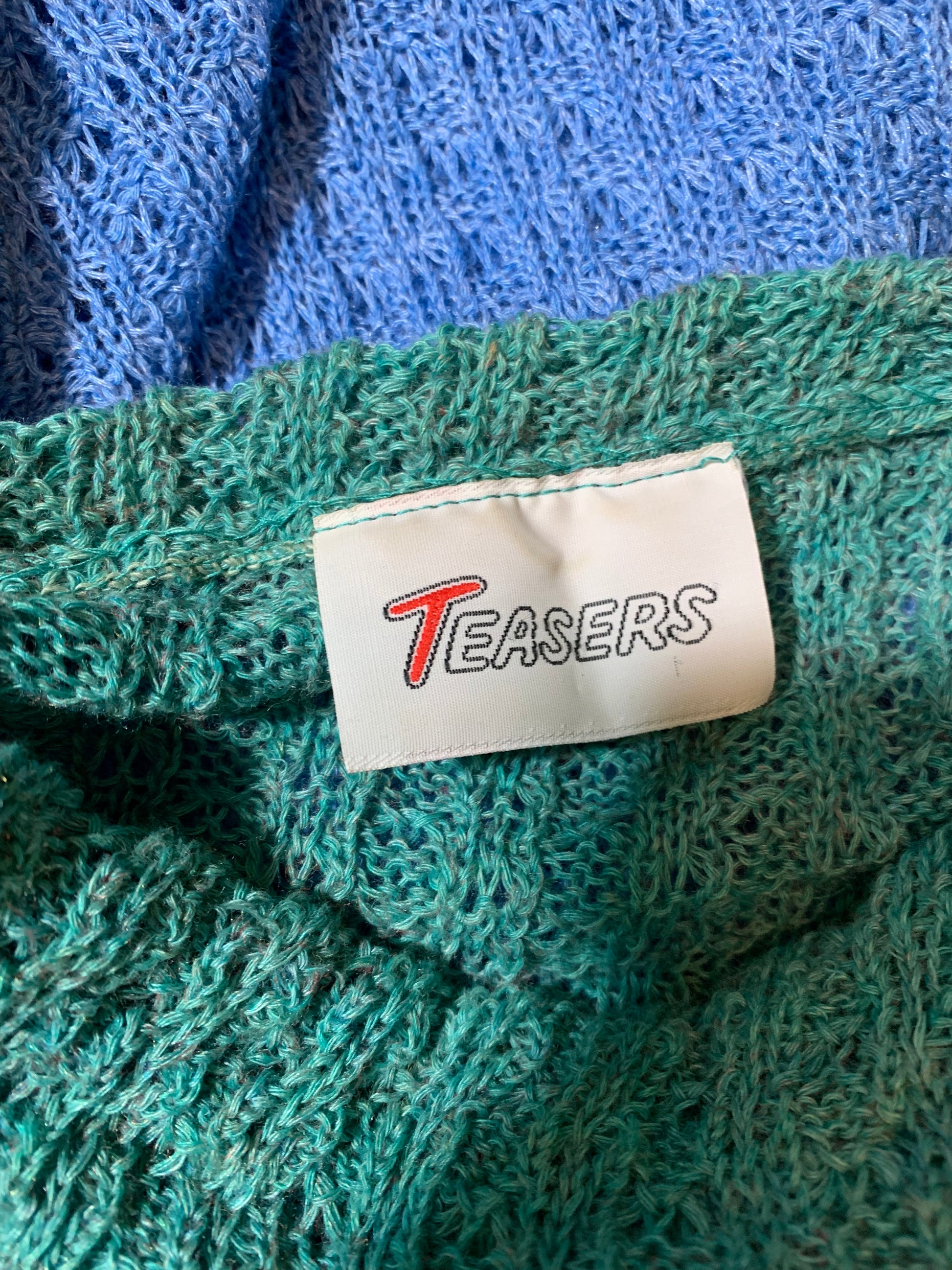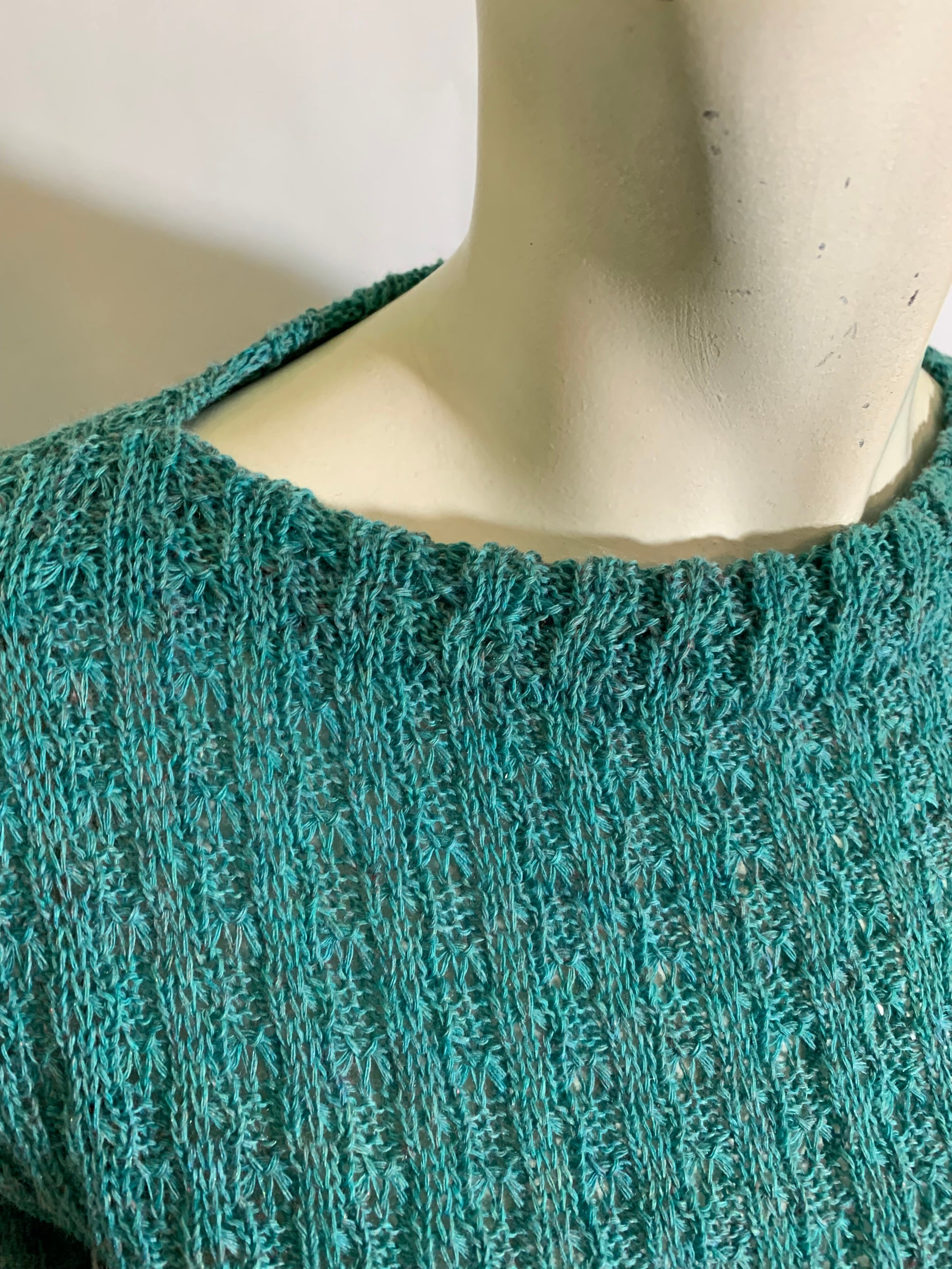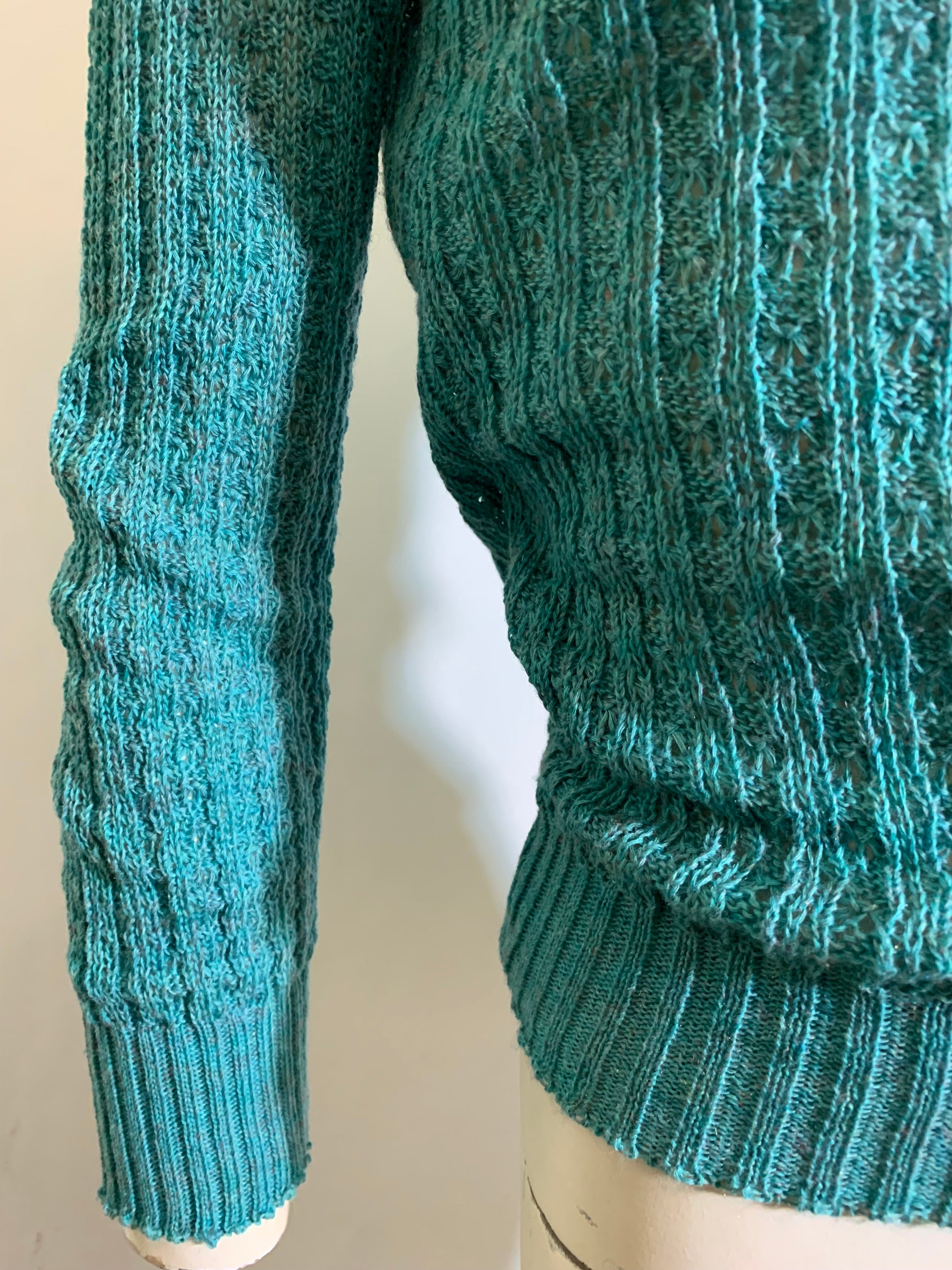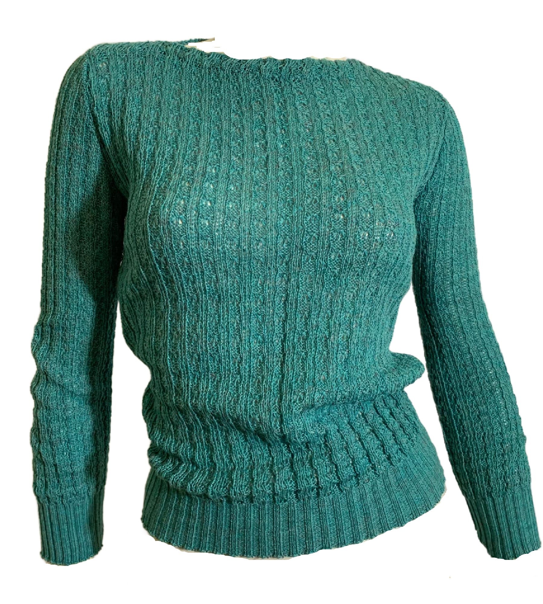Lightweight open weave acrylic knit long sleeved 1970s sweater, almost a boat-neck neckline. Ribbed at cuffs and hem. By Teasers, no flaws.