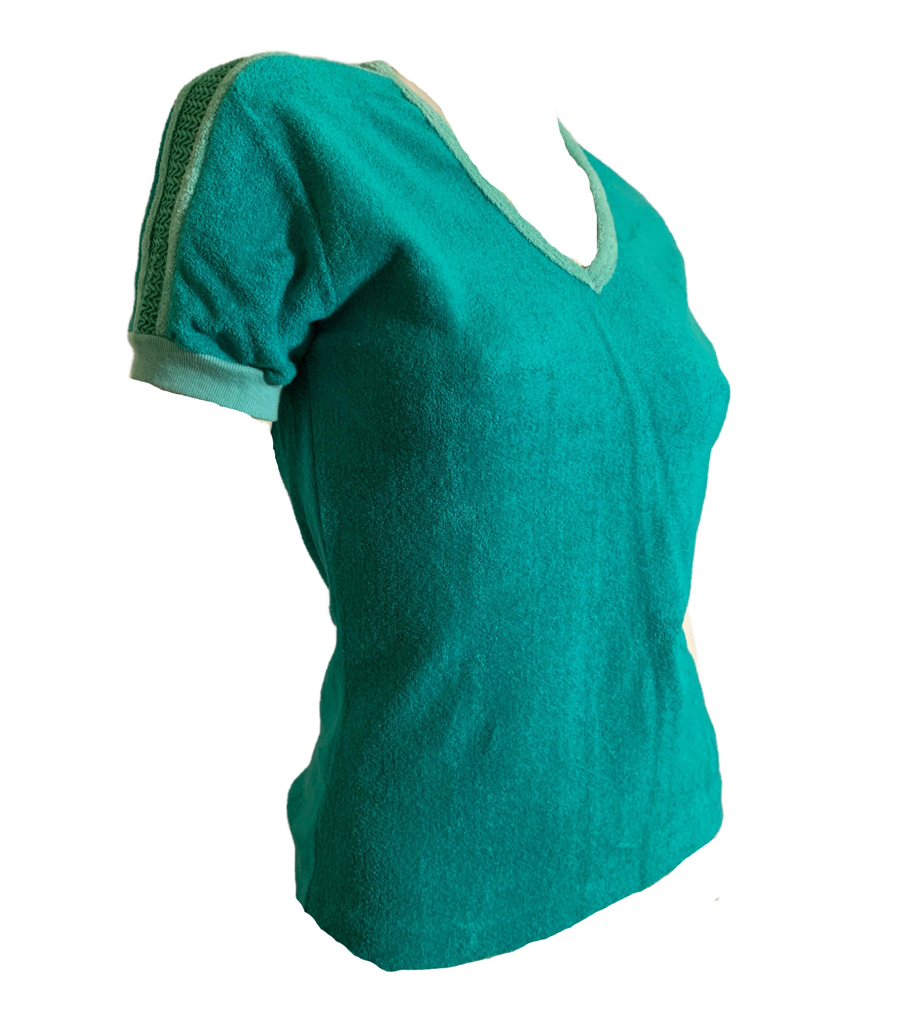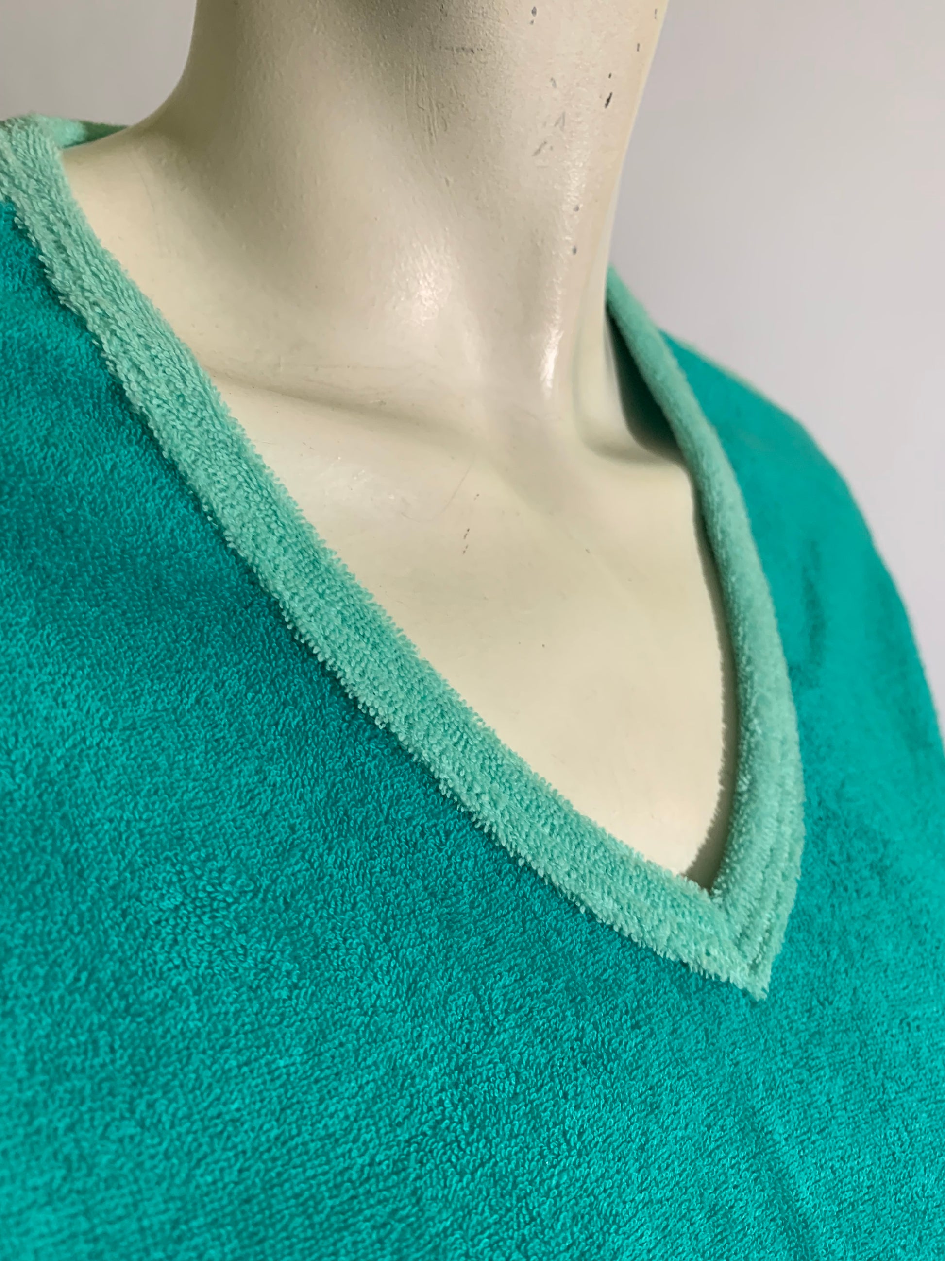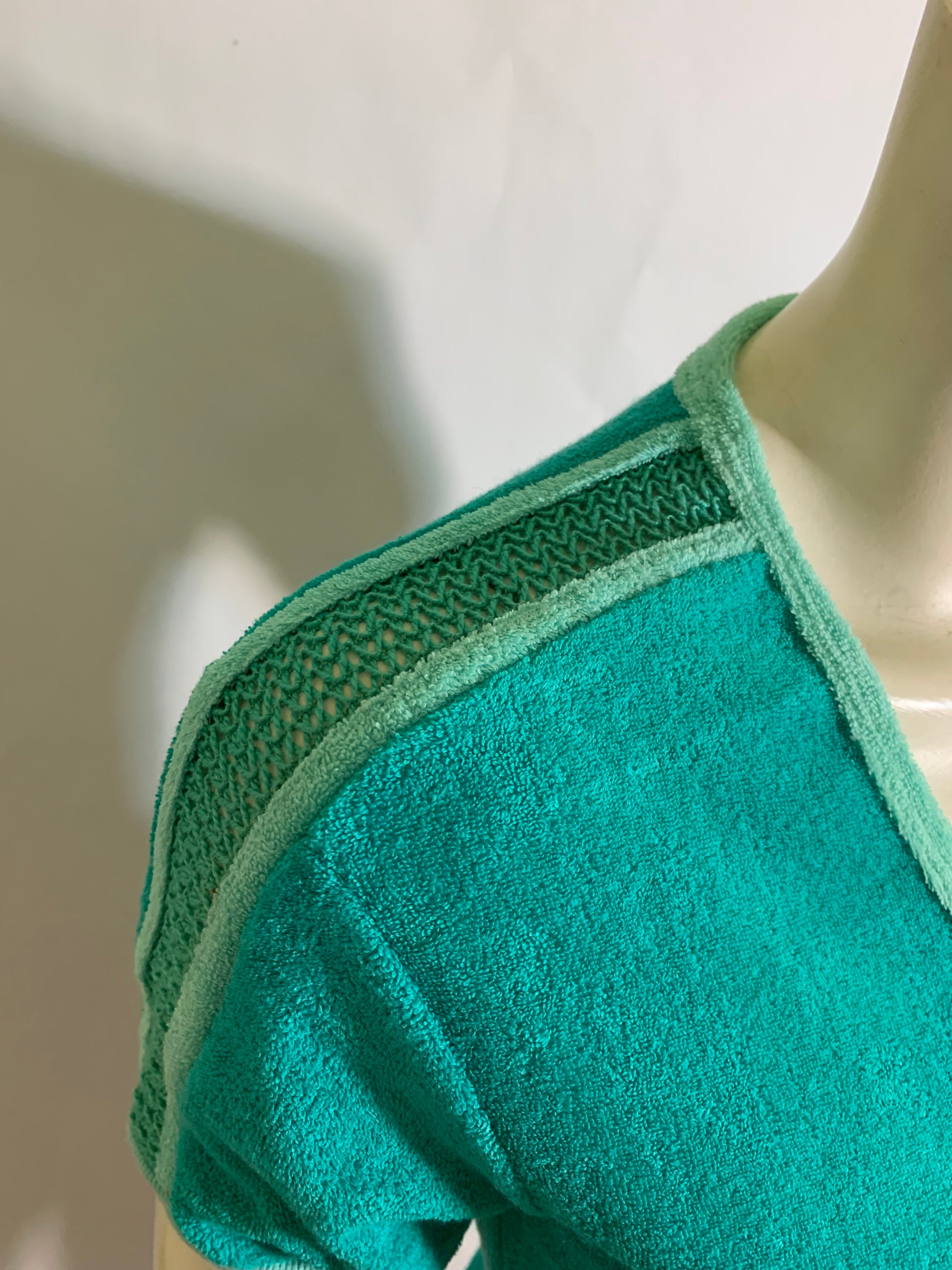 Teal terry cloth V necck 1980s top with mesh shoulders. By TK2, no flaws.