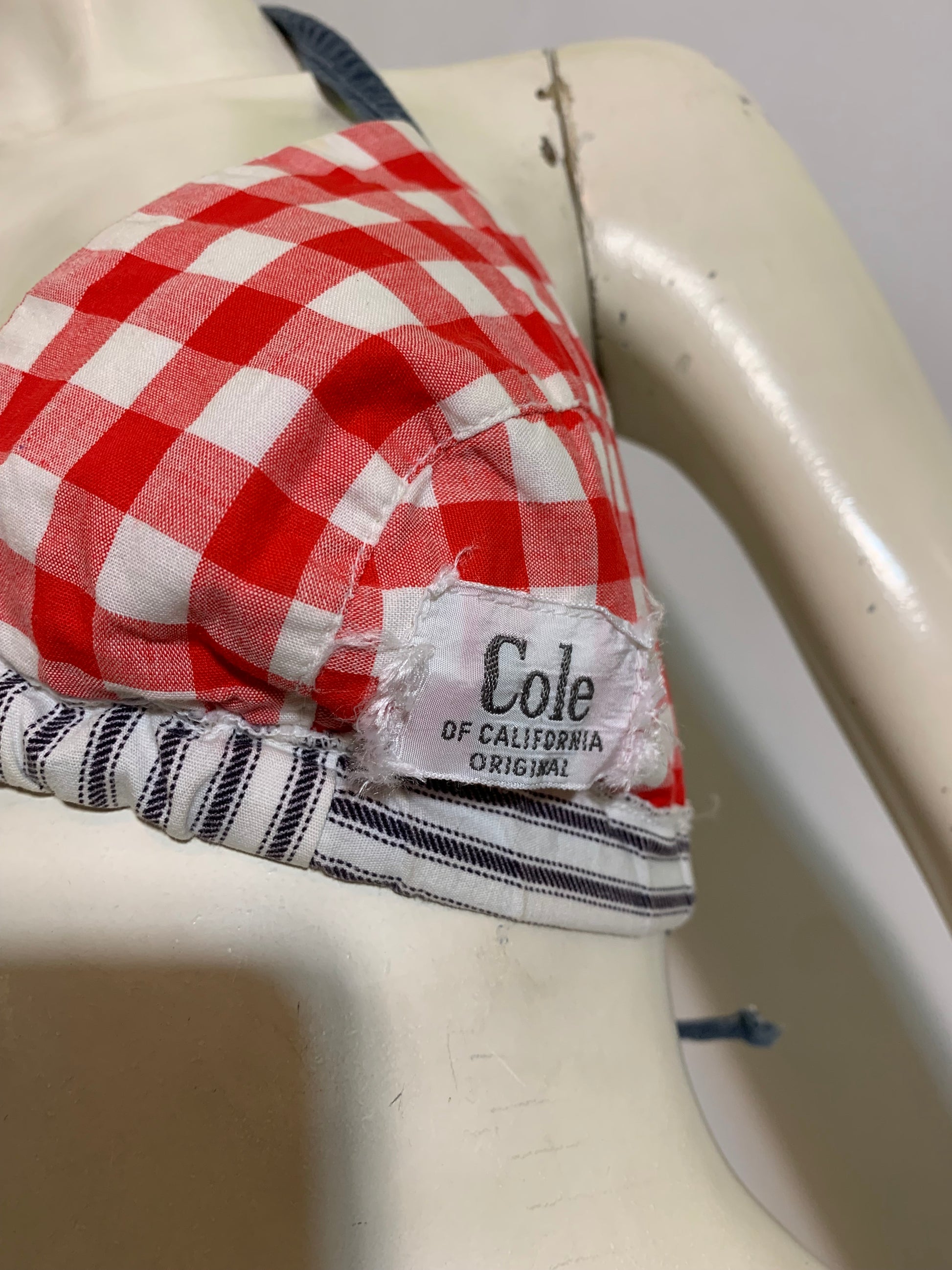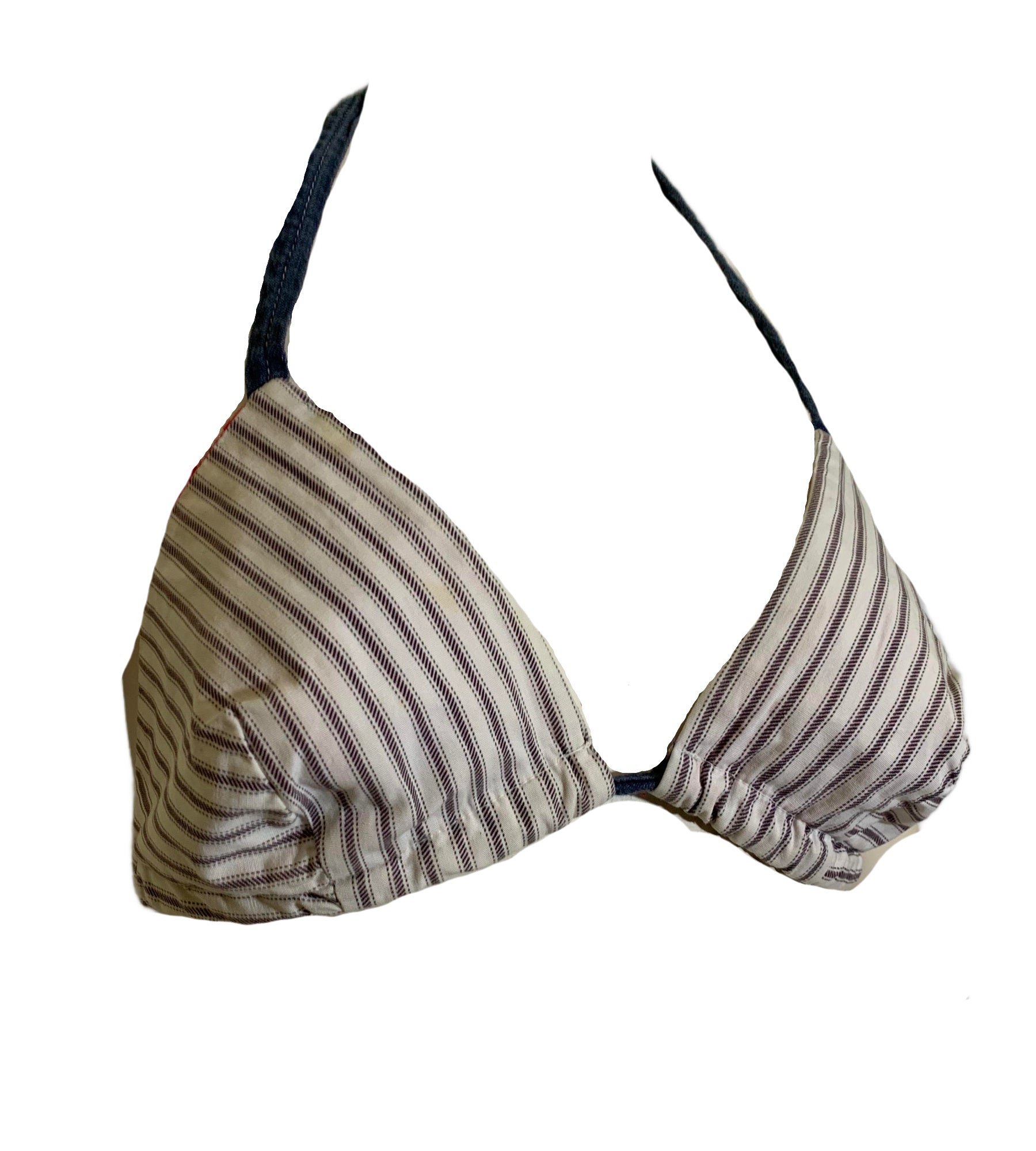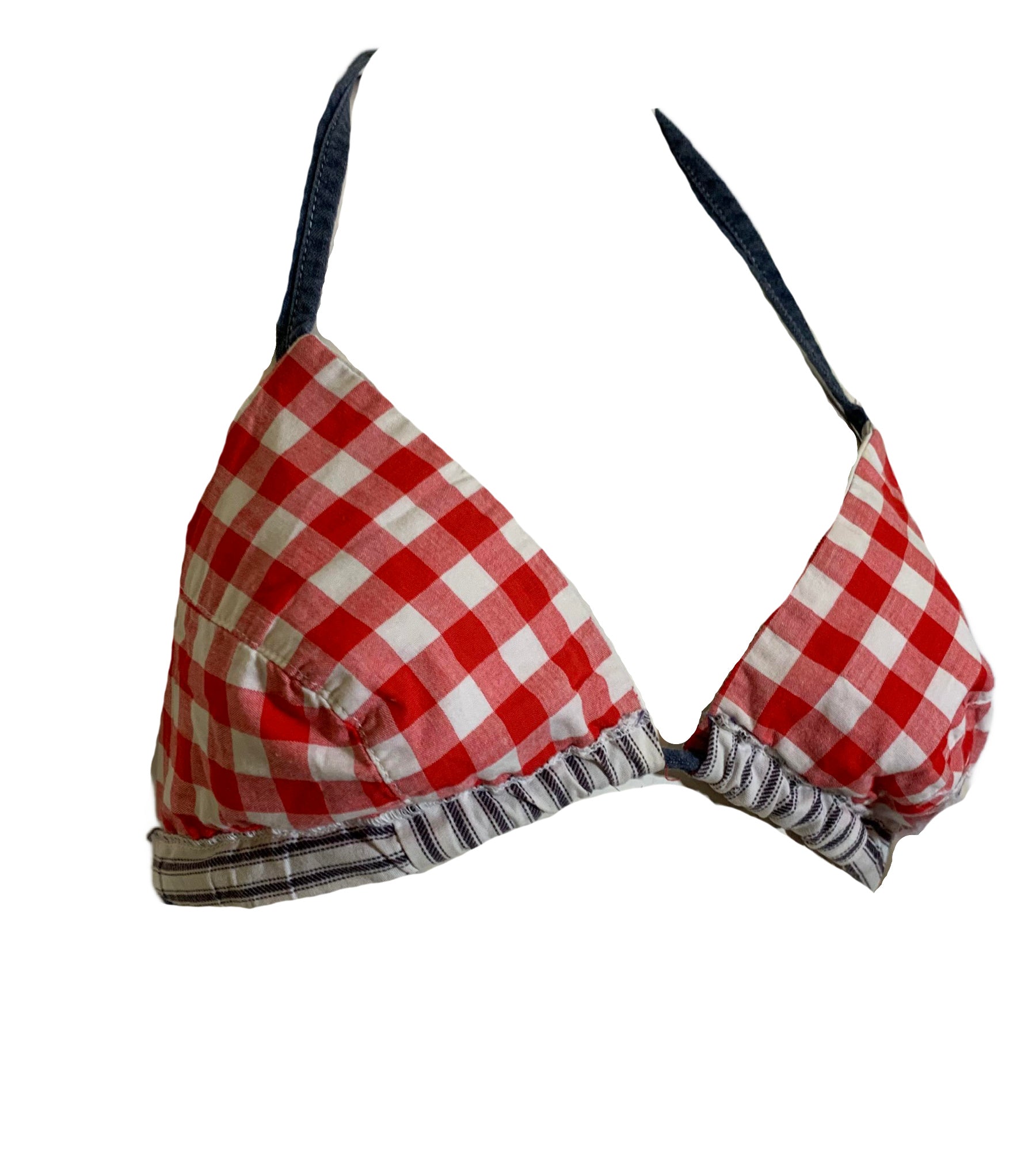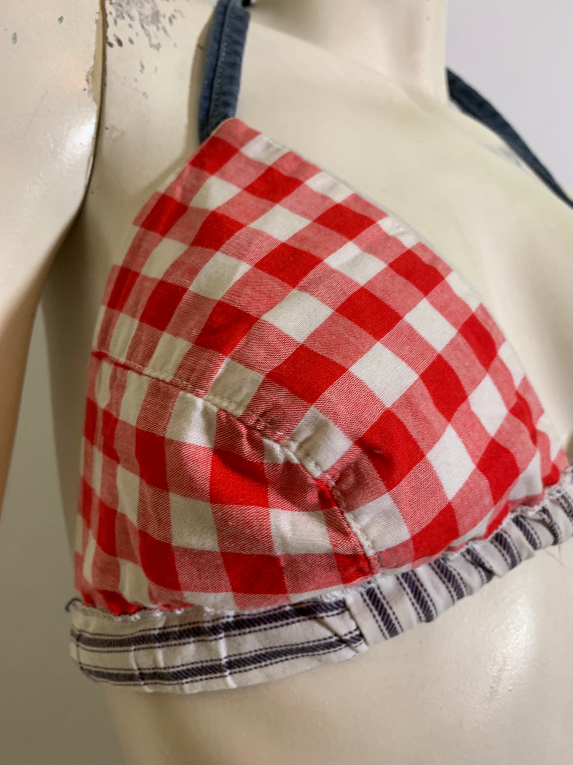 Blue and white cotton ticking striped bikini top with blue denim straps, reverses to red and white gingham. By Cole of California- tag on the red side can be removed to wear either way. No flaws. Cups are 8" across in center, 8" tall- underbust is 54" around including back straps. Ideal size fits US XS-M B cup.