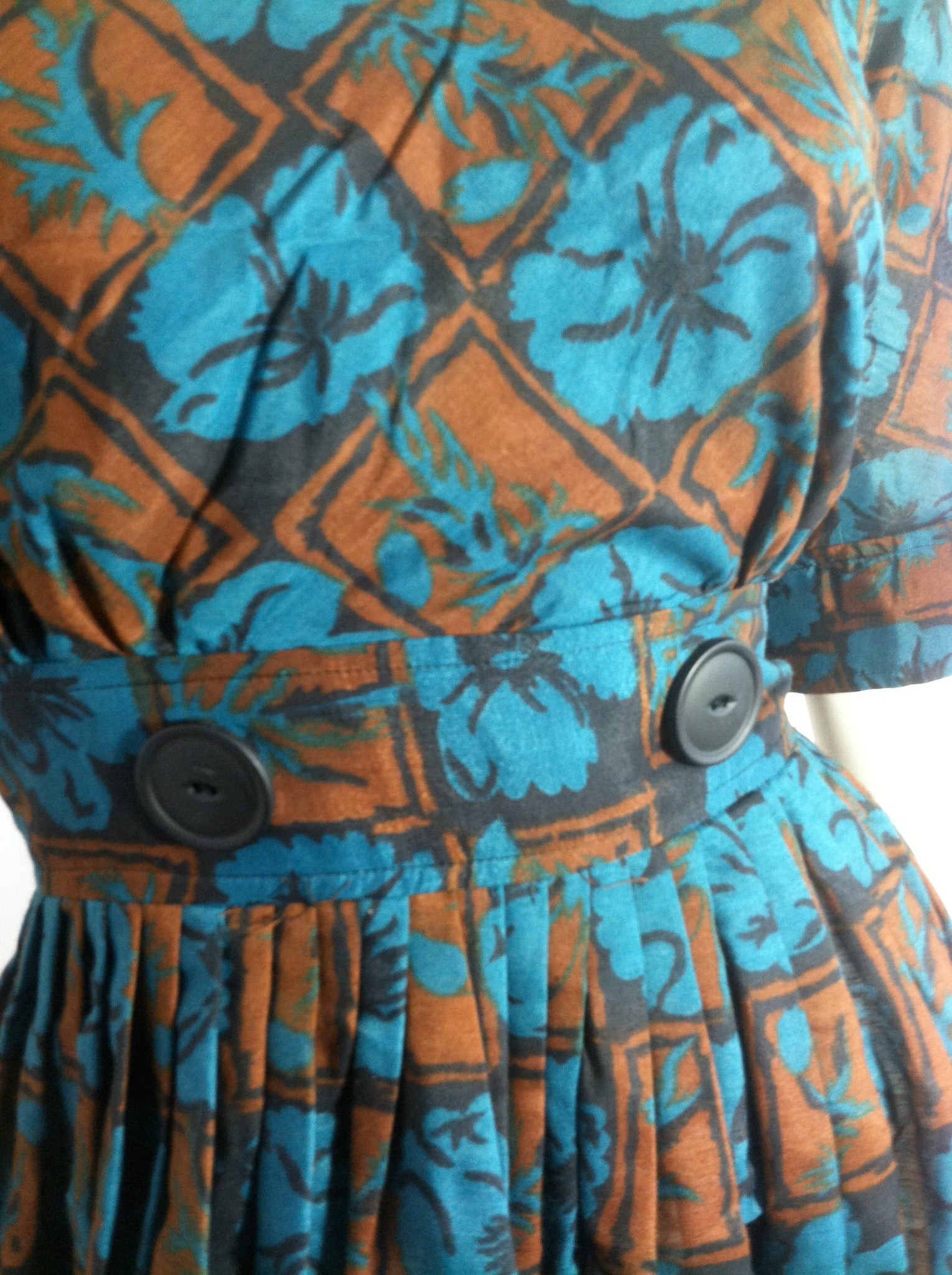 Turquoise and Cocoa Floral Print Dress w/ Button detail circa 1960s