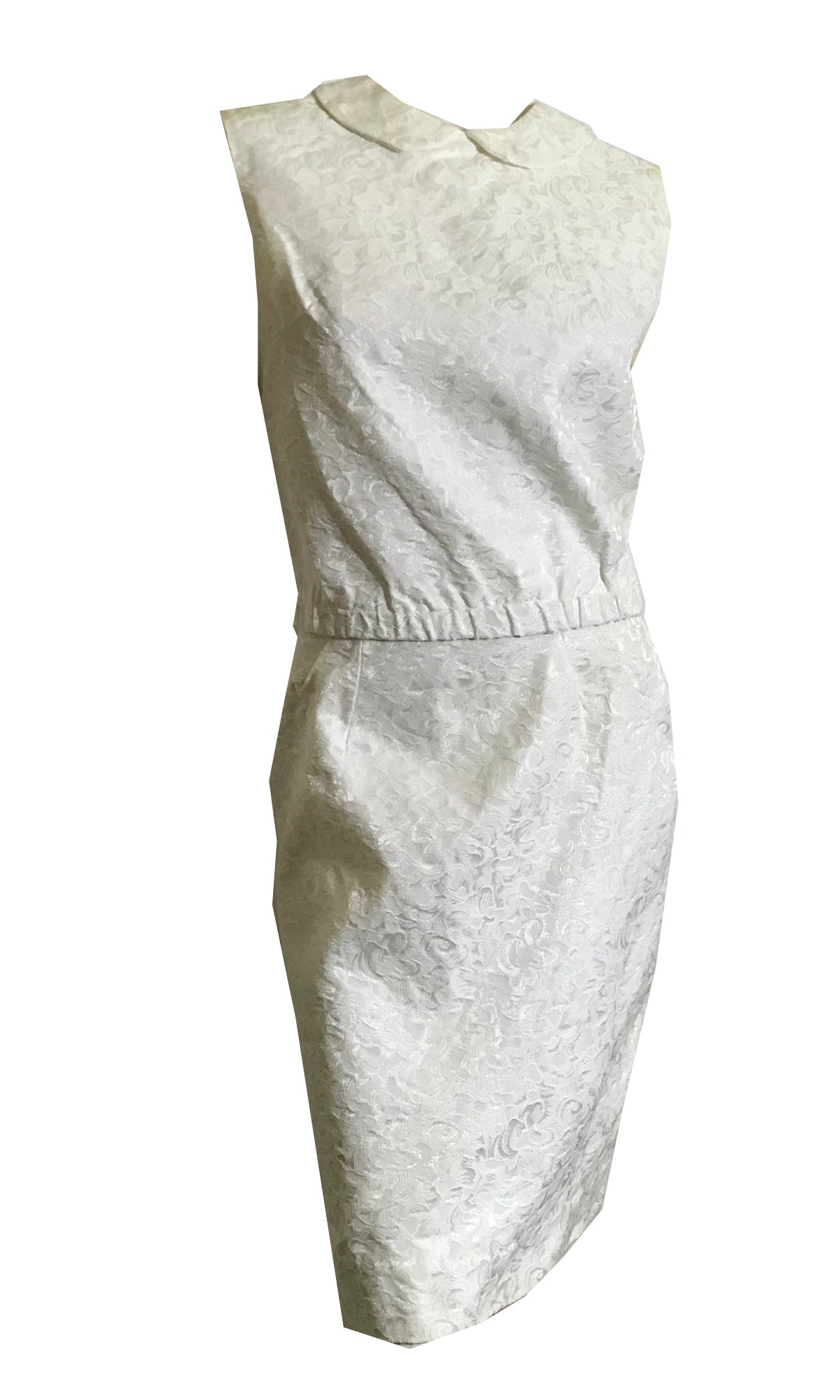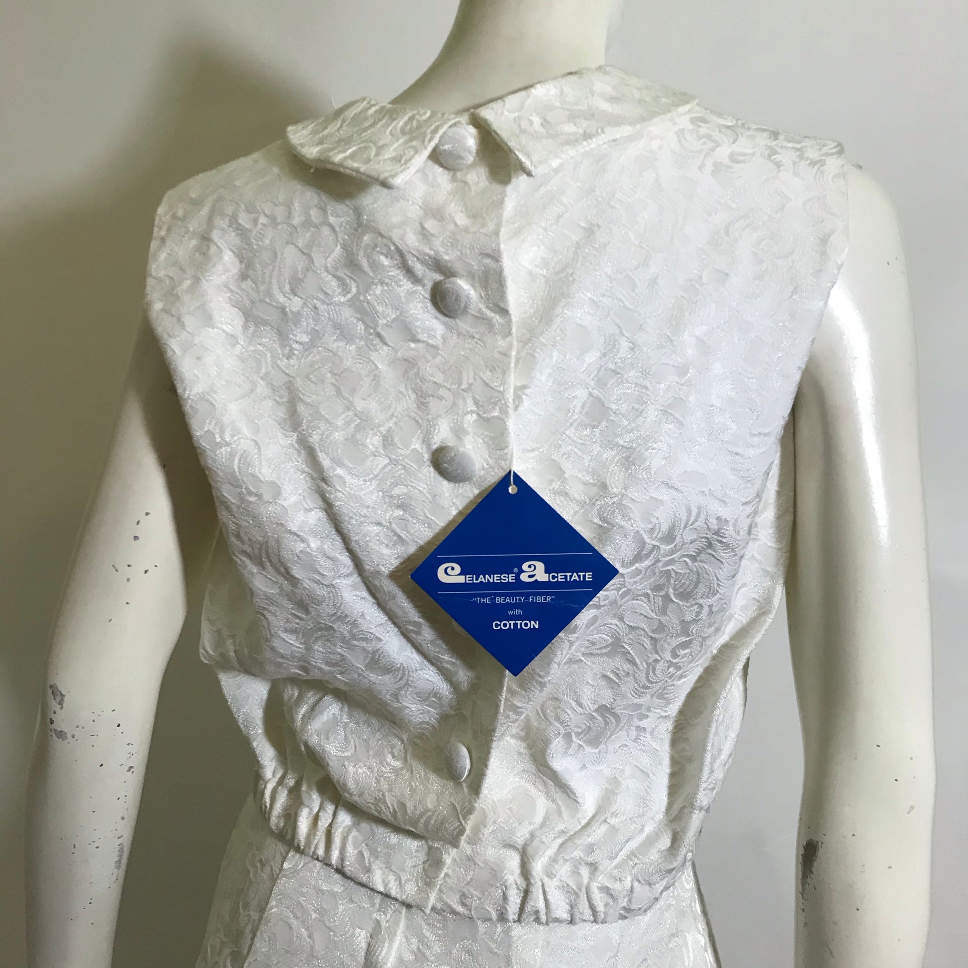 1960s ivory 2 piece dress in an ivory cotton blend with textured weave. Button back bodice with folded collar, skirt zips and buttons in back. No flaws, new old stock. By Mode O' Day.