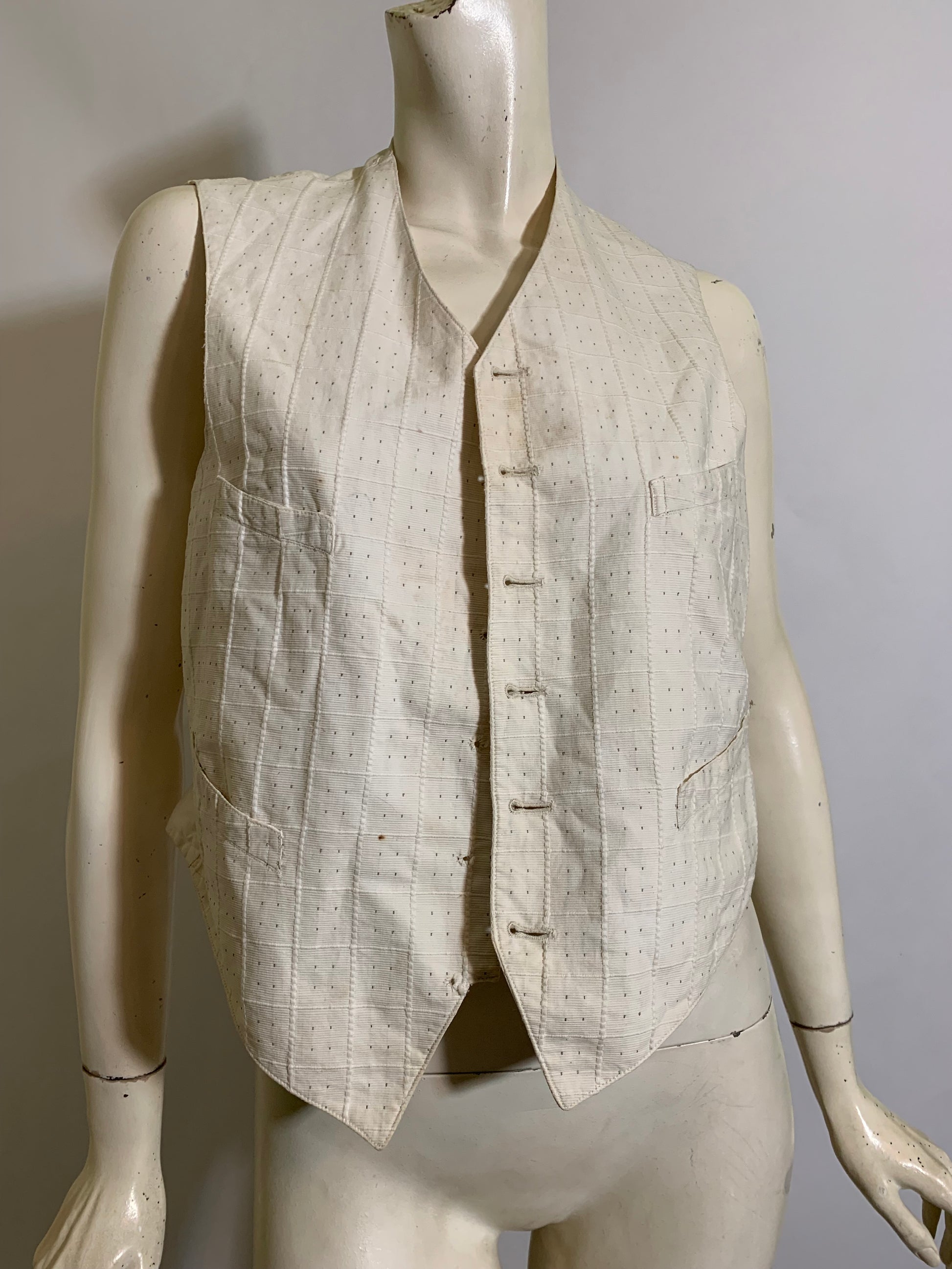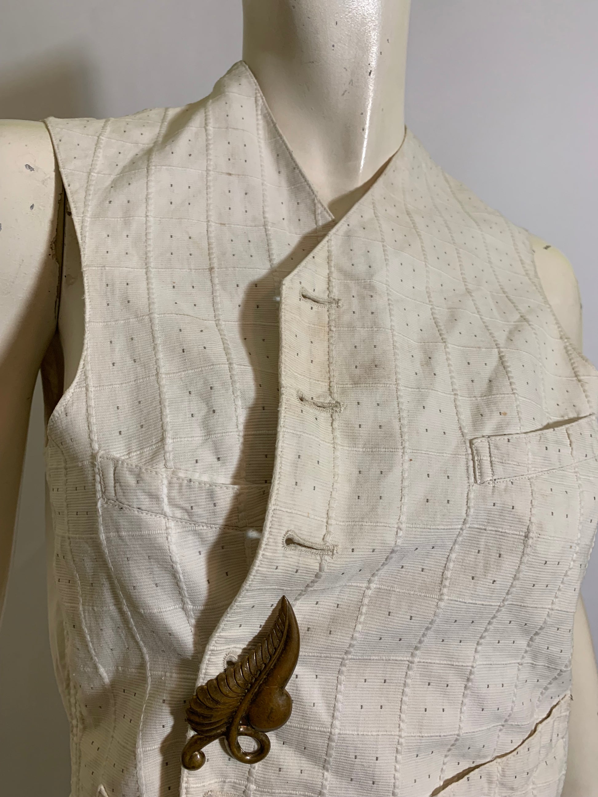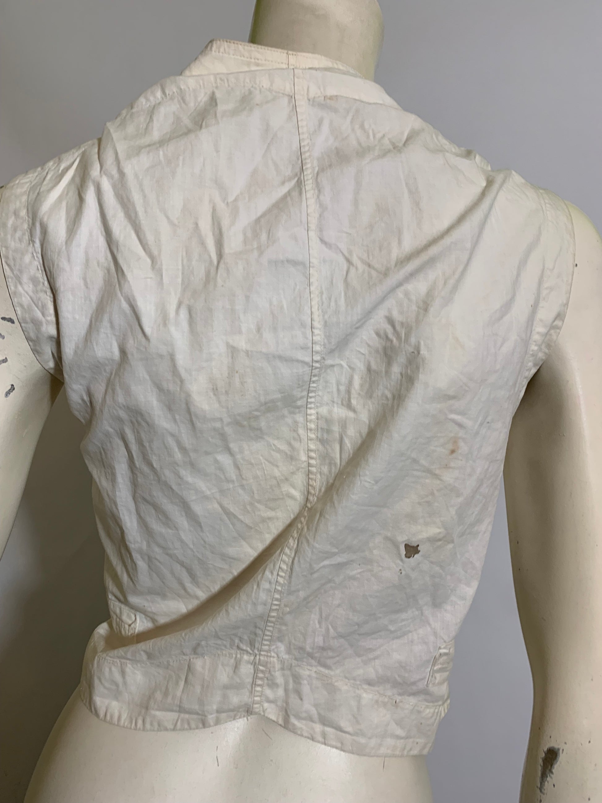 White cotton early 1900s waist coat/vest. Needs stud buttons. Has a few spots as shown. Jewelry not included.