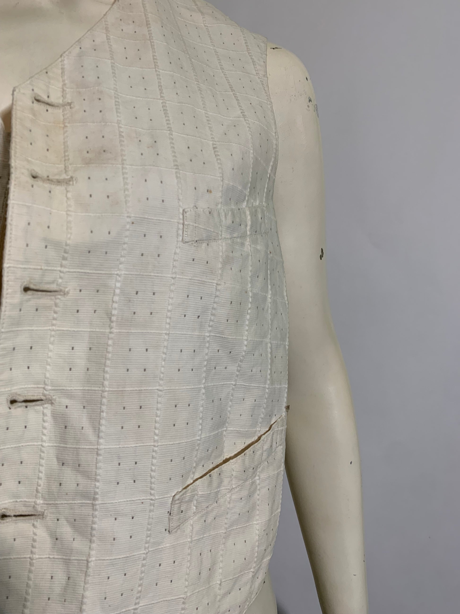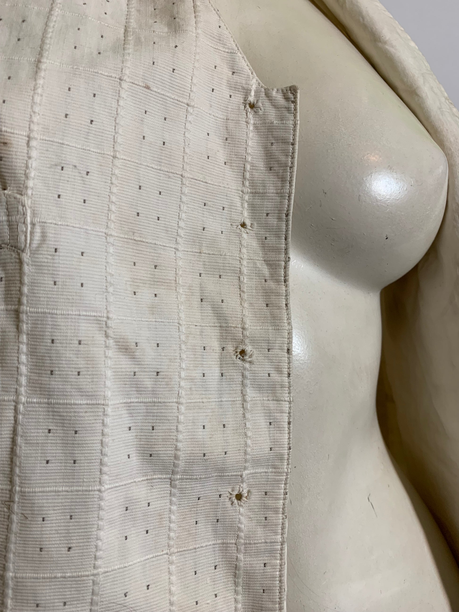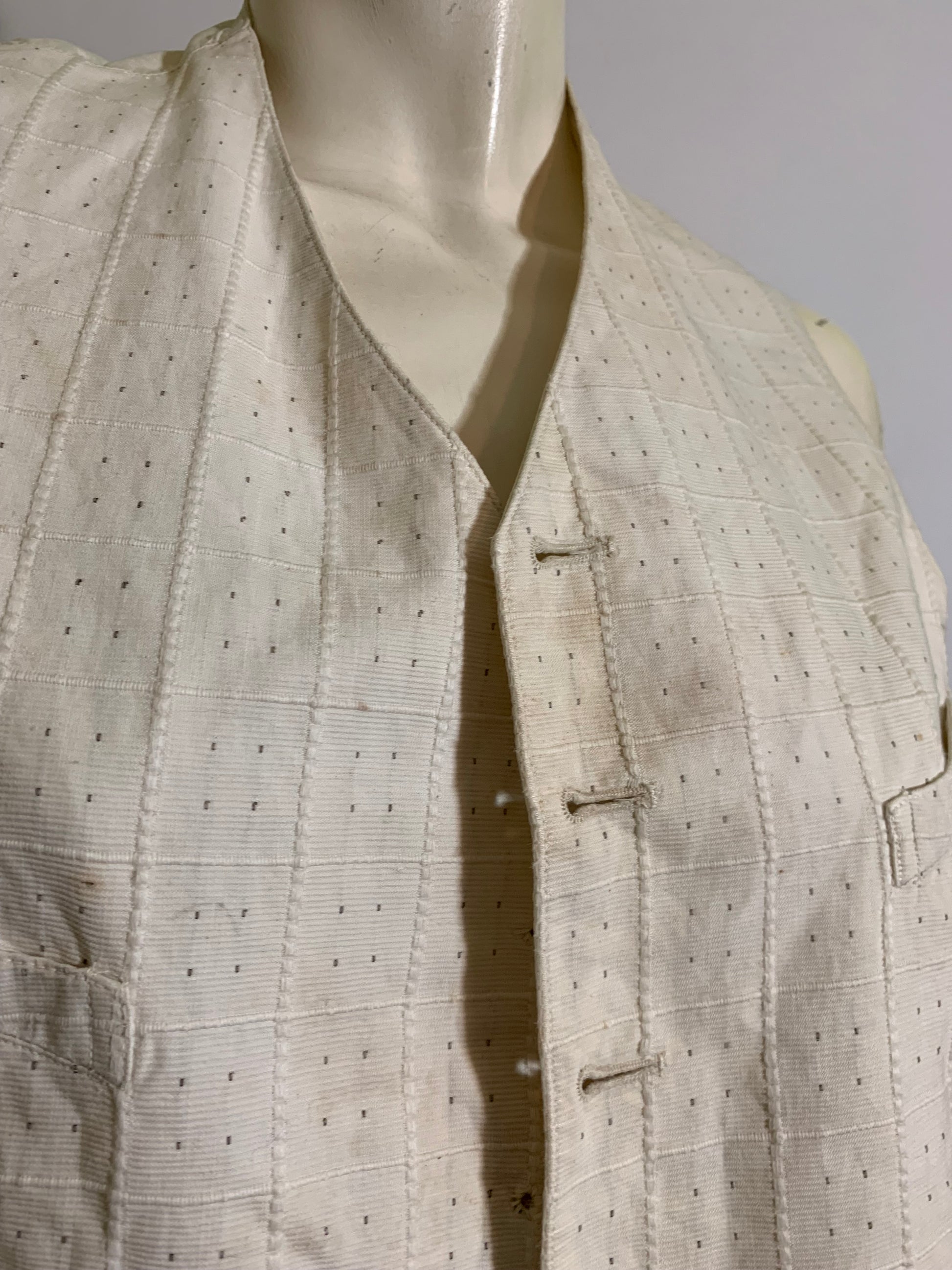 White cotton early 1900s waist coat/vest. Needs stud buttons. Has a few spots as shown. Jewelry not included.