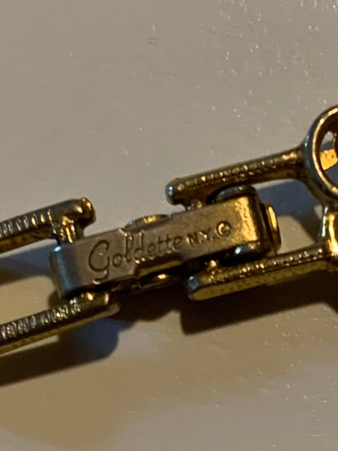 Goldette jewellery is invariably well made and beautifully designed. The company, founded in 1955 and closed in 1978, favoured Victorian and Edwardian Revival designs, with lots of chains and glass cameos and bezel set glass stations. The "Goldette NY" mark was used only until 1958, according to sources, helping to date this piece at pre-1960.