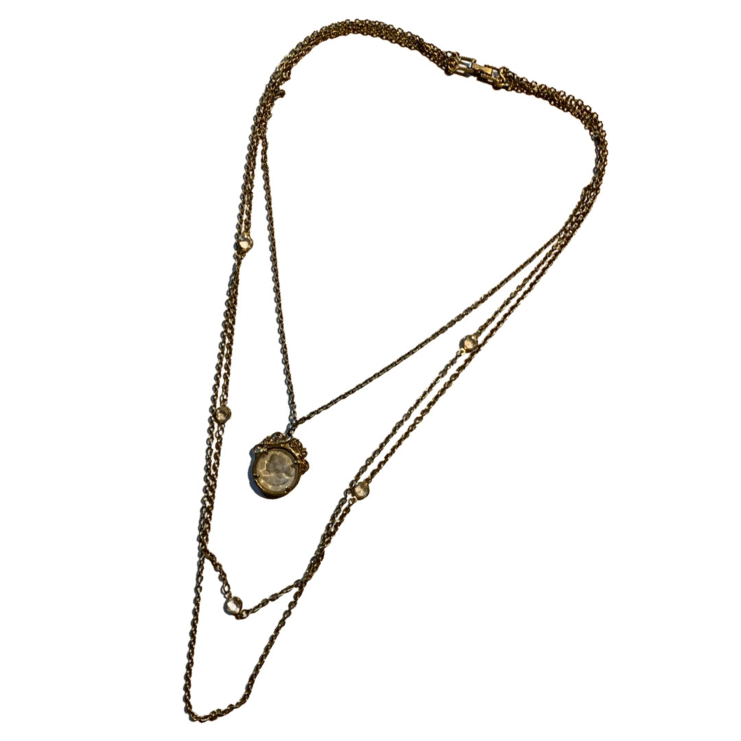 1950s gold tone metal triple chain necklace with clear crystal accents and a woman's portrait pendant in intaglio design by Goldette of NY.