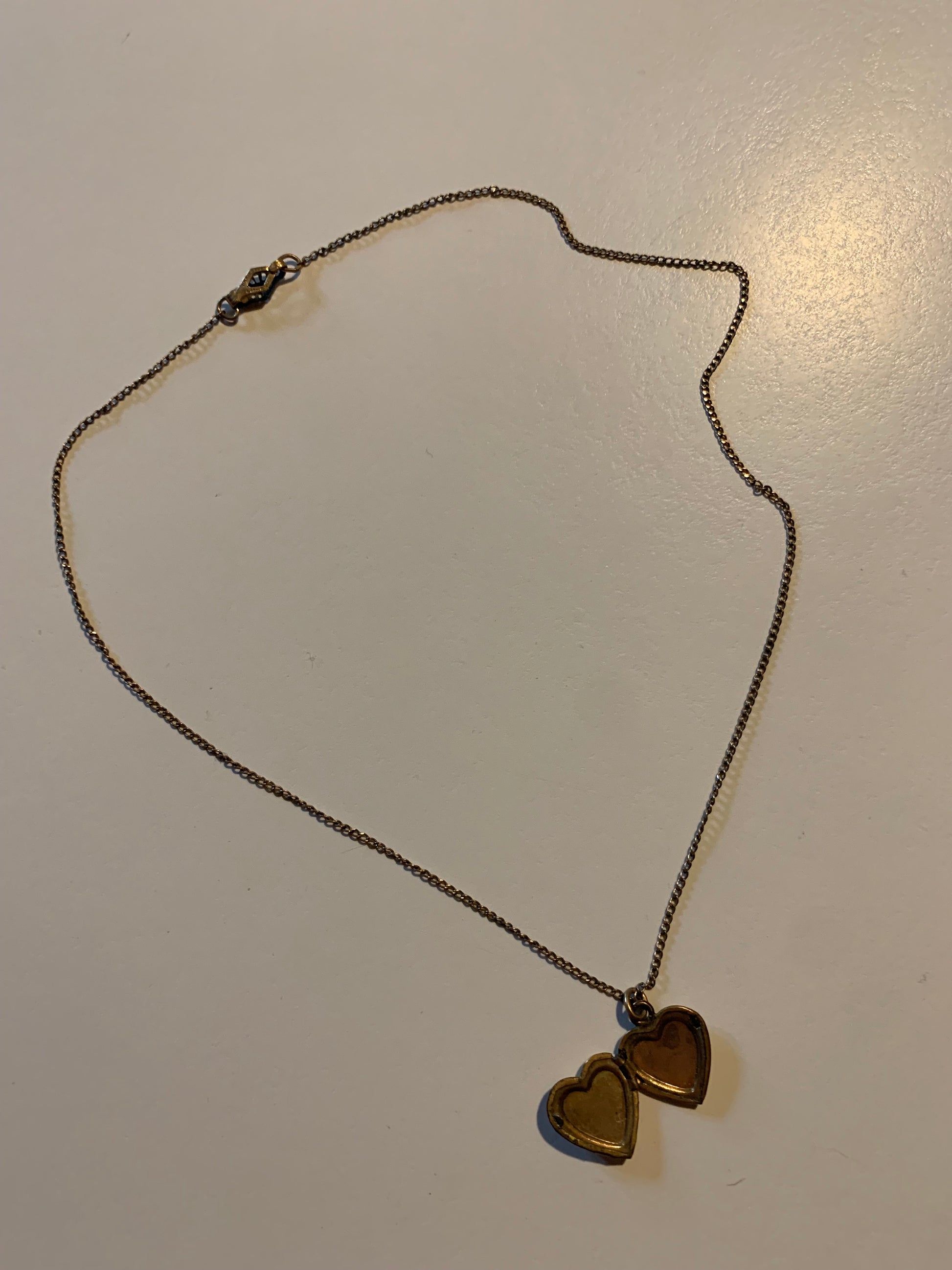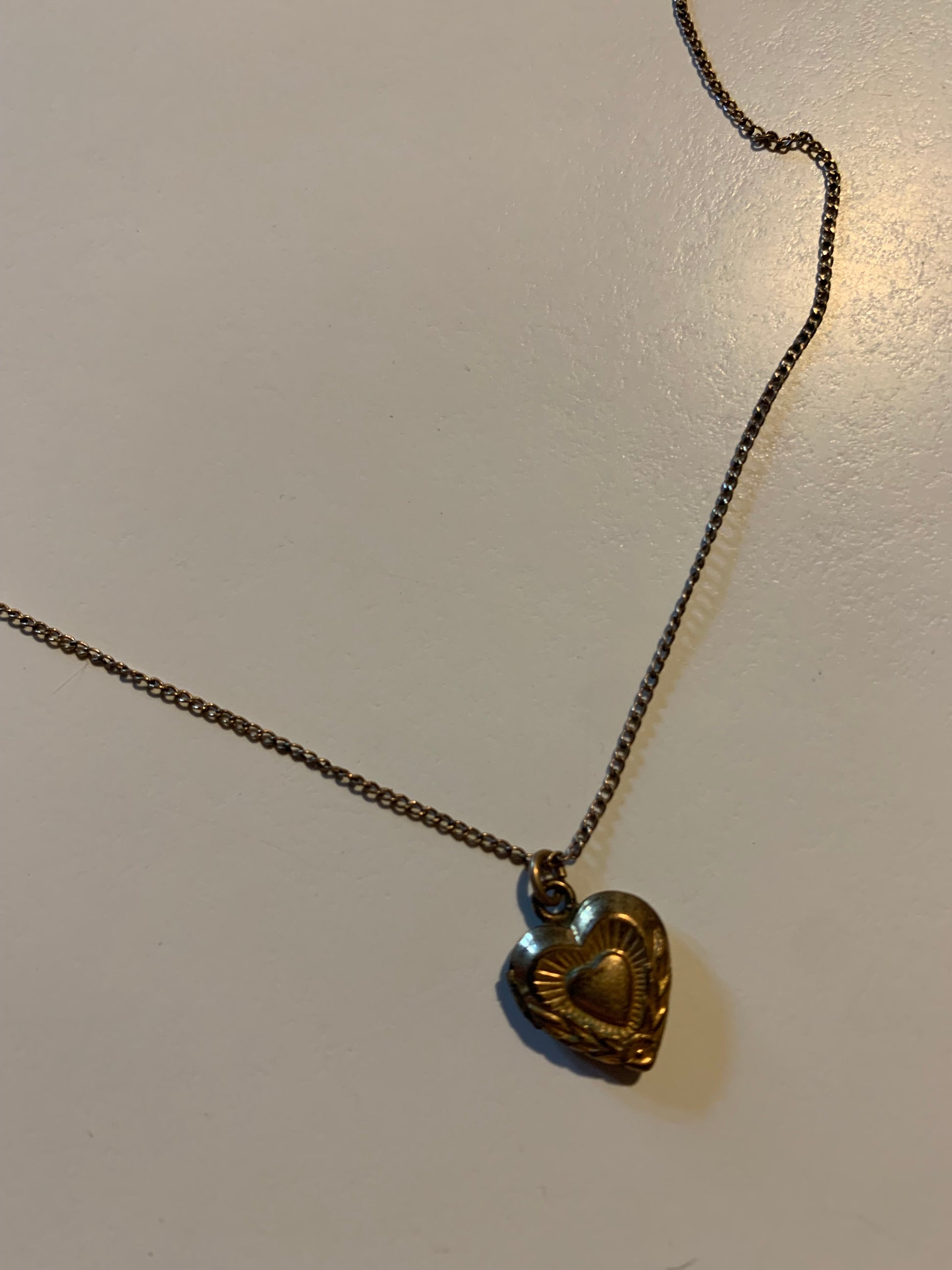 Fine gold chain with etched heart locket- likely for a young girl. Unmarked, no flaws.